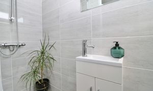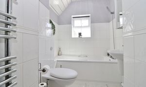 The family bathroom has been fitted with a modern suite including a panel enclosed bath with shower attachment over.