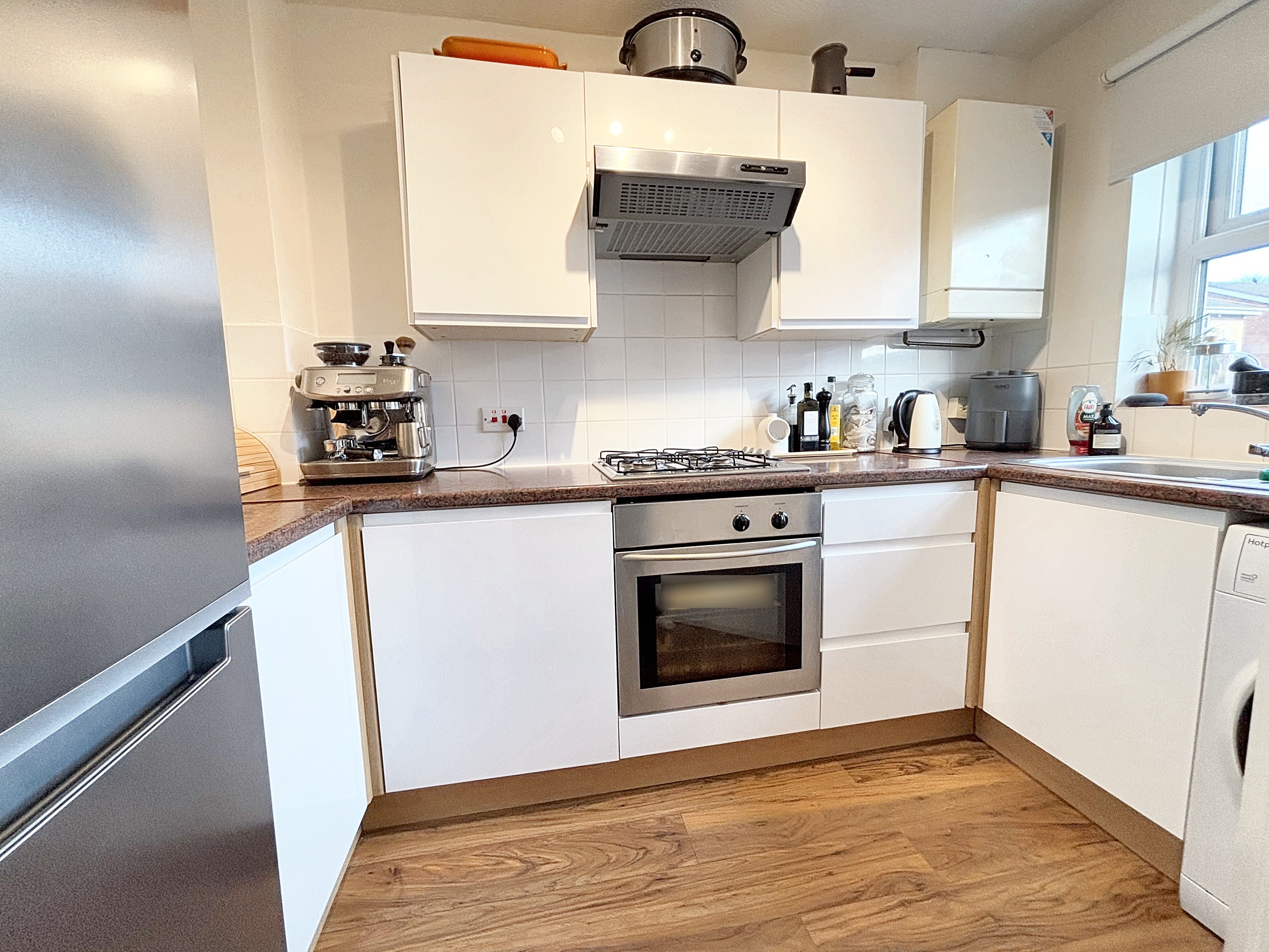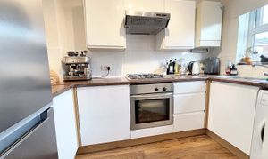 Window to the front elevation. Fitted with a range of modern wall and base units with integrated oven, hob and extractor with space for a free standing fridge freezer and plumbing for a washing machine.
