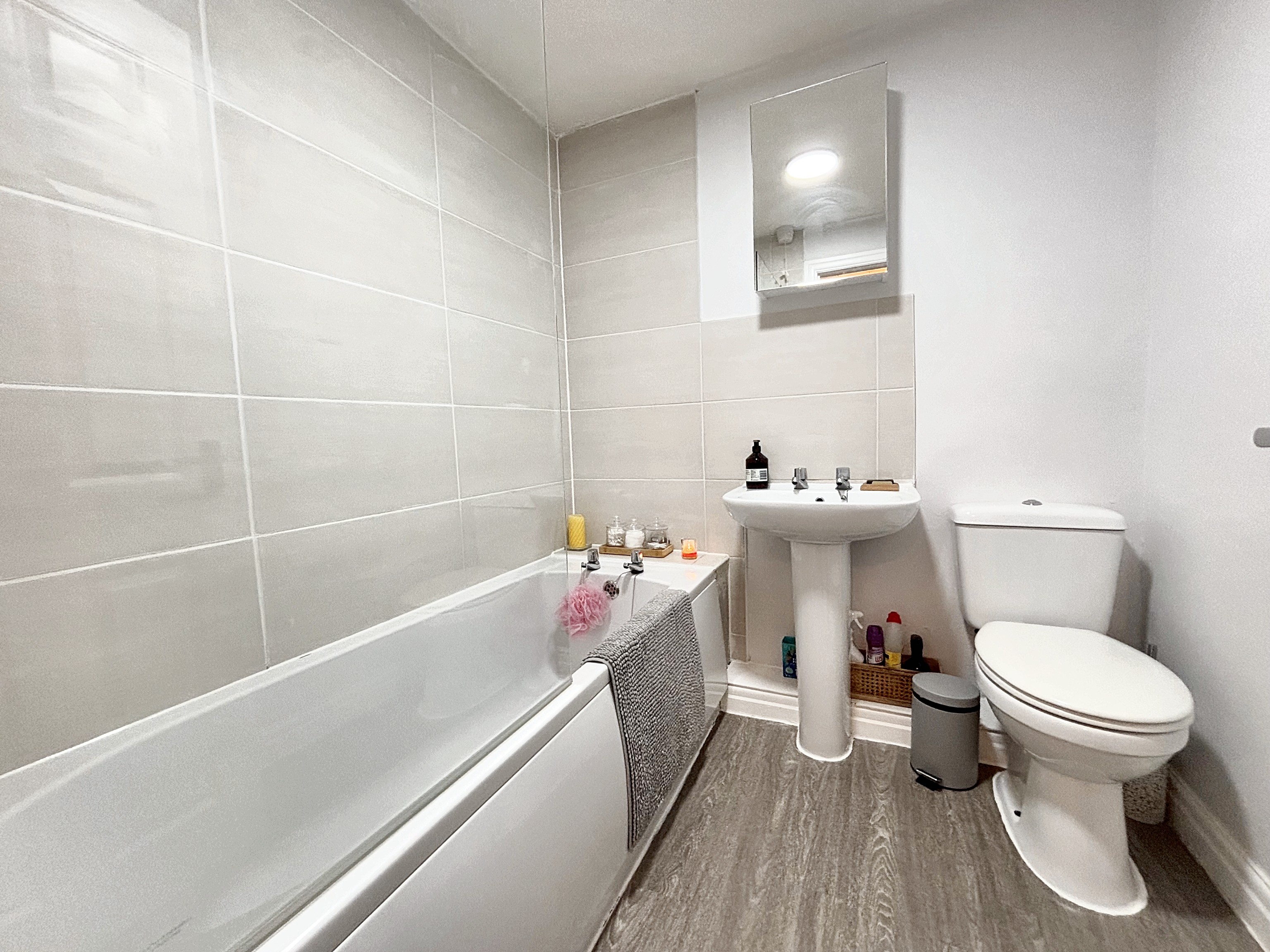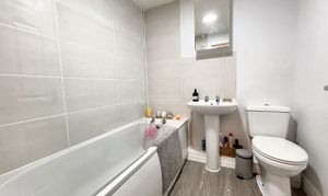 Fitted with a low level WC, pedestal hand wash basin and a bath with a shower over. Part tiled walls.