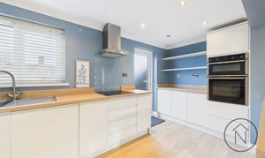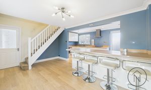 The ground floor accommodation includes a modern, spacious open-plan kitchen/dining area and a separate lounge featuring French doors leading out to the rear garden, along with a decorative electric fire and surround. To the first floor, there is a well-proportioned main bedroom, two further bedrooms, and a family bathroom.