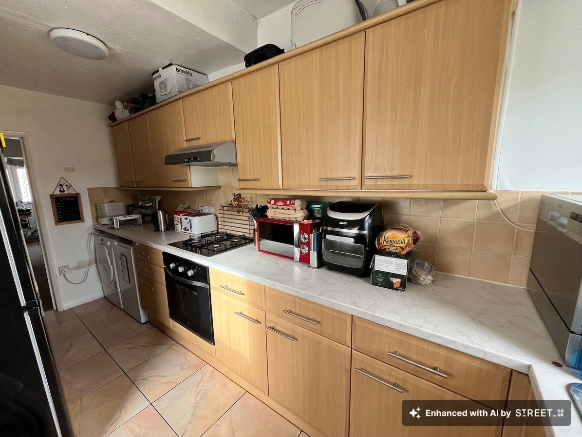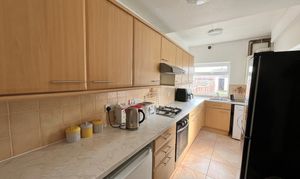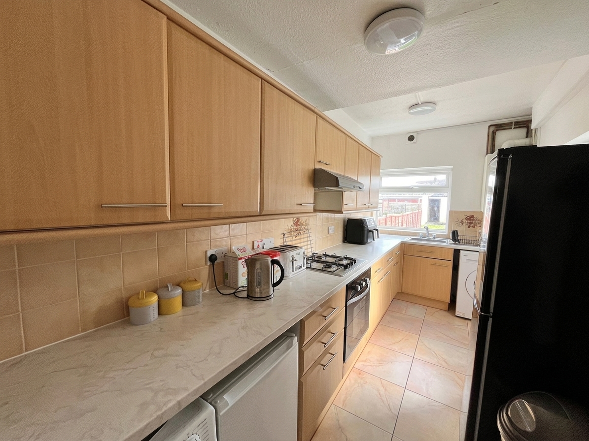 Double glazed window to rear overlooking garden. Comprising a range of wall and base units with work surfaces and part tiled walls. Inset stainless steel sink unit. Built in oven and gas hob with cooker hood over. Space for washing machine. Space for fridge freezer. Double glazed door to Garden. Tiled floor. Radiator.