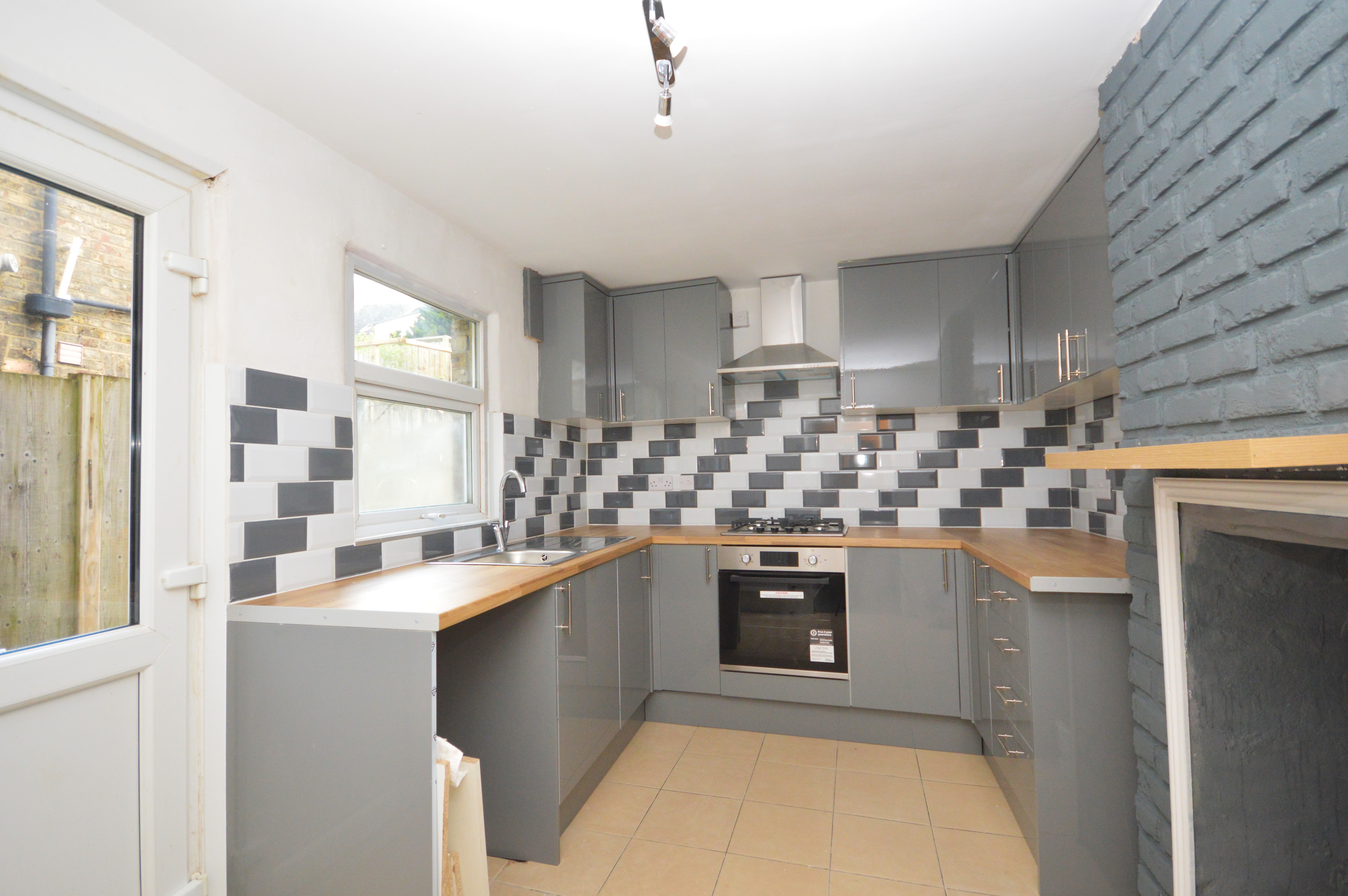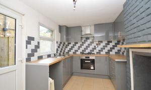UPVC double glazed patio door out to the garden with a separate UPVC double glazed window to the side. Newly fitted kitchen with matching wall and base units in high gloss grey. Stainless steel sink, fan oven, gas hob with extractor fan. Space for freestanding fridge freezer and a washing machine. Tiled flooring part tiled walls and a radiator.