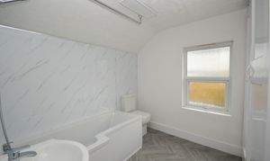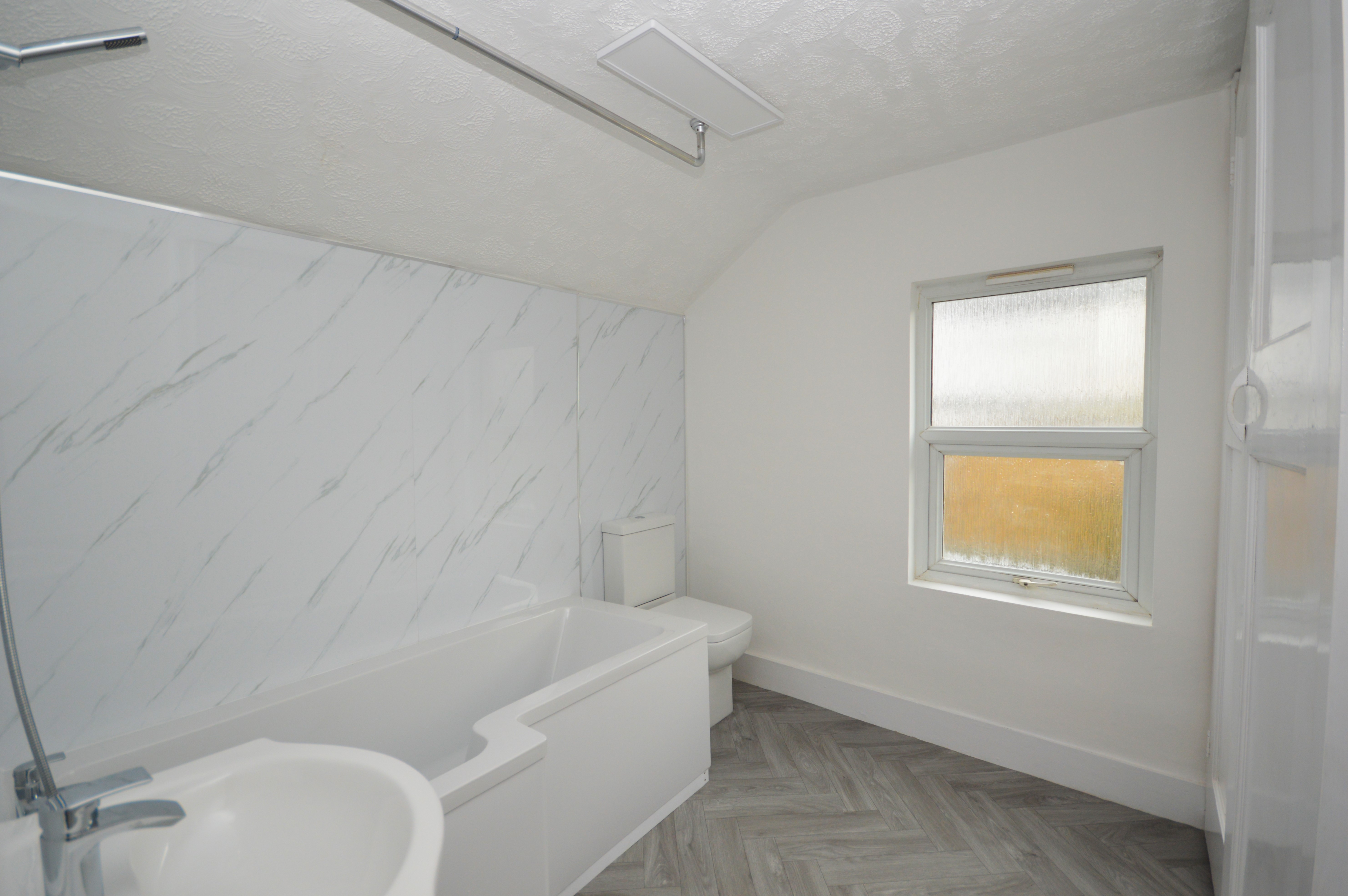 UPVC double glazed frosted window to the rear. Newly fitted bathroom with L-shaped bath with mixer taps to shower above. Vanity hand basin with storage underneath. Closed couple w/c, newly laid vinyl floor coverings, radiator and storage cupboard housing the boiler.