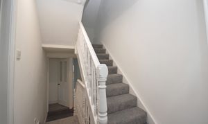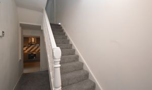UPVC double glazed frosted front door to the front of the property. Newly laid carpeted floor coverings. Stairs to first floor landing, radiator and storage space under stairs. Doors To :-