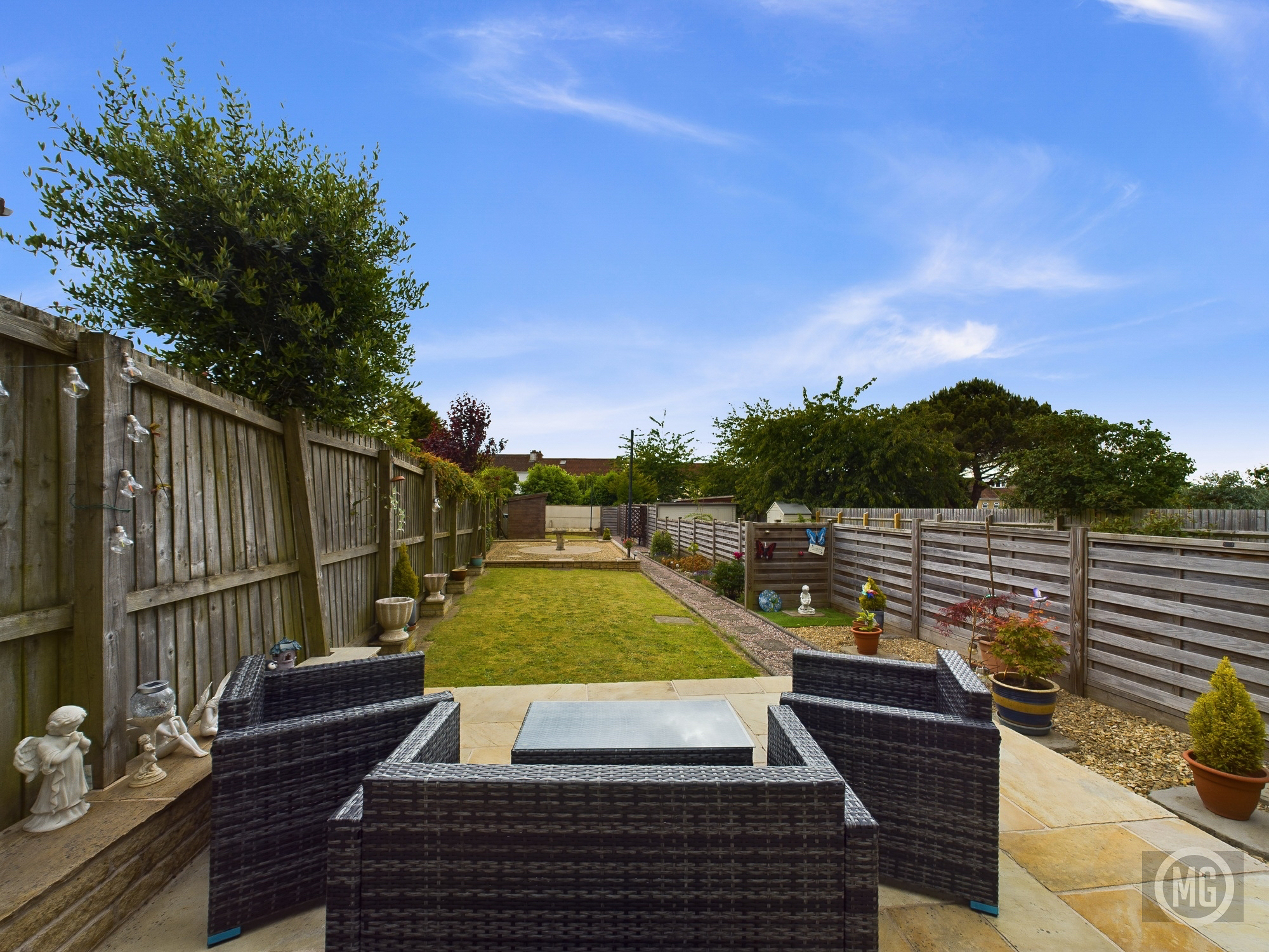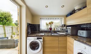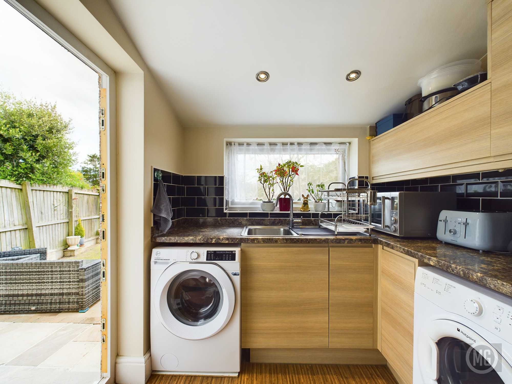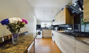Range of soft close wall and base units,carousel corner storage, deep pan drawers, space for freestanding fridge/freezer, integrated double electric oven, gas hob, overhead extractor, plumbing for washing machine, under counter space for tumble dryer, window with rear aspect, double glazed door leading to garden