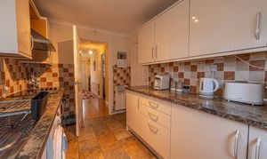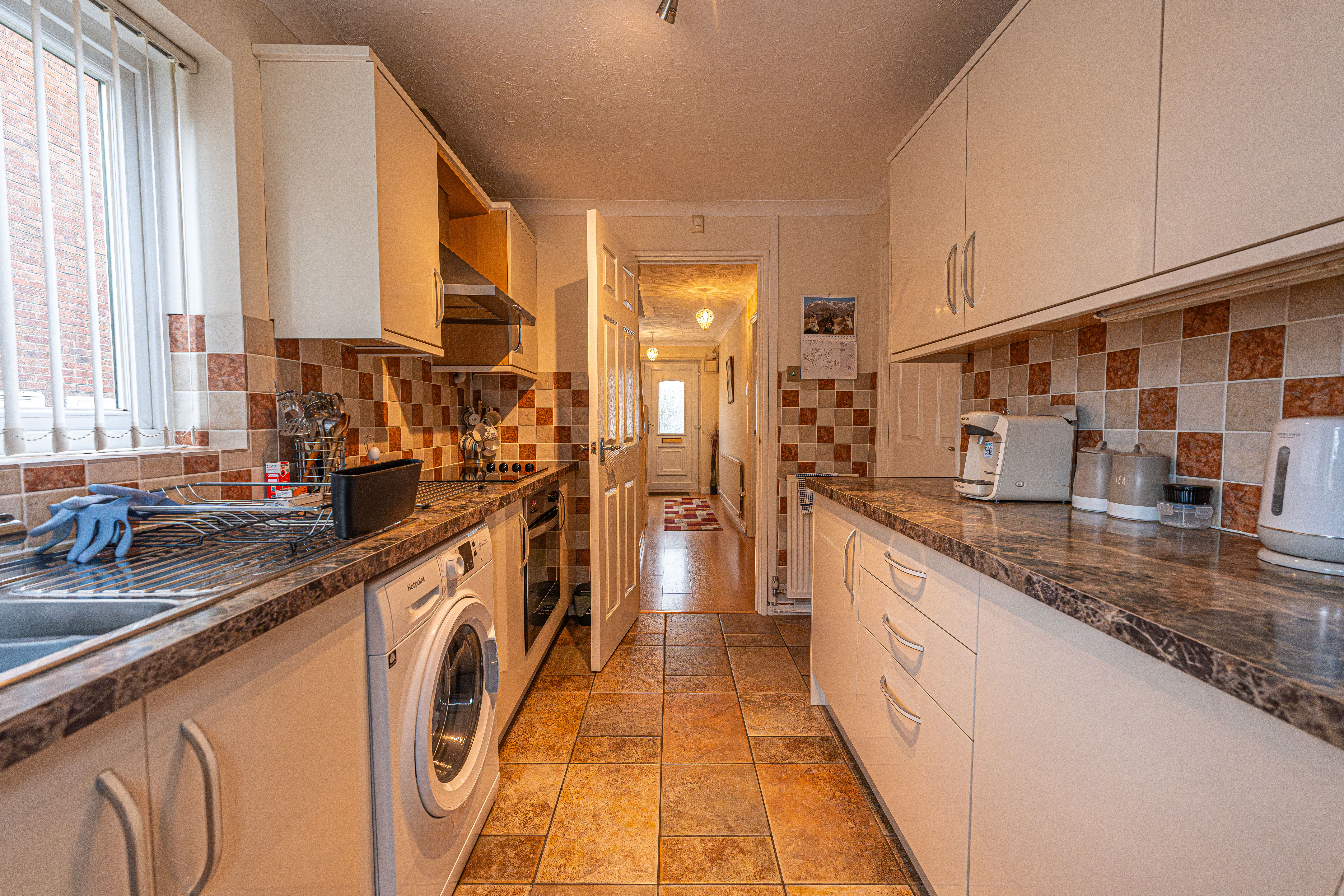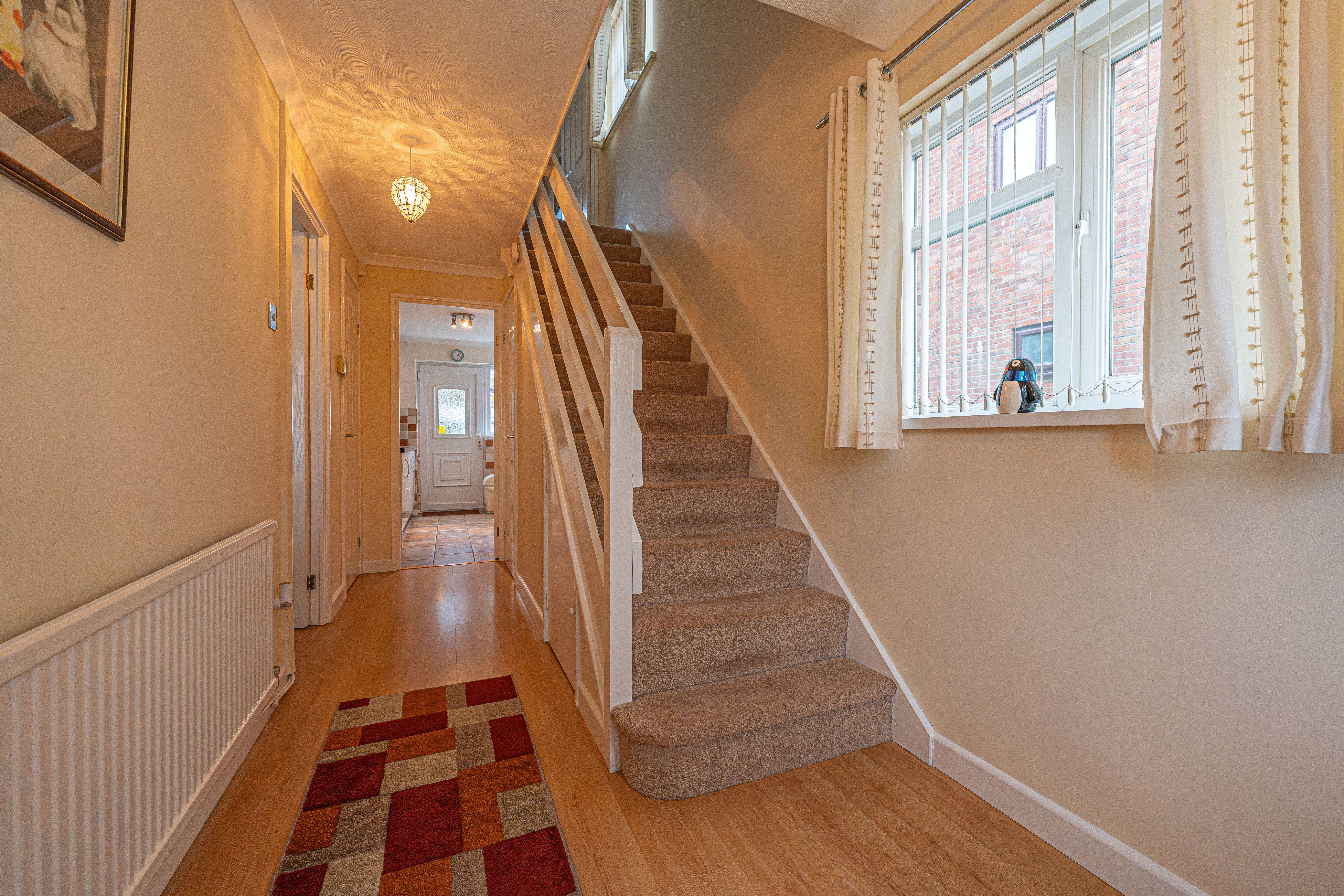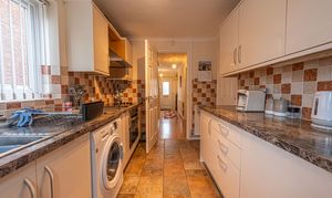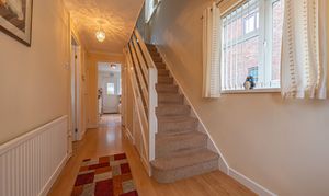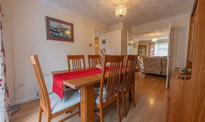 This well presented home welcomes us with a spacious living room to the front of the house, with glass doors that connect to the rear facing dining room, with both rooms enjoying a great amount of natural light, highlighting an ideal space for relaxing and entertaining. Also found at the rear of the house is the kitchen, showcasing a practical galley style design, with plenty of storage fixtures and room for appliances. Further storage is available with fitted cupboards in the hallway, where we can also find a helpful W.C under the staircase.