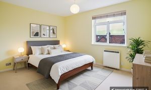 The bedroom is bright and airy, enhanced by a large window, neutral décor, and built-in storage with double doors, providing ample space for organisation and personalisation.
