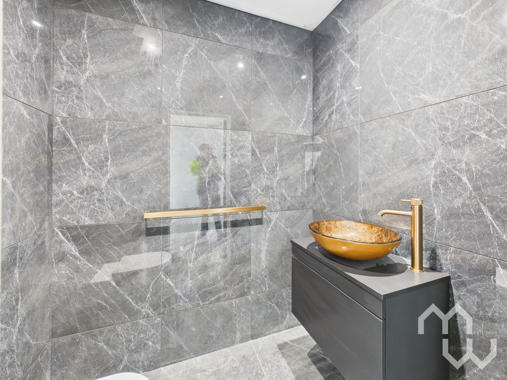 Beneath the stairs on the right, marbled porcelain tiles to the walls and floor create an air of opulence in the cloakroom, furnished with Villeroy and Boch wash basin and WC and trimmed in gold fittings.