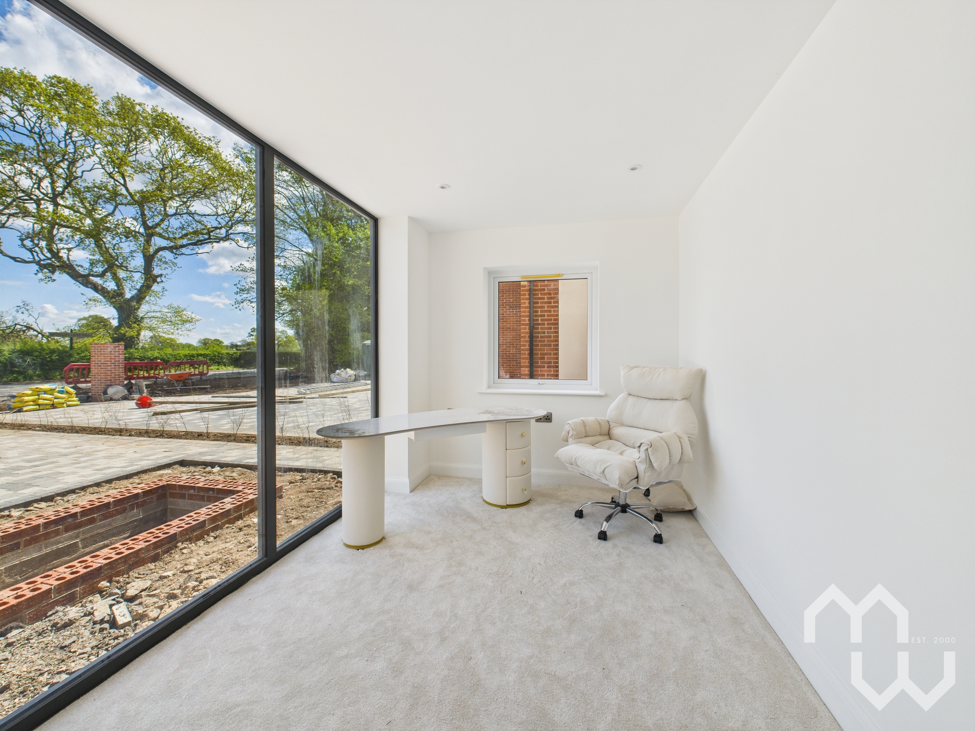 Stretch out on the porcelain patio, for effortless alfresco wining and dining. Beyond, the large lawn offers so much space for a game of tennis or five-aside, with top of the range drainage enabling all-year accessibility, while a floodlight at the back ensures the garden remains bathed in light long after dark, creating an inviting atmosphere for outdoor enjoyment at any time.