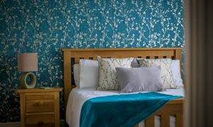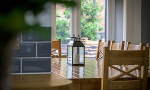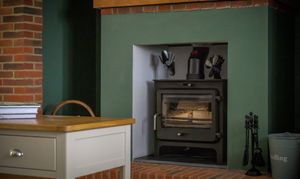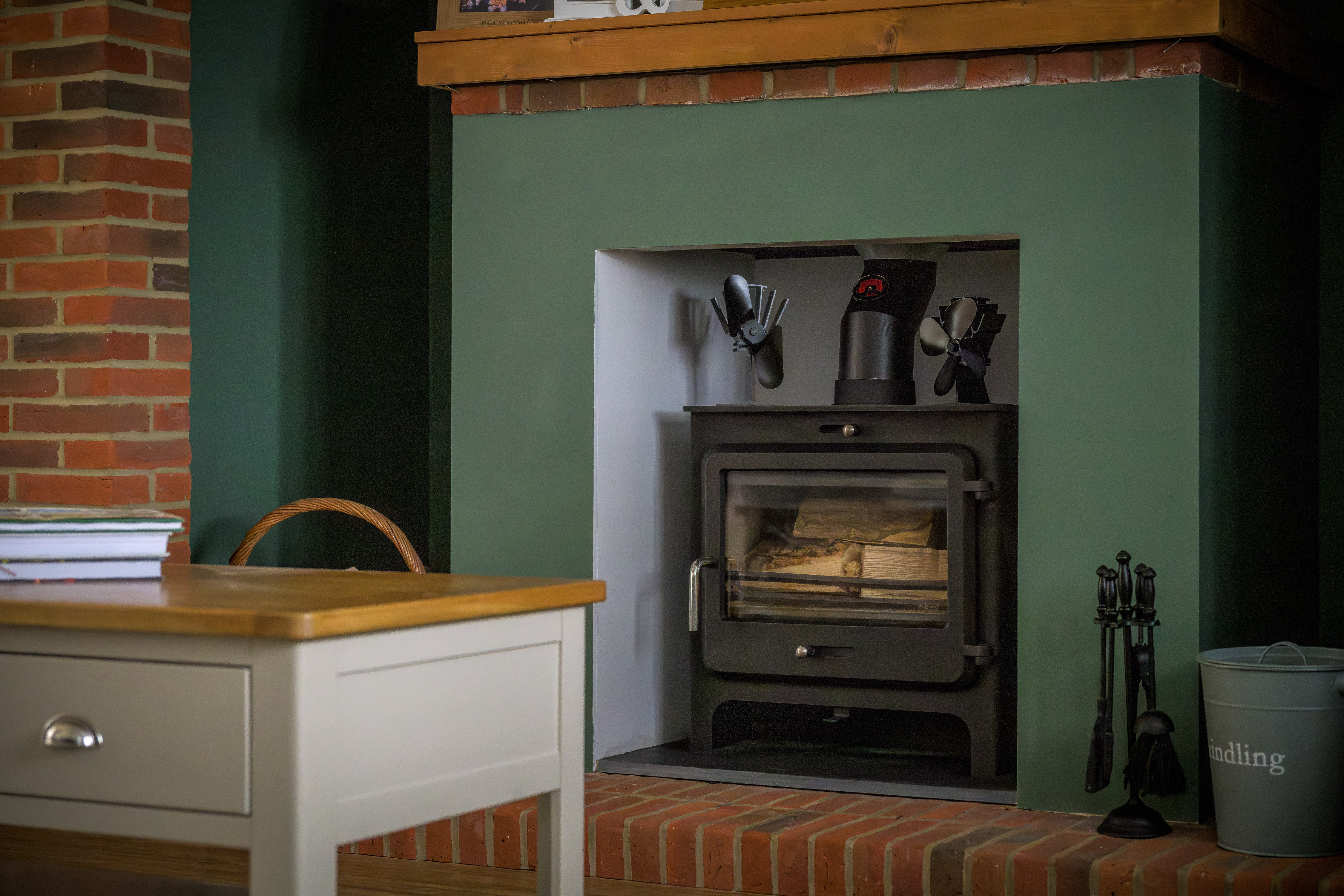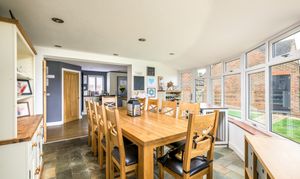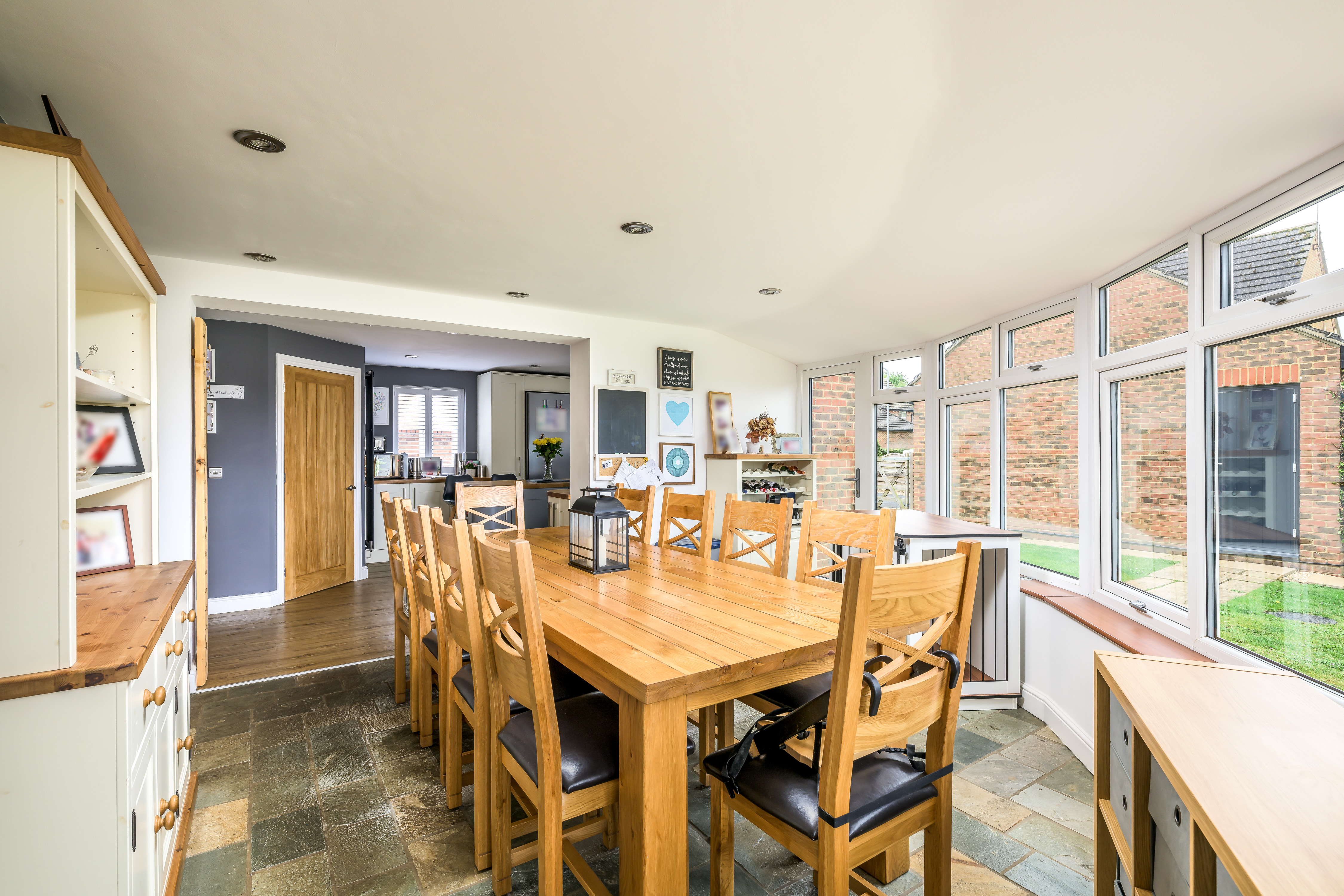 To the right of the hall is the lounge, which is especially suited for gathering as a family, sat around the inglenook fireplace with its log burner and exposed brick. There’s an opening leading from the lounge to the dining room connecting the two. The dining room was once a conservatory, but the owners have given it a rubber slate tiled roof to make it a much more useable space, still with surrounding windows for light, French doors for access onto the garden, and hardwearing slate flooring. Being between the lounge and the kitchen, this has created a central, spacious hub of the home, where everyone can be together without being under each other’s feet.