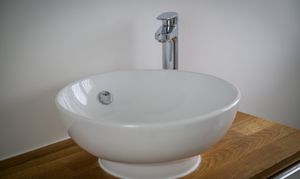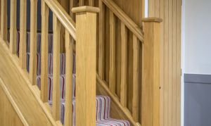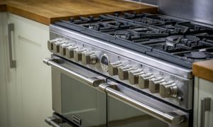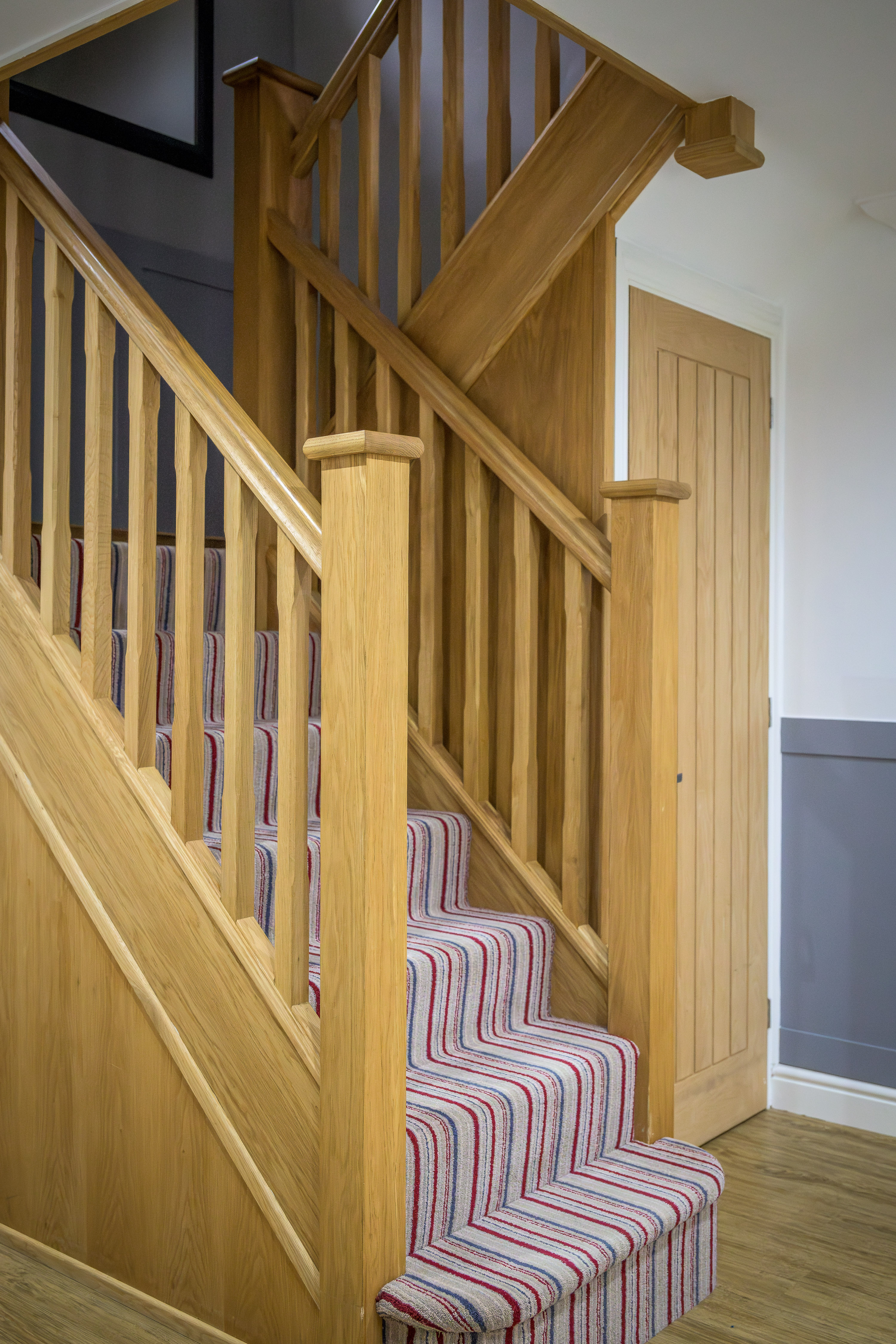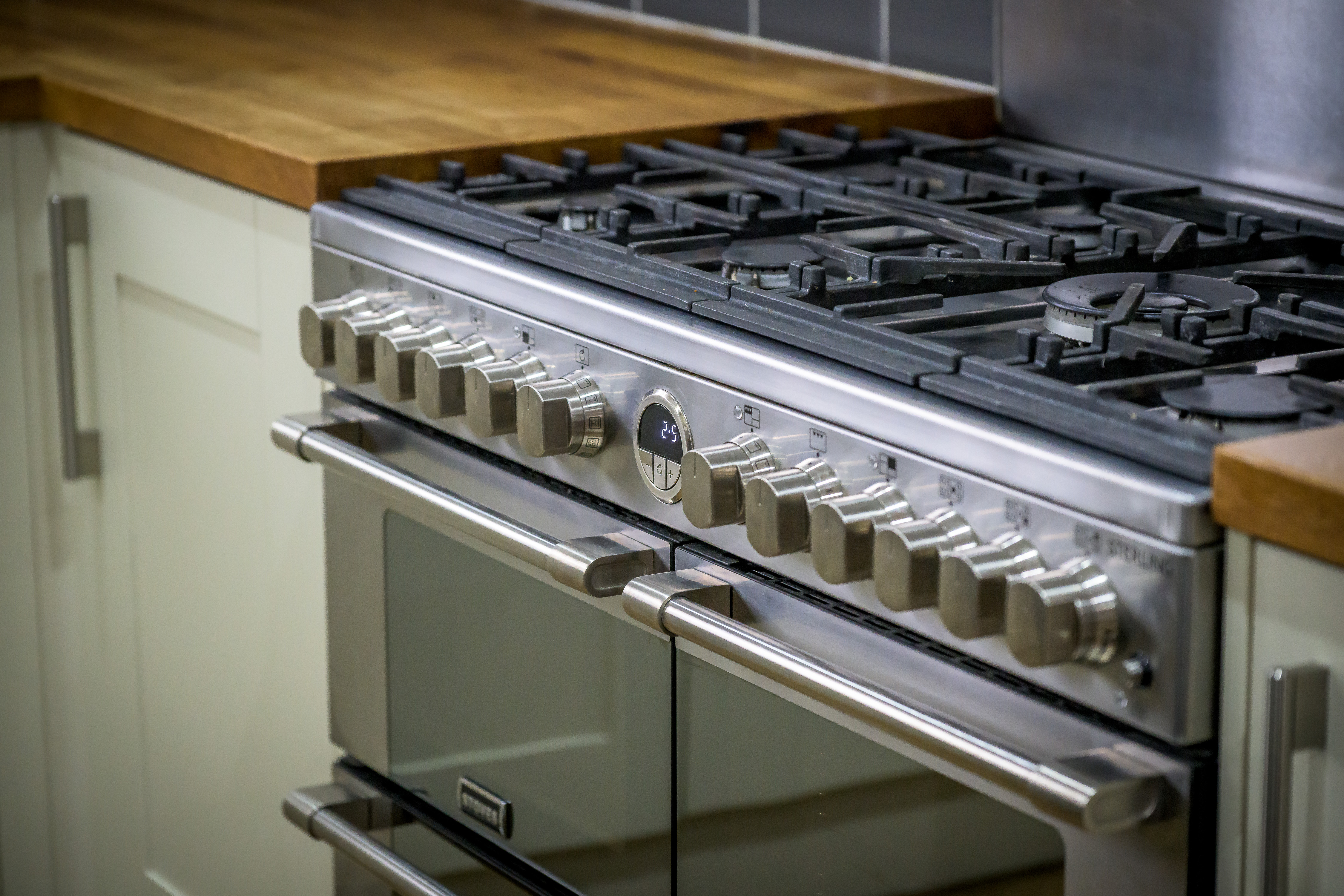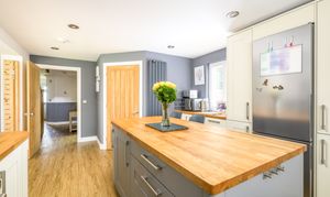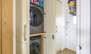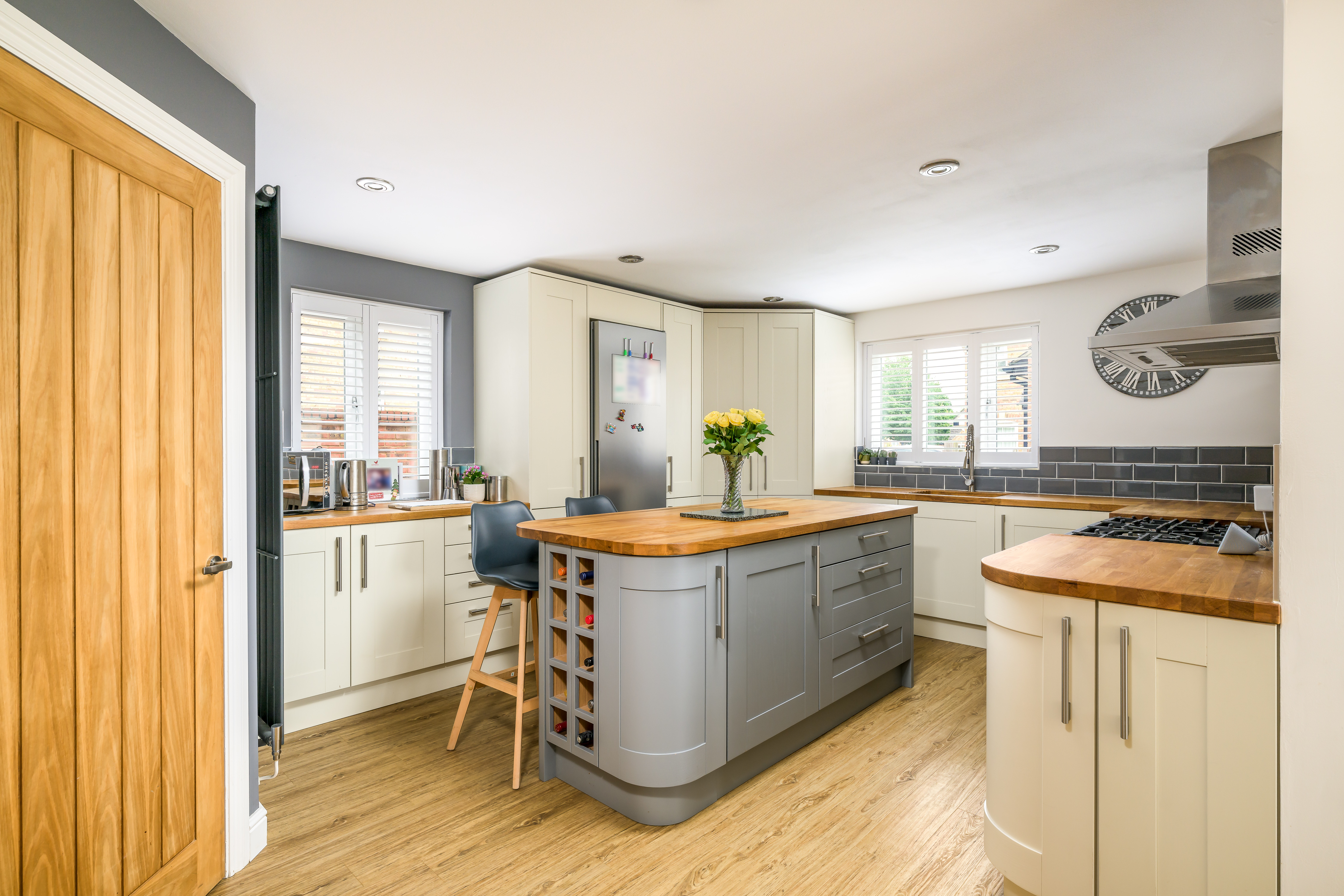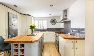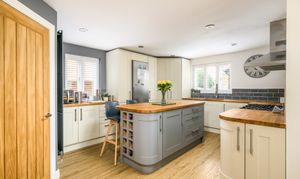 The kitchen is fitted in a timeless style, with Shaker cabinetry and solid oak surfaces, alongside a central island with bar seating. There are gaps for appliances such as a range cooker, an American fridge/freezer and a dishwasher, and there’s an underset stainless steel sink. The storage is varied, including a deep corner pantry cupboard and a pull-out bin drawer. The adjoining utility has further storage, space for further appliances, and a stable door to the side.