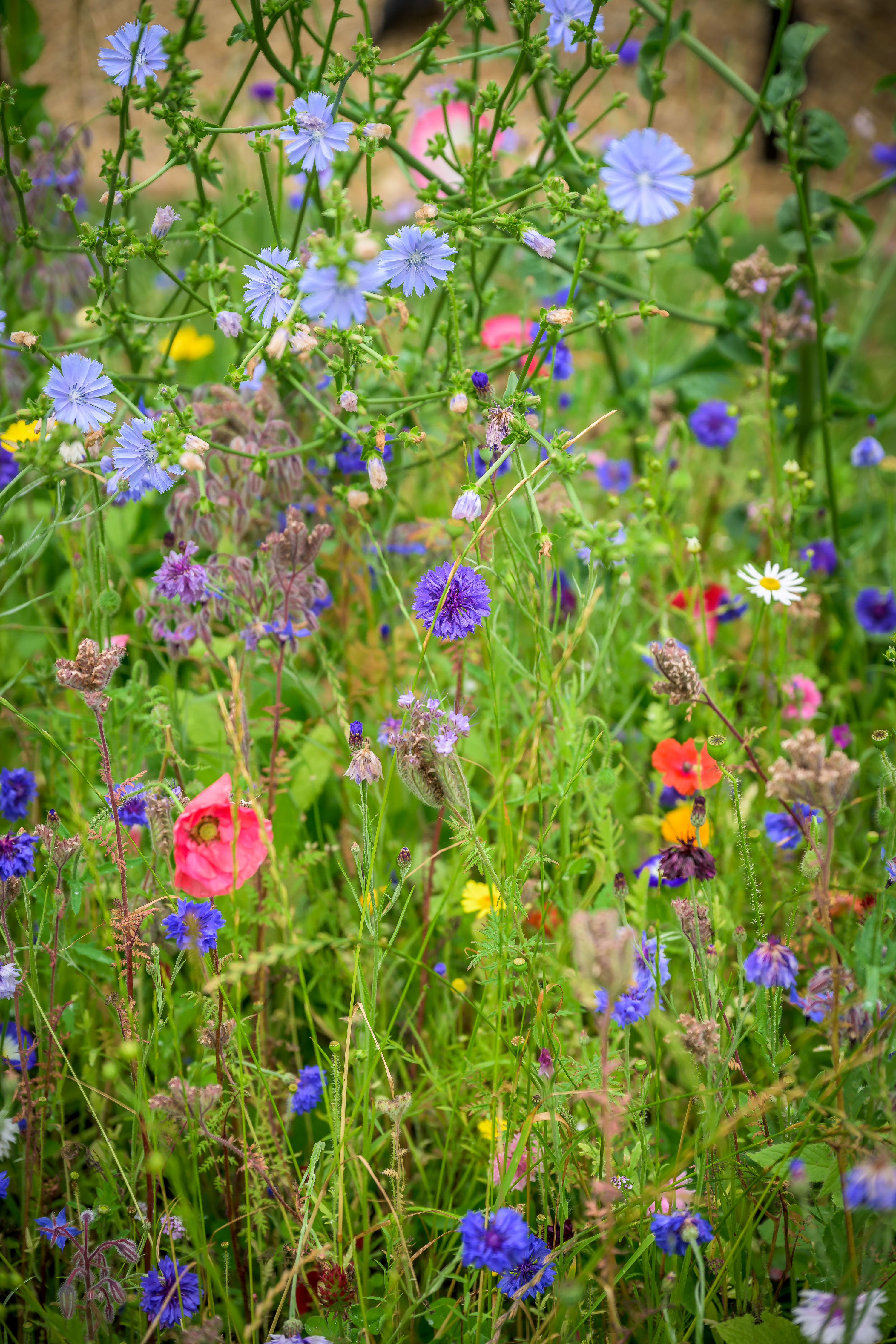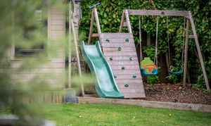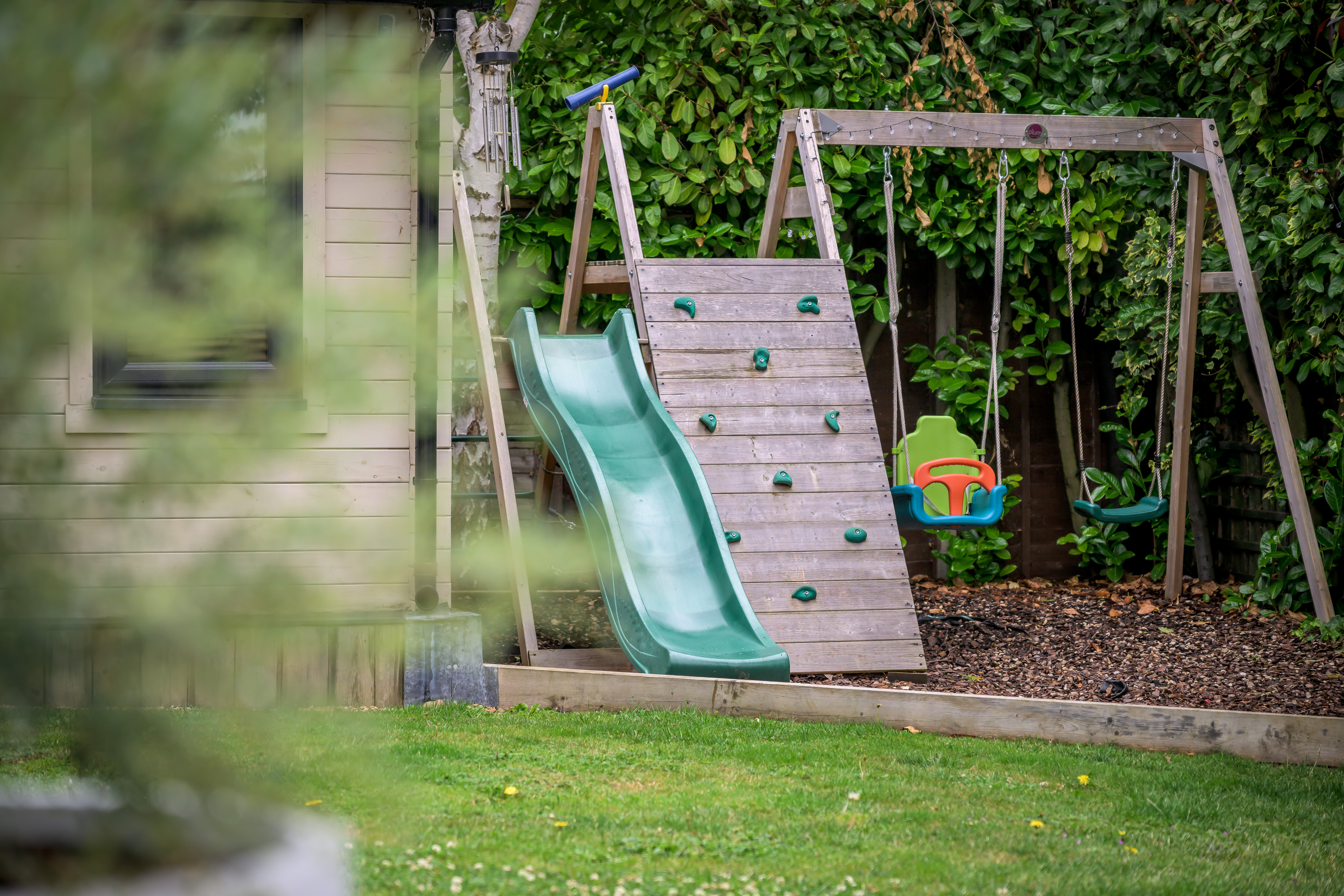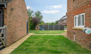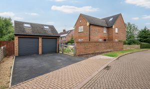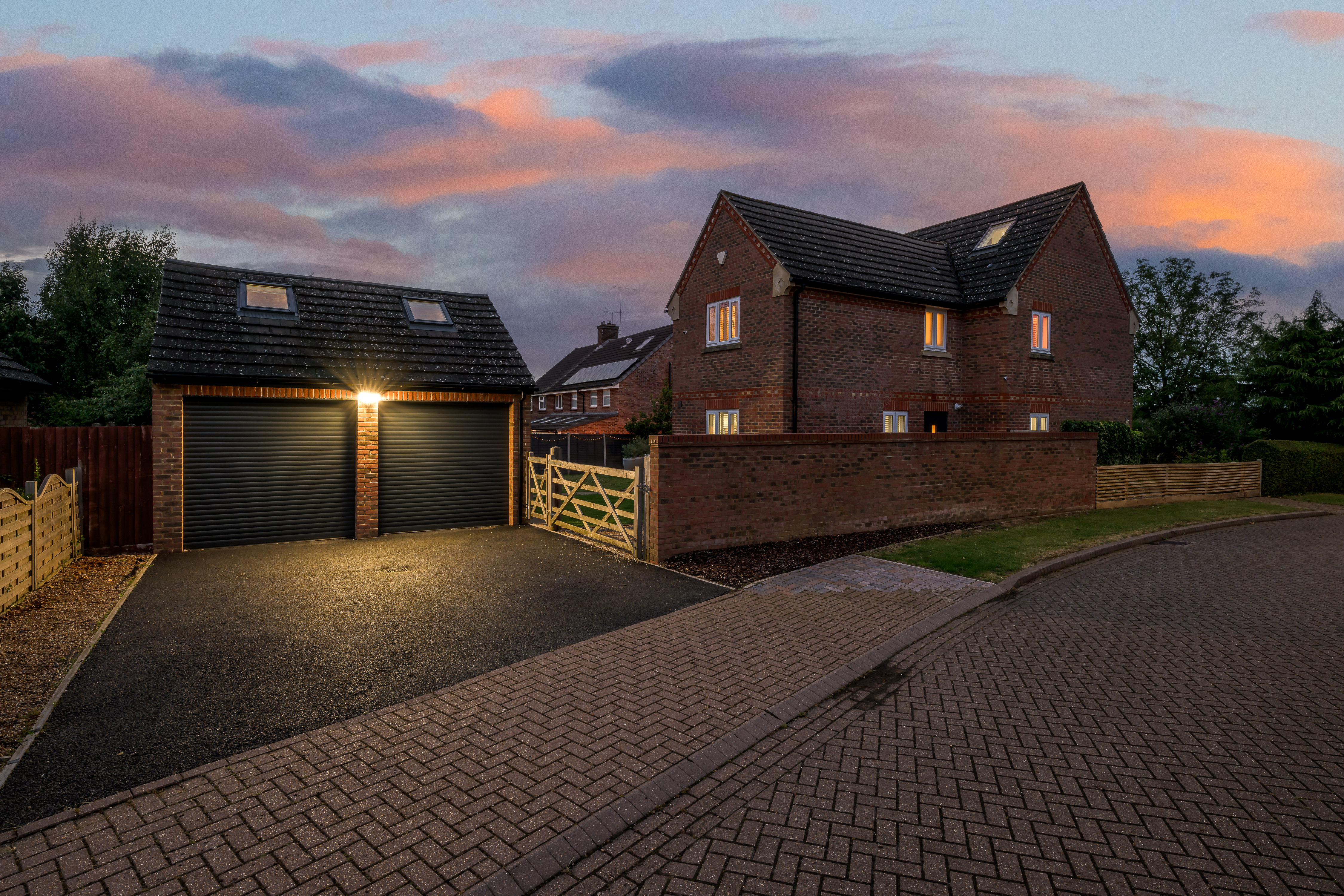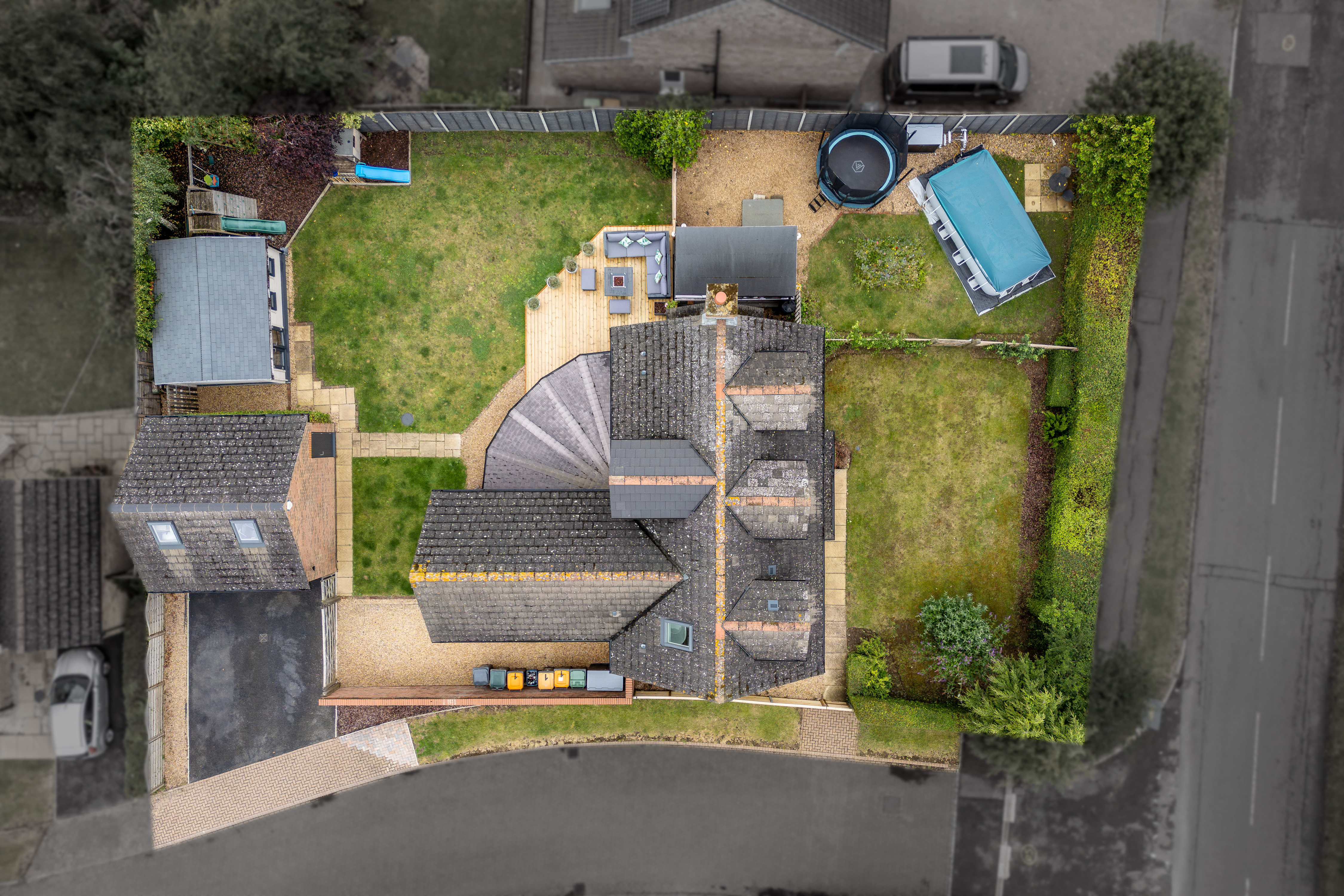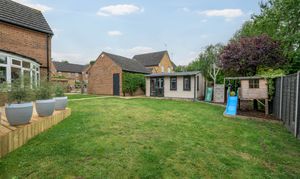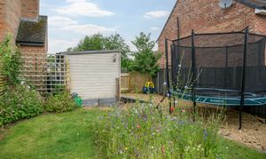 As for the outside, the plot here is a superb size, extending to approximately 0.2 acres and with gardens to three sides. The front garden is mostly lawned, with a pathway to the front door and storm porch, and gates to the driveway and the side garden. The driveway has space for two cars, leads to gravelling for overflow if needed, and the detached double garage for two more. The garage has a converted loft for storage, with stairs for access, and two Velux windows for light. Between the front and side gardens is a line of young apple trees, and there are other mature plants and trees throughout, including a patch of pretty wildflowers. The side garden is currently used as a play area, with capacity for a pool, a trampoline, and a sizeable shed to pack it all away in winter.