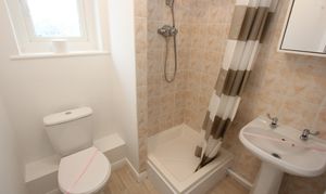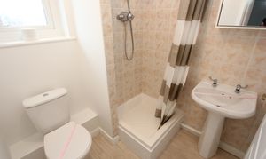 Shower enclosure. Wash hand basin. UPVC window. Low level WC.