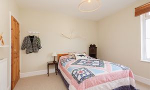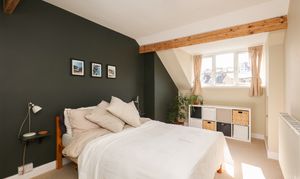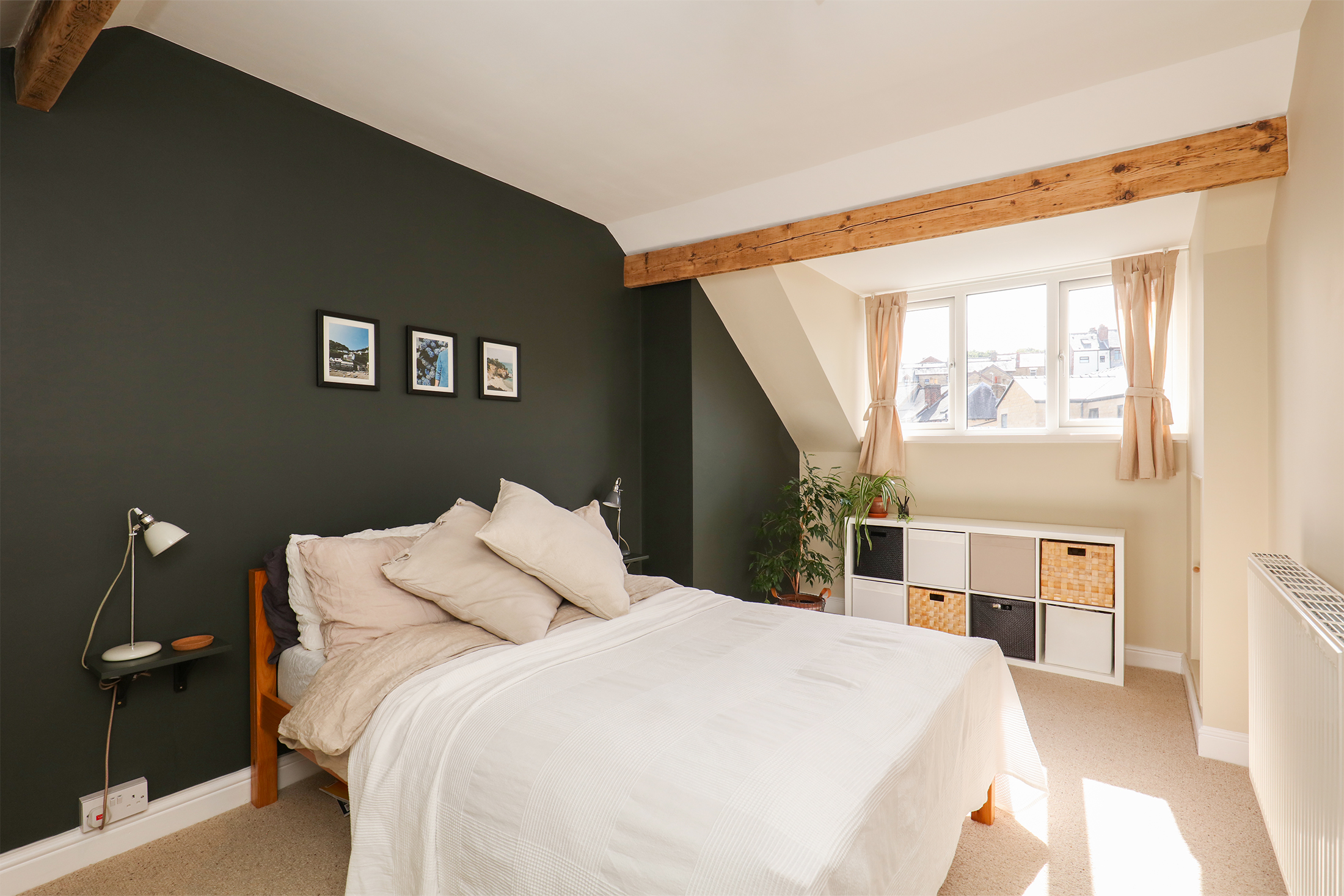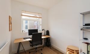 On the first floor are two bedrooms, including a generously proportioned front-facing double bedroom, filled with light and complemented by a walk-in closet. The bathroom features a modern 3-piece white suite. From the first-floor landing, stairs rise to a spacious second-floor double bedroom, bright and airy, complemented by a front Velux.