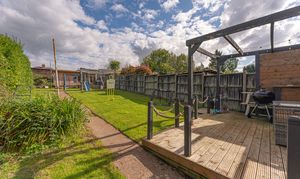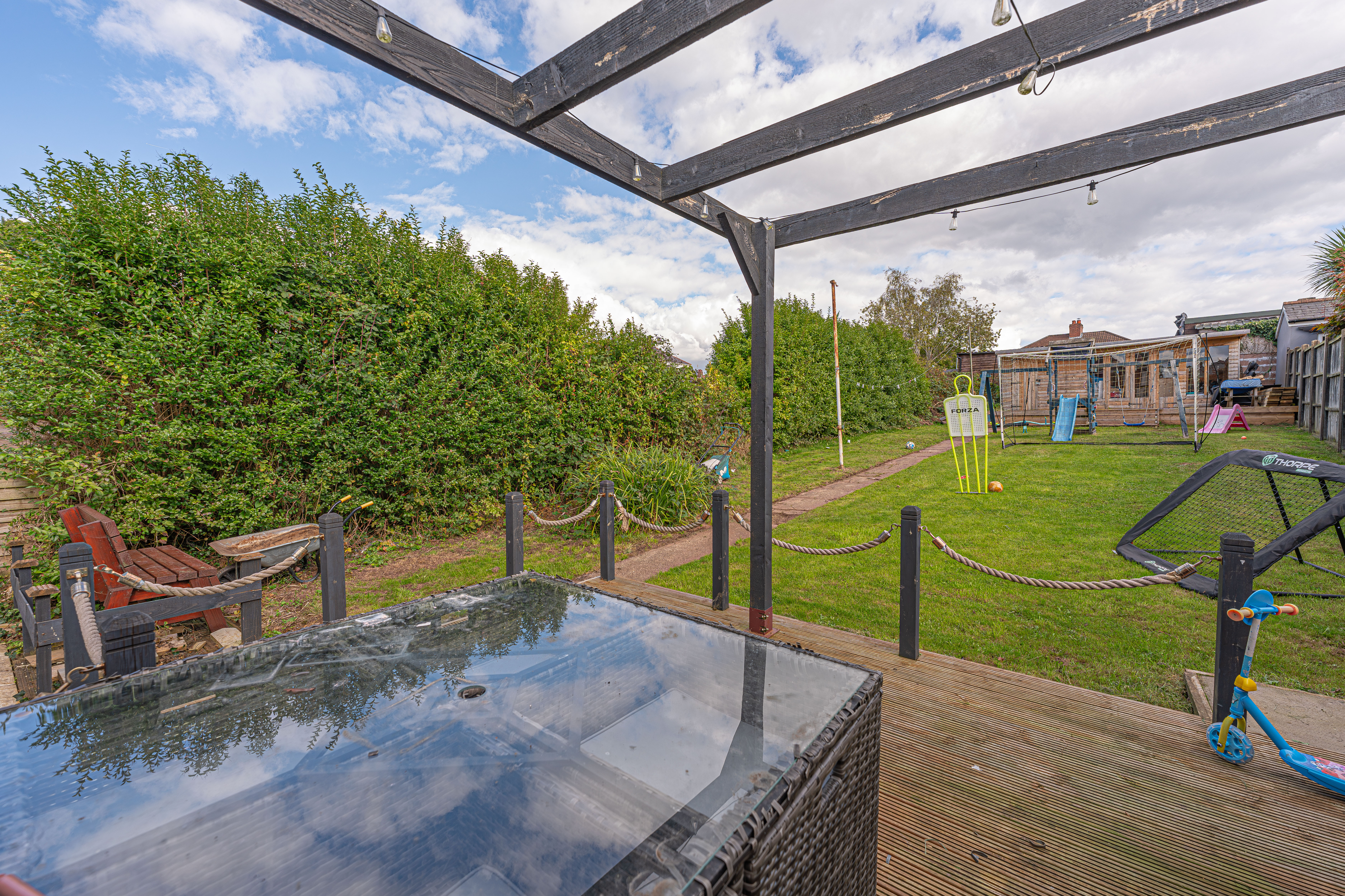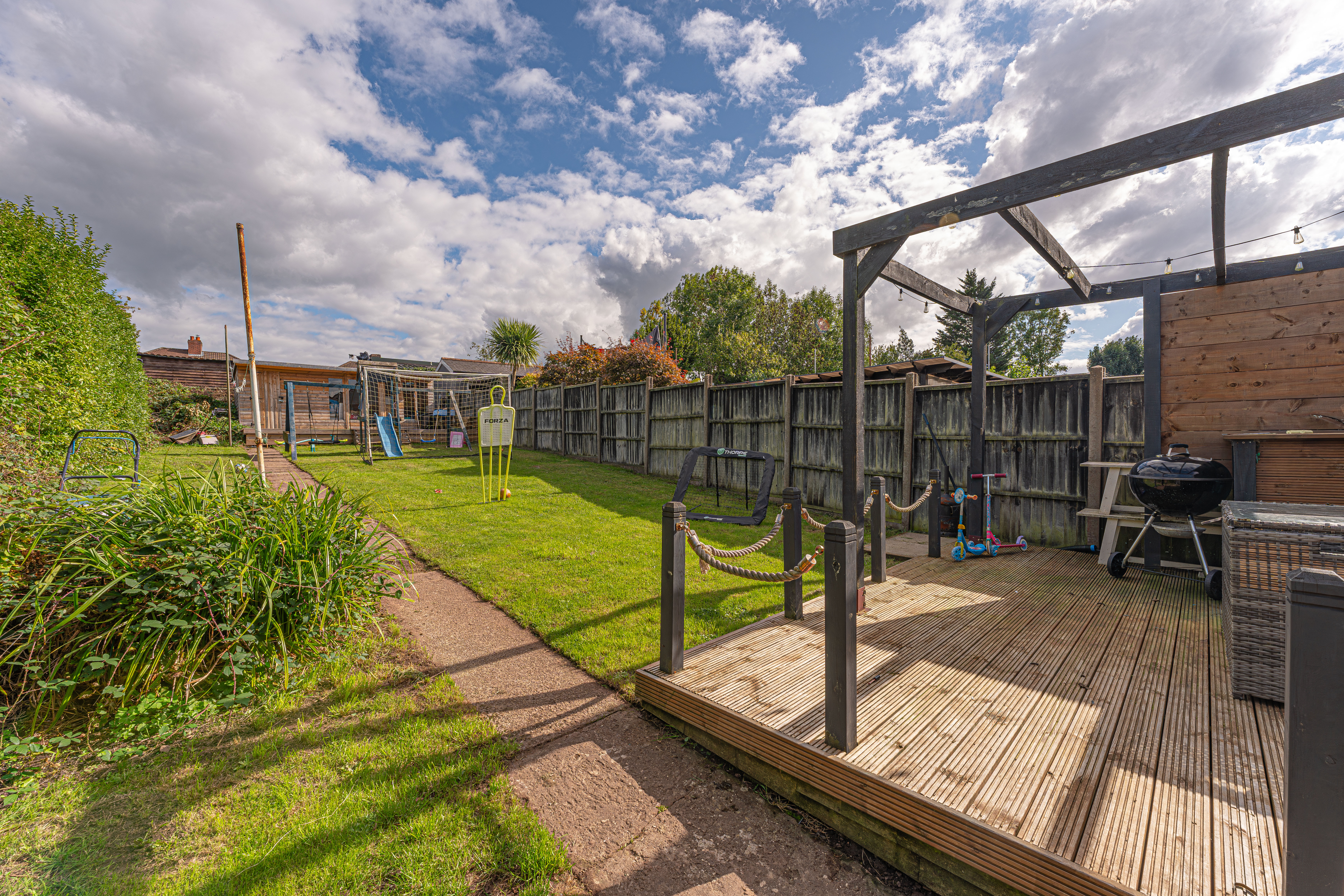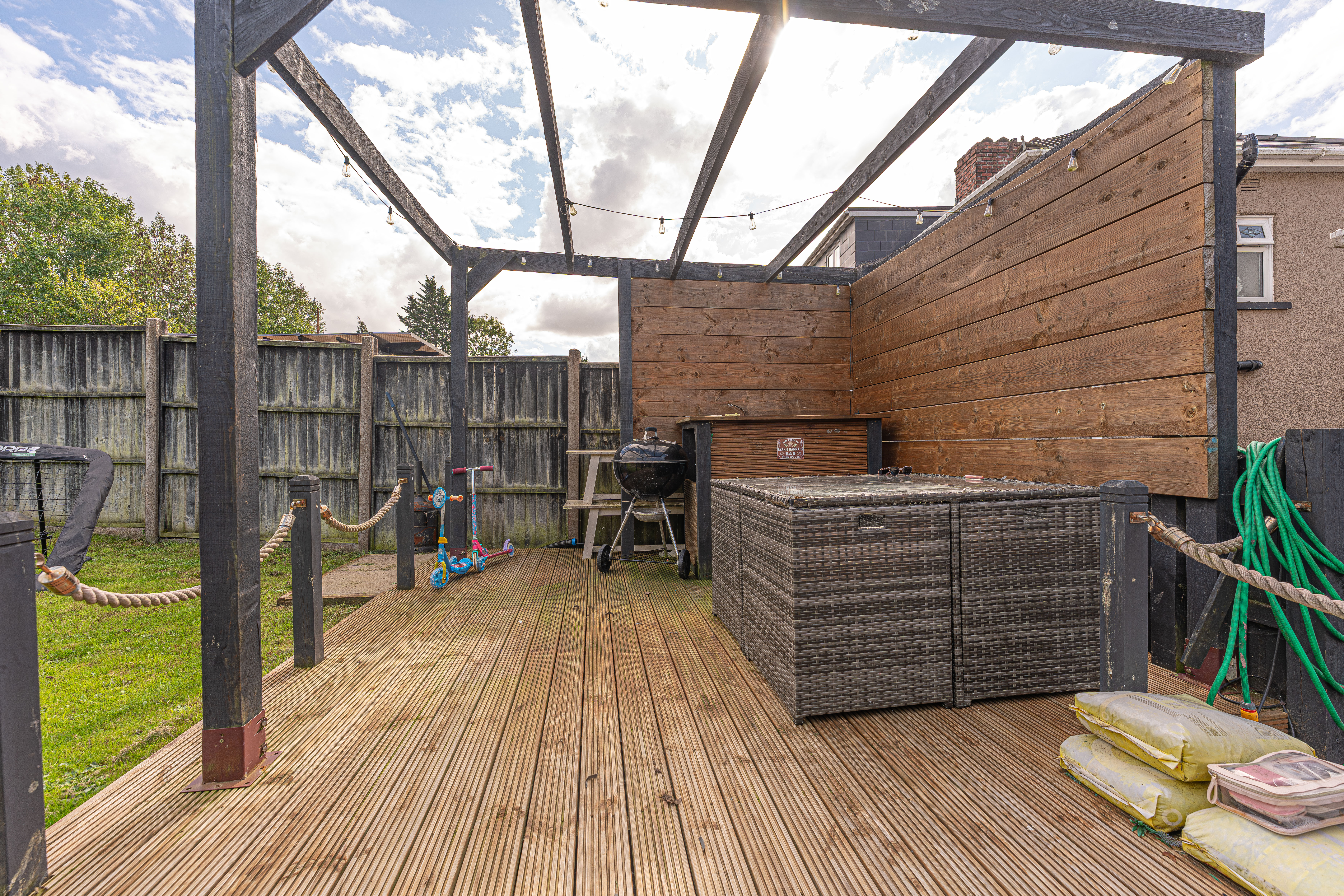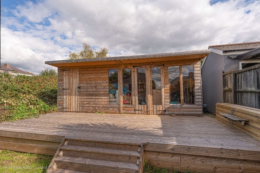 The exterior of the property is equally impressive, boasting a sizeable garden with an abundance of space for the whole family, with multiple seating areas from newly installed decking either side of the large grass lawn. From the house the charming lounge space features a sheltered pergola, perfect for entertaining guests or enjoying alfresco meals. At the far side of the property we can find another large decking area overlooking the garden, as well as the marvellous summerhouse, which has been renovated with electrics, and features a great space for a games room or home bar, in addition to a helpful storage shed.