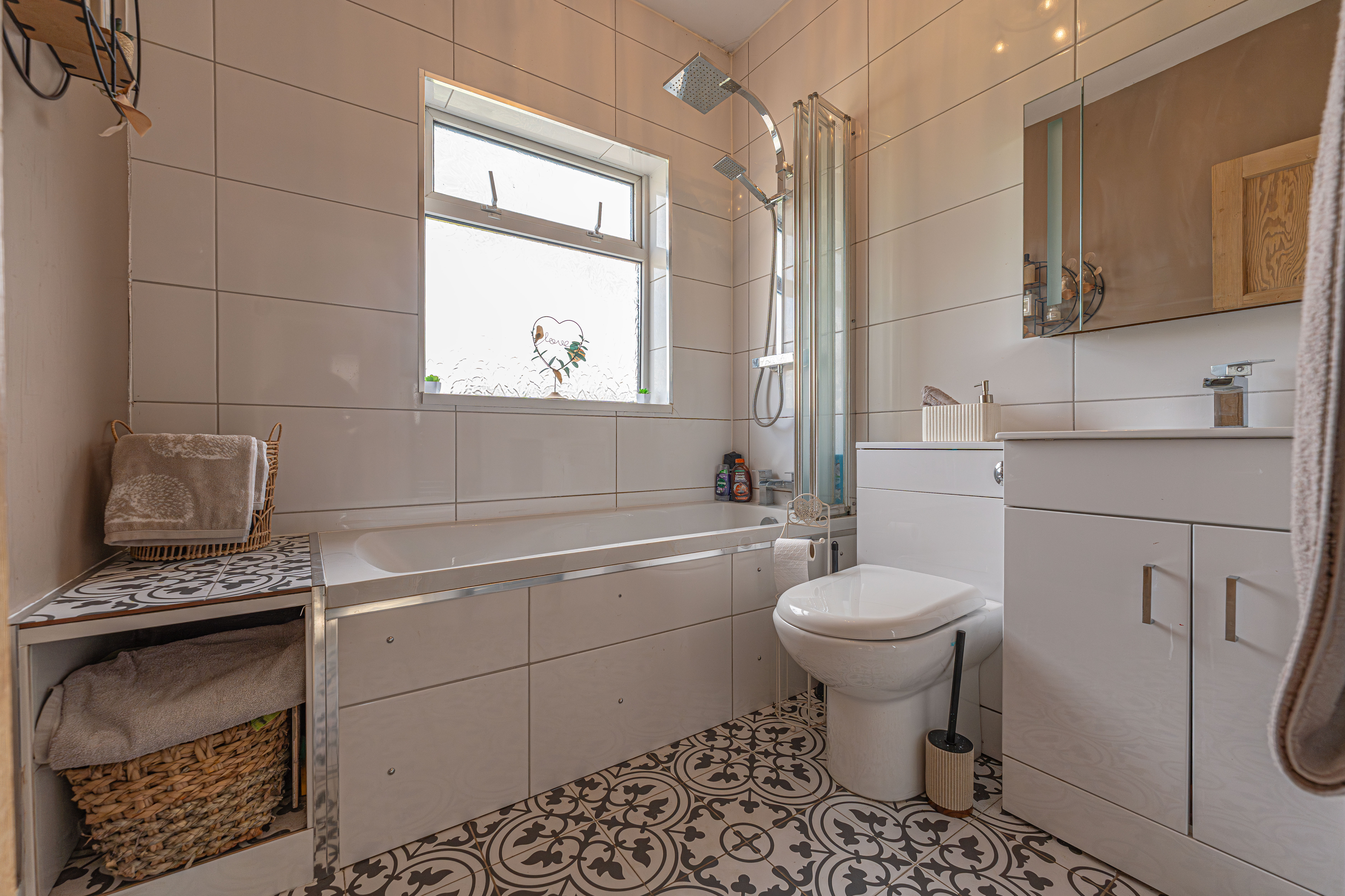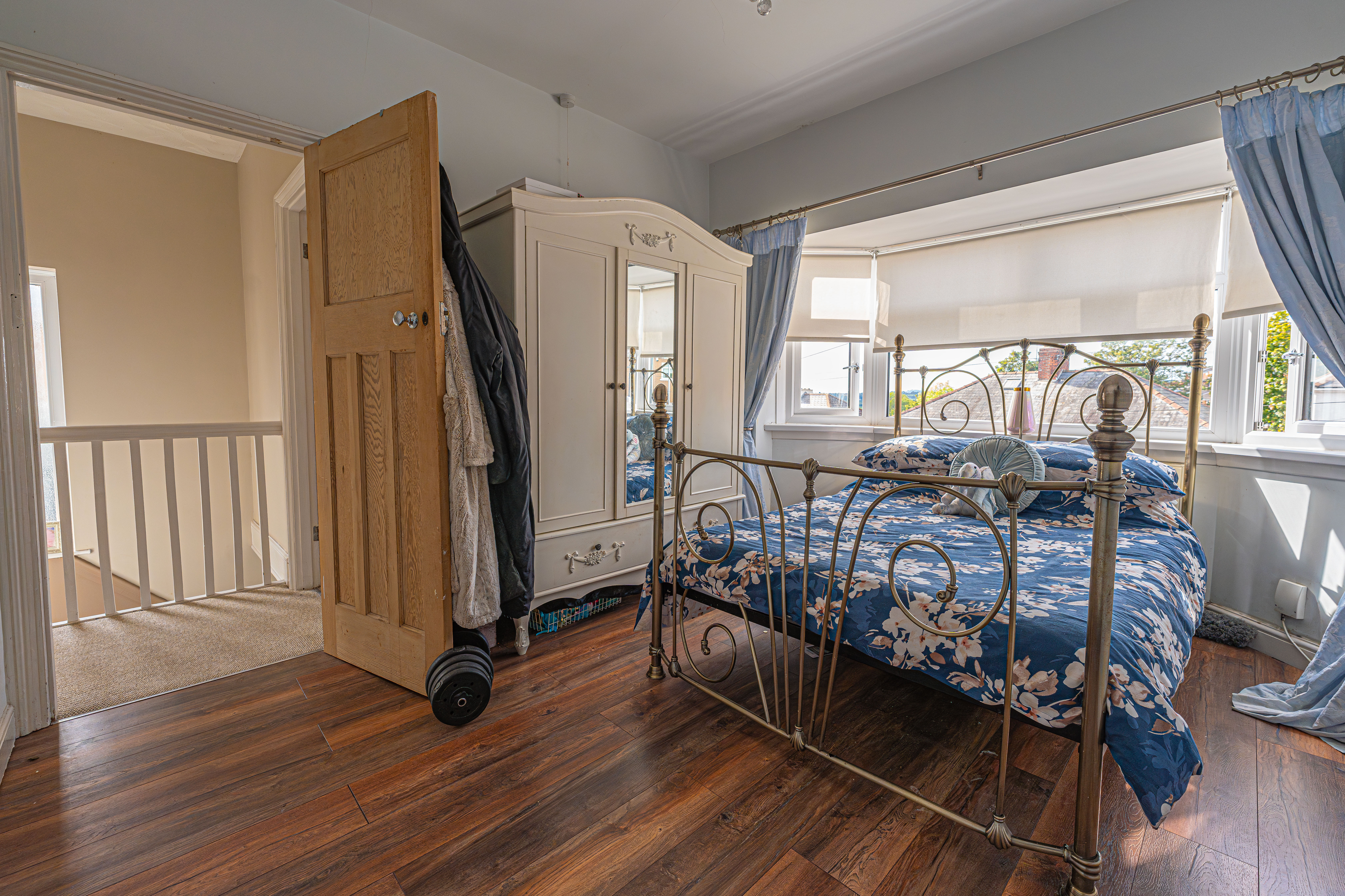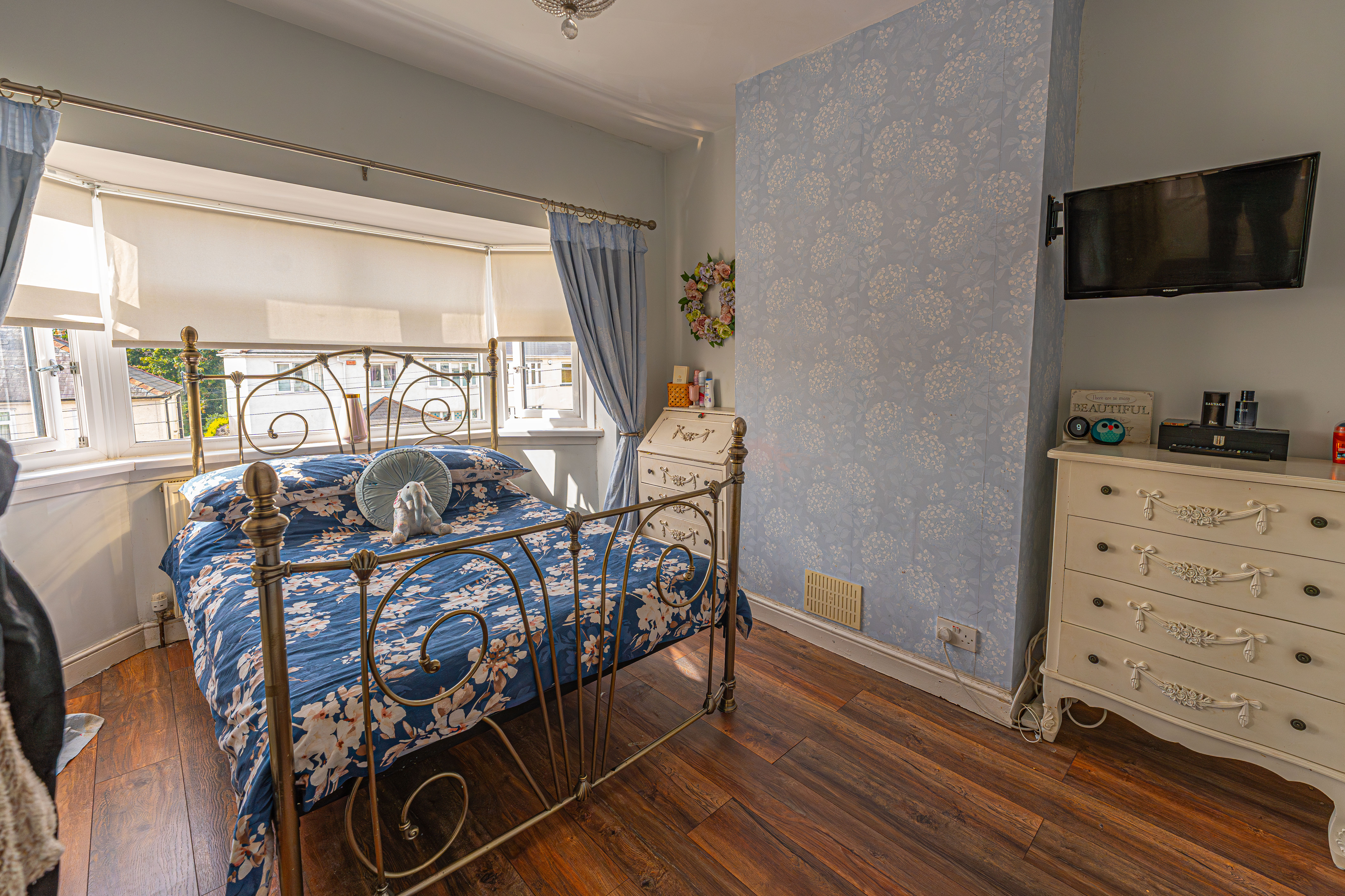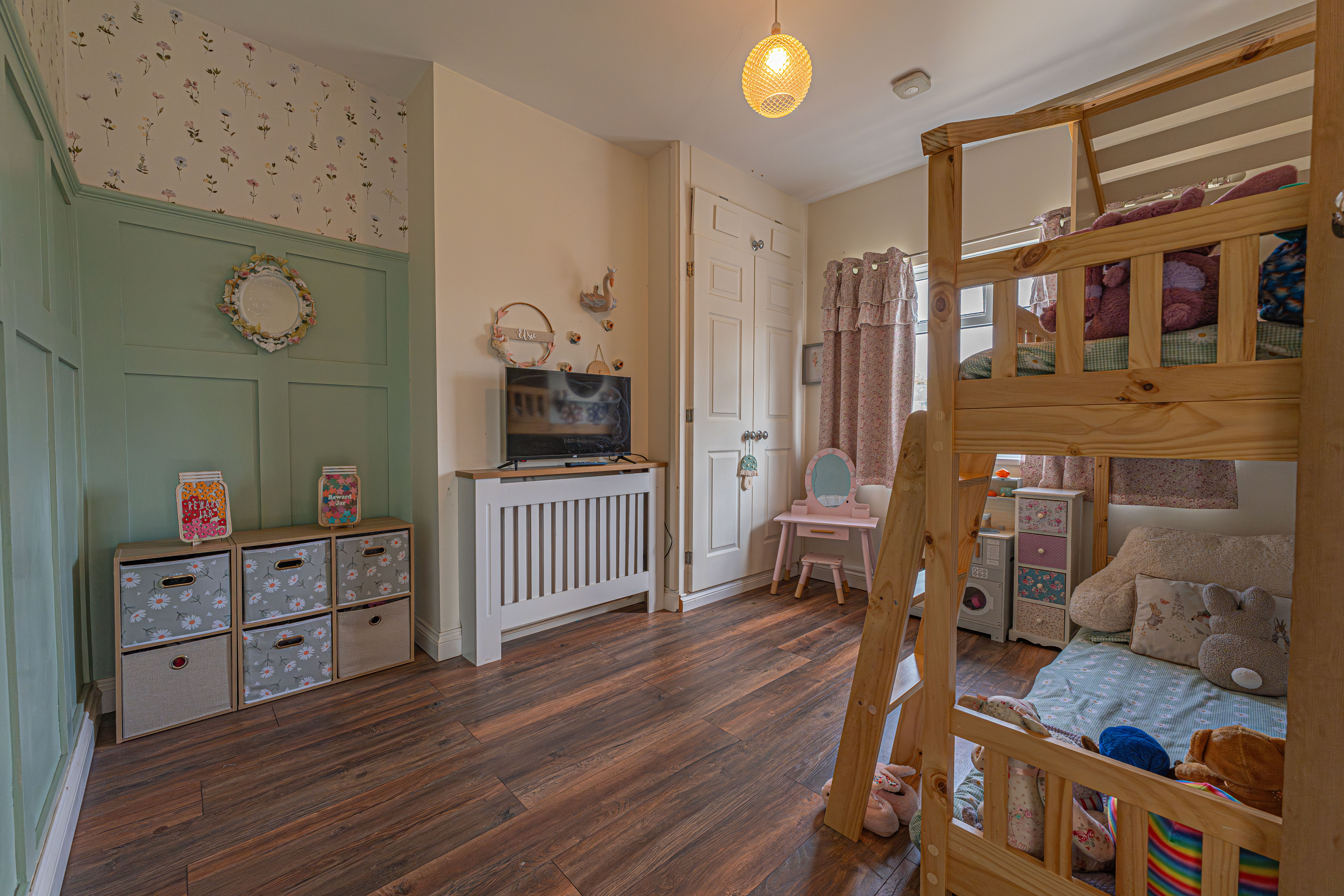 Ascending to the first floor we have three bedrooms, two of which are double in size, while the third is a cozy single, which could also work well as a home office, walk in wardrobe, or children’s nursery. Both of the double bedrooms offer additional attractions, with the rear facing suite accessing fitted storage, and the front bedroom featuring the glorious bay windows of the floor below. From the landing we can also access the new modern bathroom, equipped with a bath suite and rainfall/mixer shower.