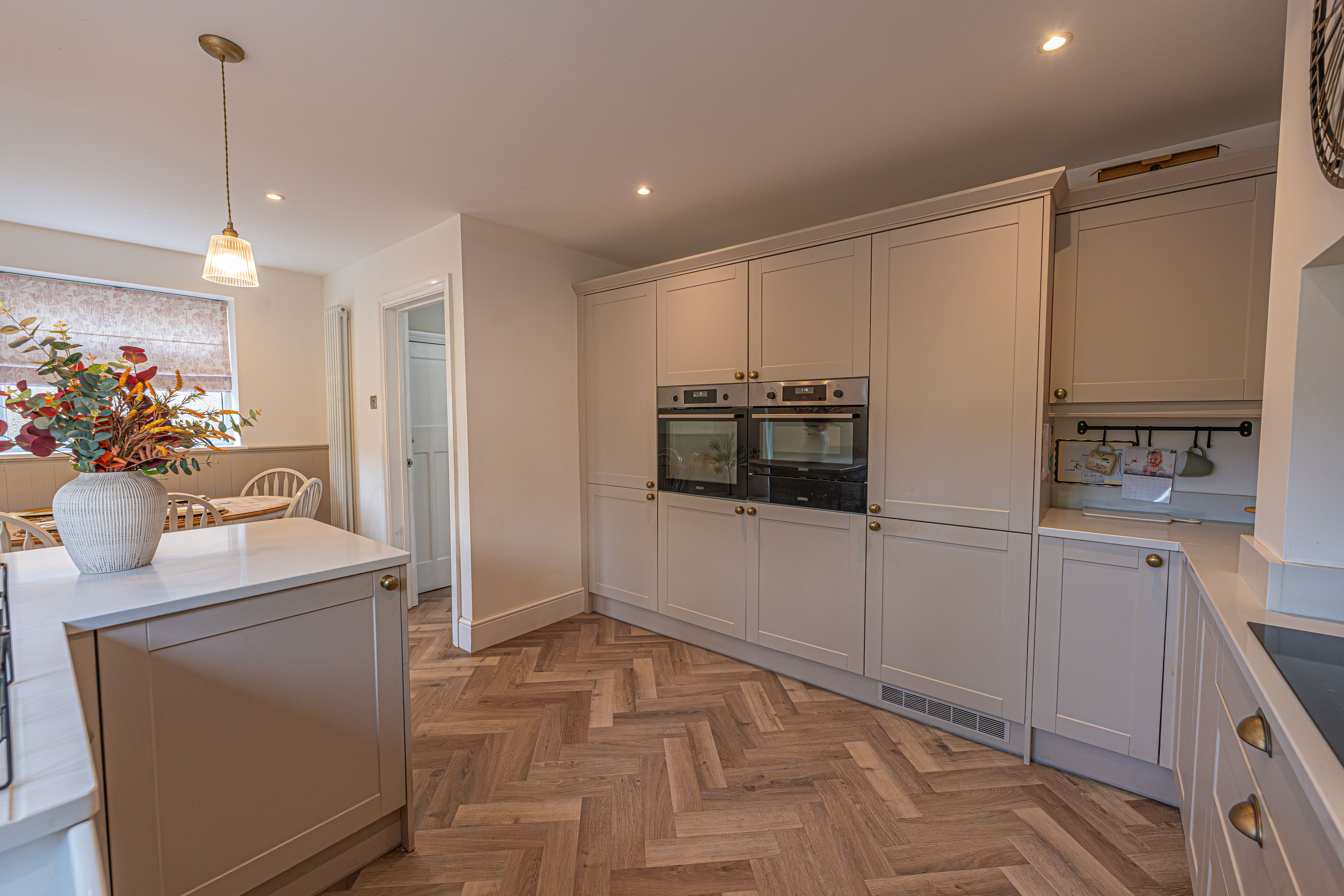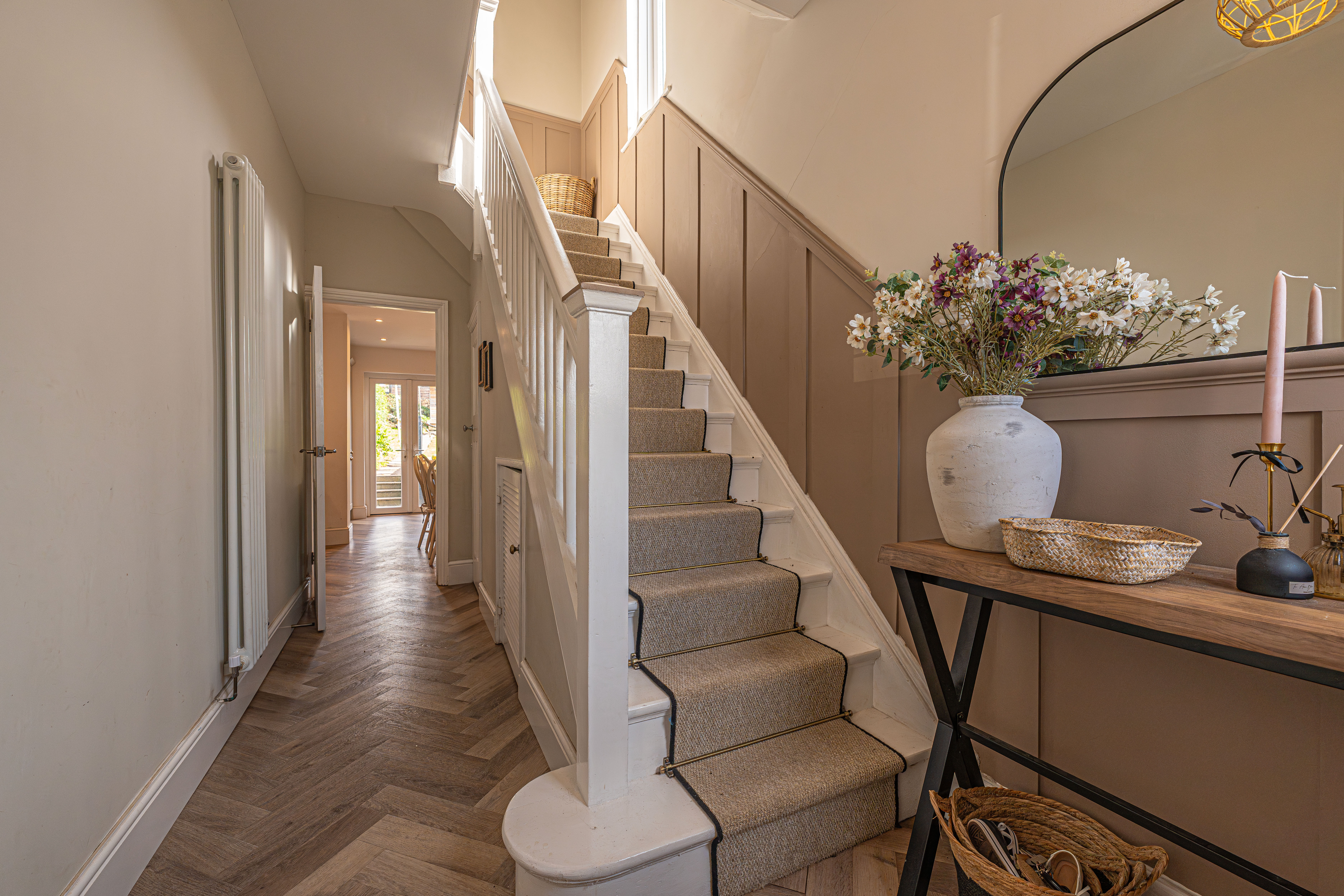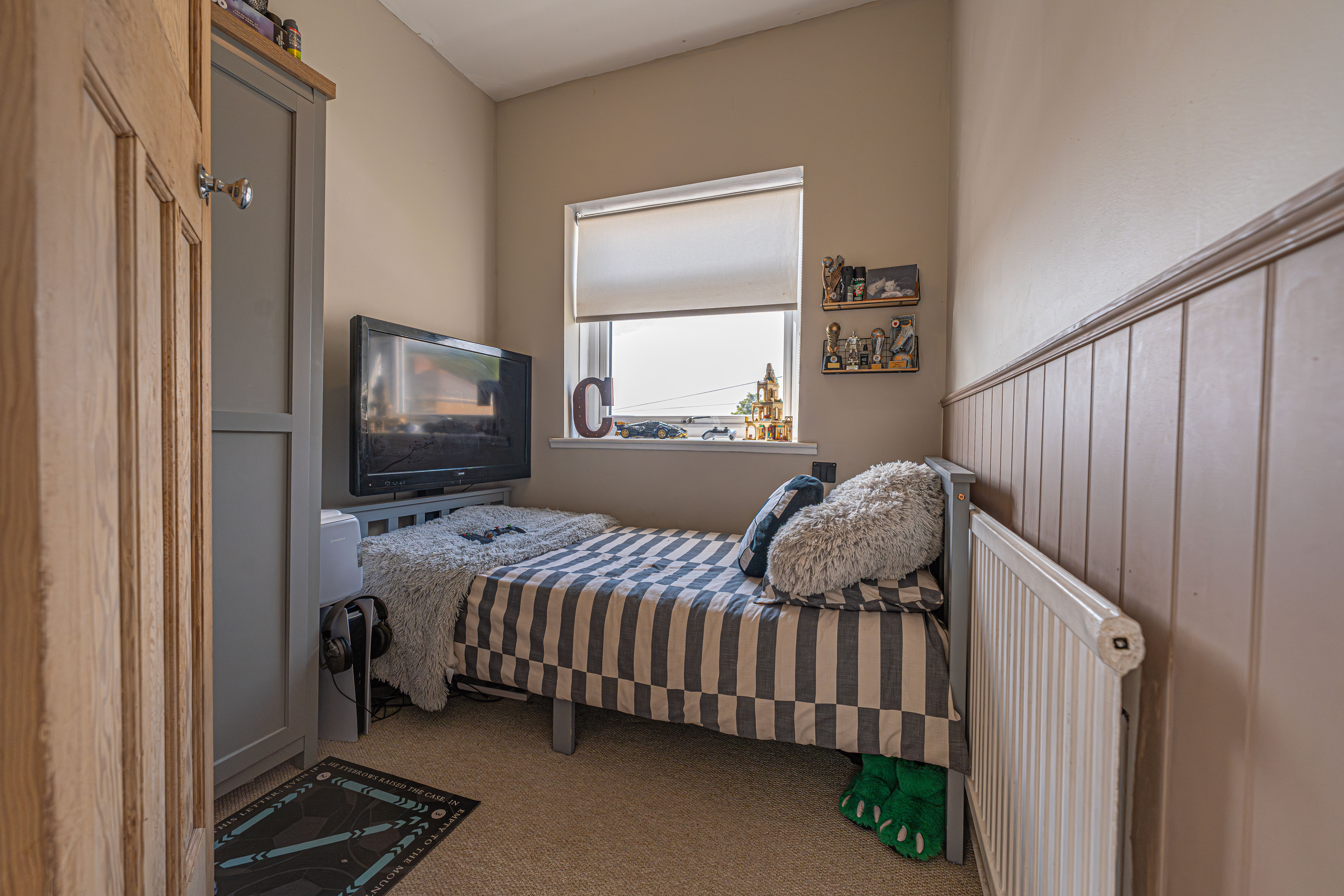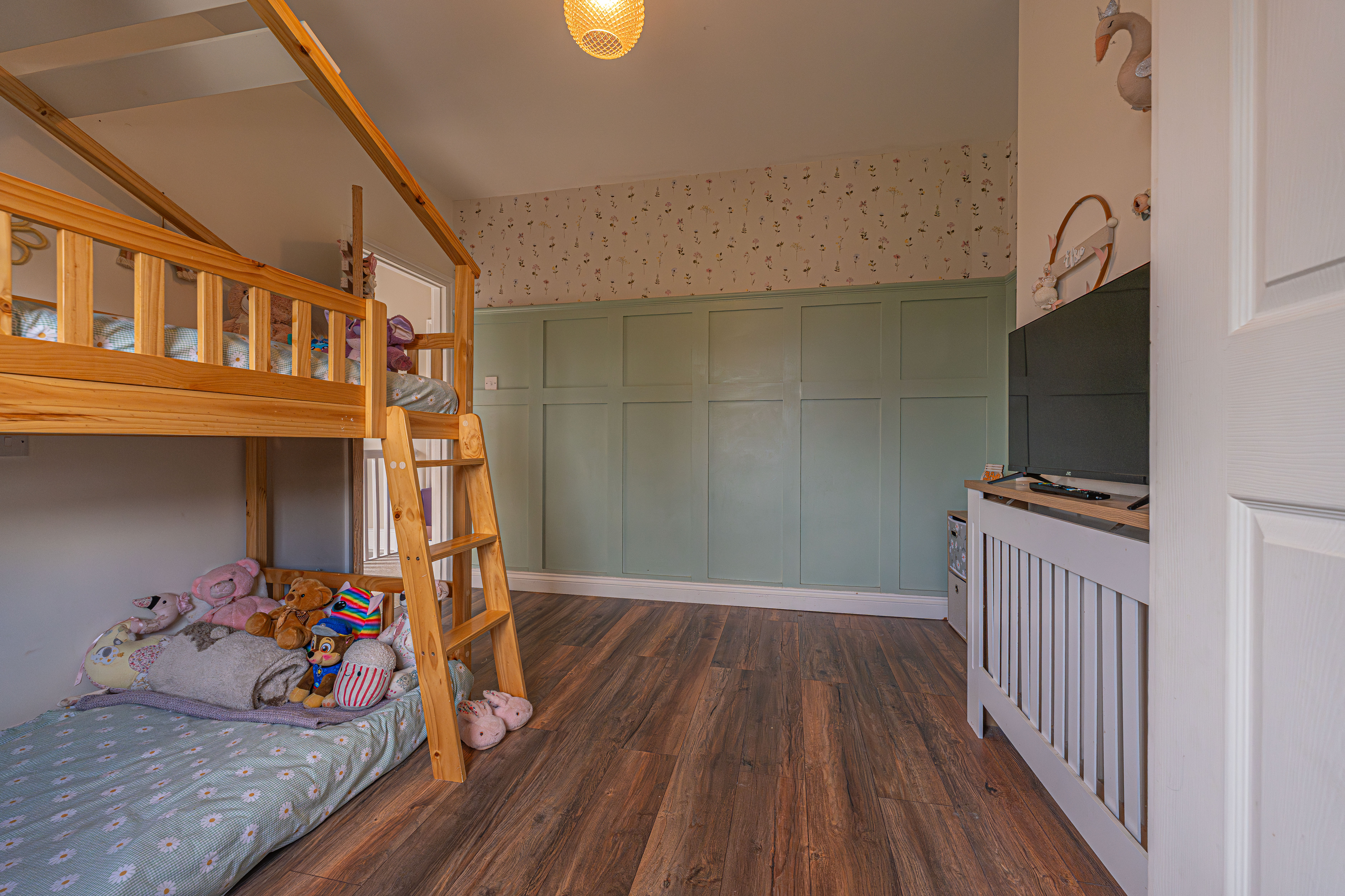 Ascending to the first floor we have three bedrooms, two of which are double in size, while the third is a cozy single, which could also work well as a home office, walk in wardrobe, or children’s nursery. Both of the double bedrooms offer additional attractions, with the rear facing suite accessing fitted storage, and the front bedroom featuring the glorious bay windows of the floor below. From the landing we can also access the new modern bathroom, equipped with a bath suite and rainfall/mixer shower.