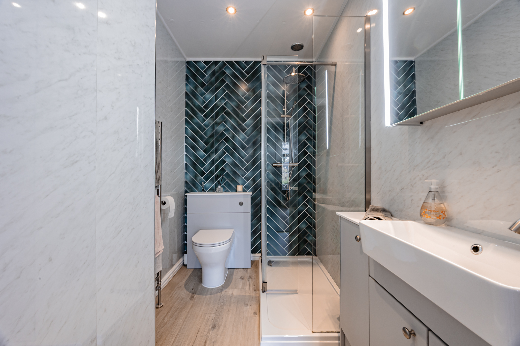 A sleek and recently fitted contemporary ensuite shower room featuring a superb walk-in shower cubicle equipped with both a mixer shower and a deluxe rain shower head alongside a hand-held attachment. The room boasts a modern wall-mounted low level push-flush WC and a stylish built-in sink complemented by a useful vanity unit underneath. The walls are finished with attractive green tiled and marble-effect wet walls for a clean look, paired with durable light oak LVT flooring. Comfort is provided by a heated ladder radiator, and the room is efficiently ventilated by an extractor fan.