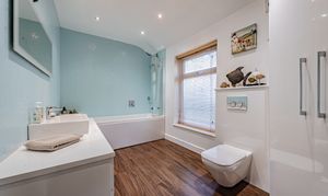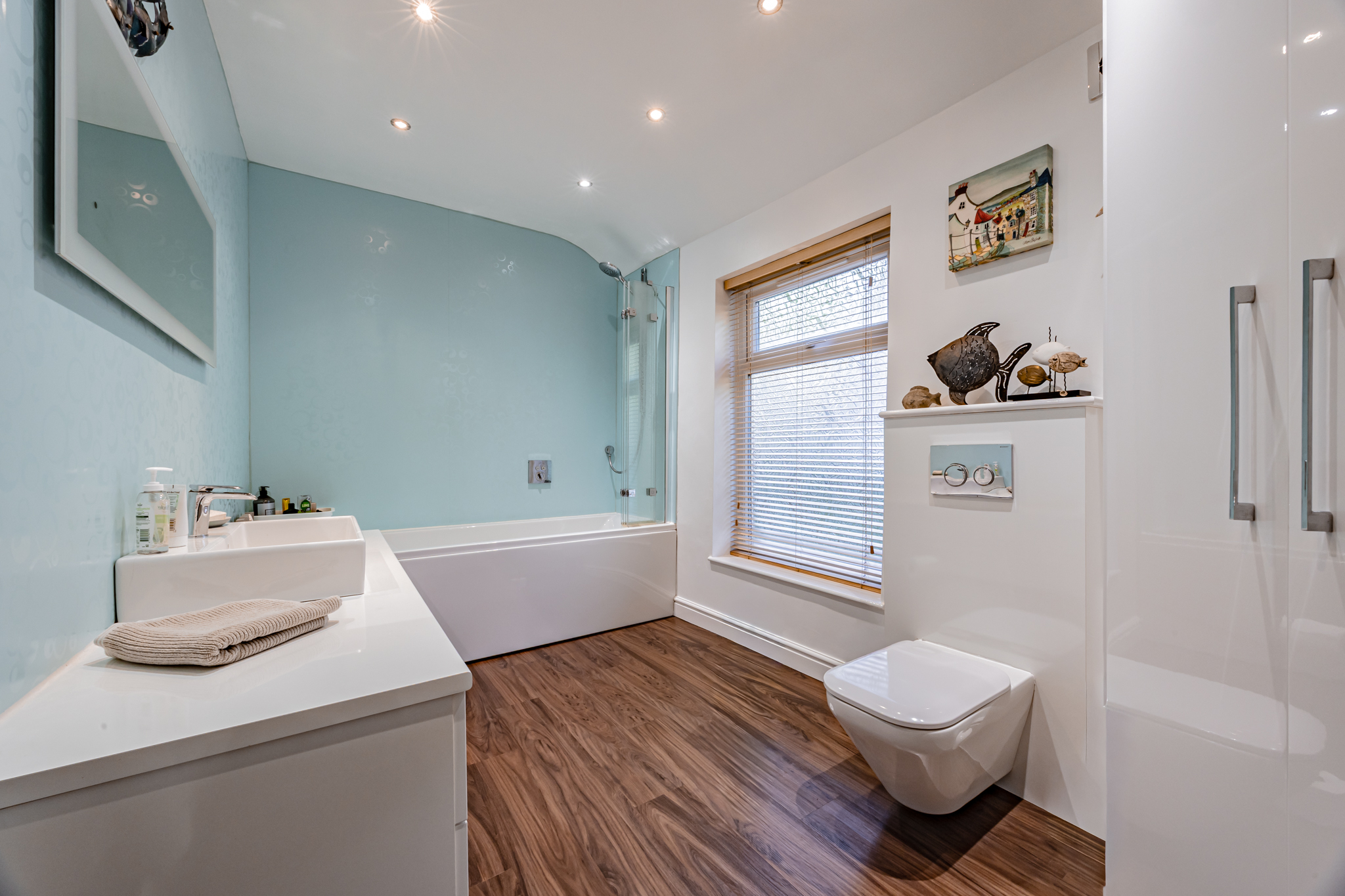 The stylish family bathroom features a modern white panelled bath complete with a convenient mixer shower over. Privacy is maintained via a uPVC window to the rear fitted with privacy glass. The aesthetic is striking, with modern aqua blue wet walls contrasting beautifully with the durable dark oak effect LVT flooring. Utility is high, offering a large vanity unit with a built-in low-level sink and mixer tap, a wall-mounted low level push-flush WC, and excellent storage in the large airing cupboard. A sleek black ladder radiator provides heat, and an extractor fan ensures ventilation.