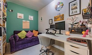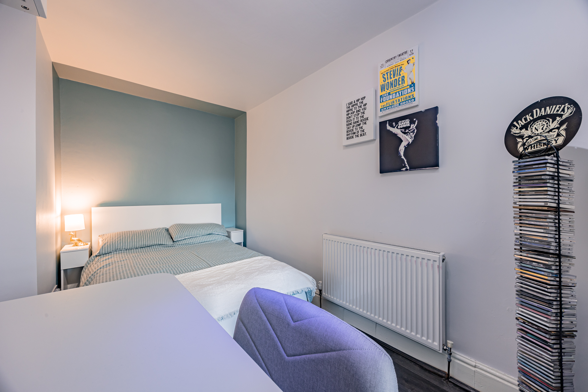 Tucked away for quiet concentration, this flexible room is currently presented as a dedicated home office or could serve as a double bedroom. Natural light is provided by a uPVC window to the rear aspect. The space offers a comfortable environment with soft carpeted flooring and is well-lit by a four-bulb light fitting.