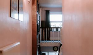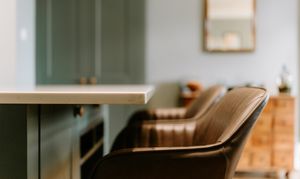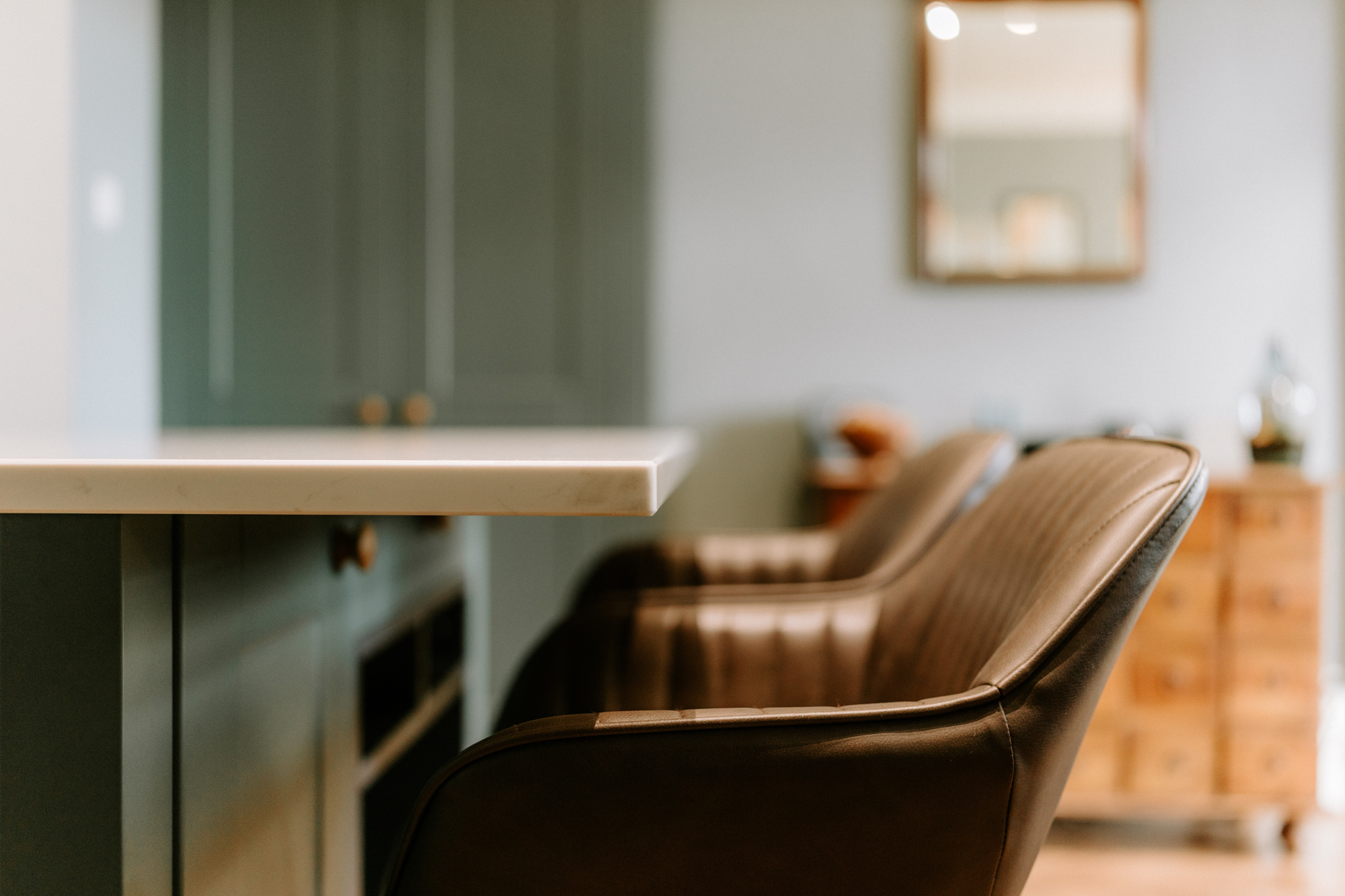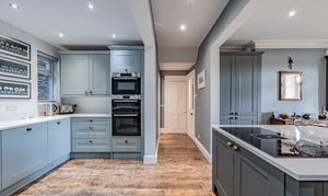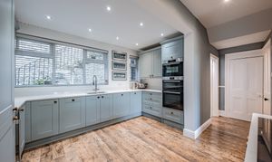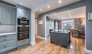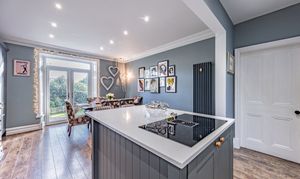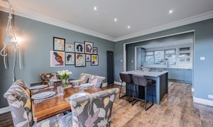 A beautifully designed and exceptionally well-equipped kitchen, offering access to the front via uPVC French doors (with appealing original panelling). Natural light pours in from two uPVC rear windows. The kitchen showcases light blue wall and base units paired with luxurious marble worktops. Culinary enthusiasts will appreciate the BOSCH triple electric oven with a built-in microwave, integrated dishwasher, fridge-freezer, and smart bin storage. The layout is optimised by clever corner units and a convenient wine fridge. A striking central island features a contrasting green finish, housing a Faber Galileo Smart induction hob with integral extraction unit., while low-level and ceiling recess lights provide perfect task lighting. The space is finished with oak laminate flooring and an elegant antique-style high-level radiator and the original ceiling cornicing.