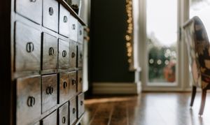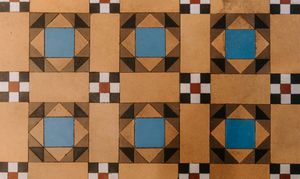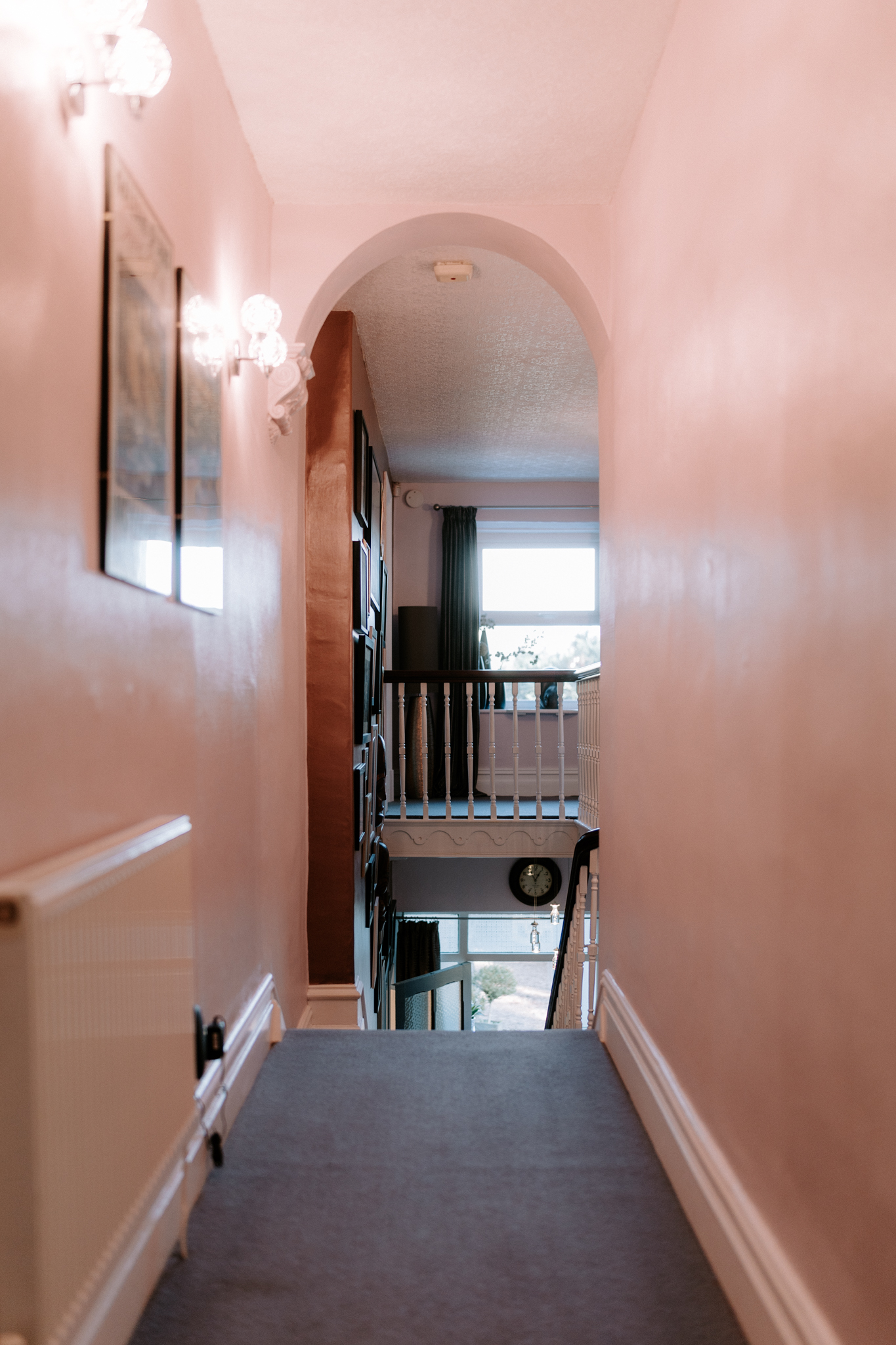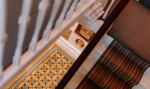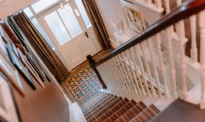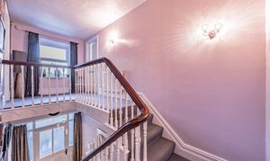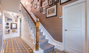 A classic wooden front door opens into a wide, welcoming hallway. The floor is an immediate feature, boasting original Minton tiled flooring that leads past the impressive original panelled staircase. The space is kept tidy with a radiator cover and illuminated by an two ornate glass pendant light fittings, ensuring a stylish and bright entrance.