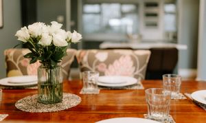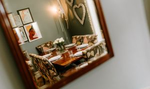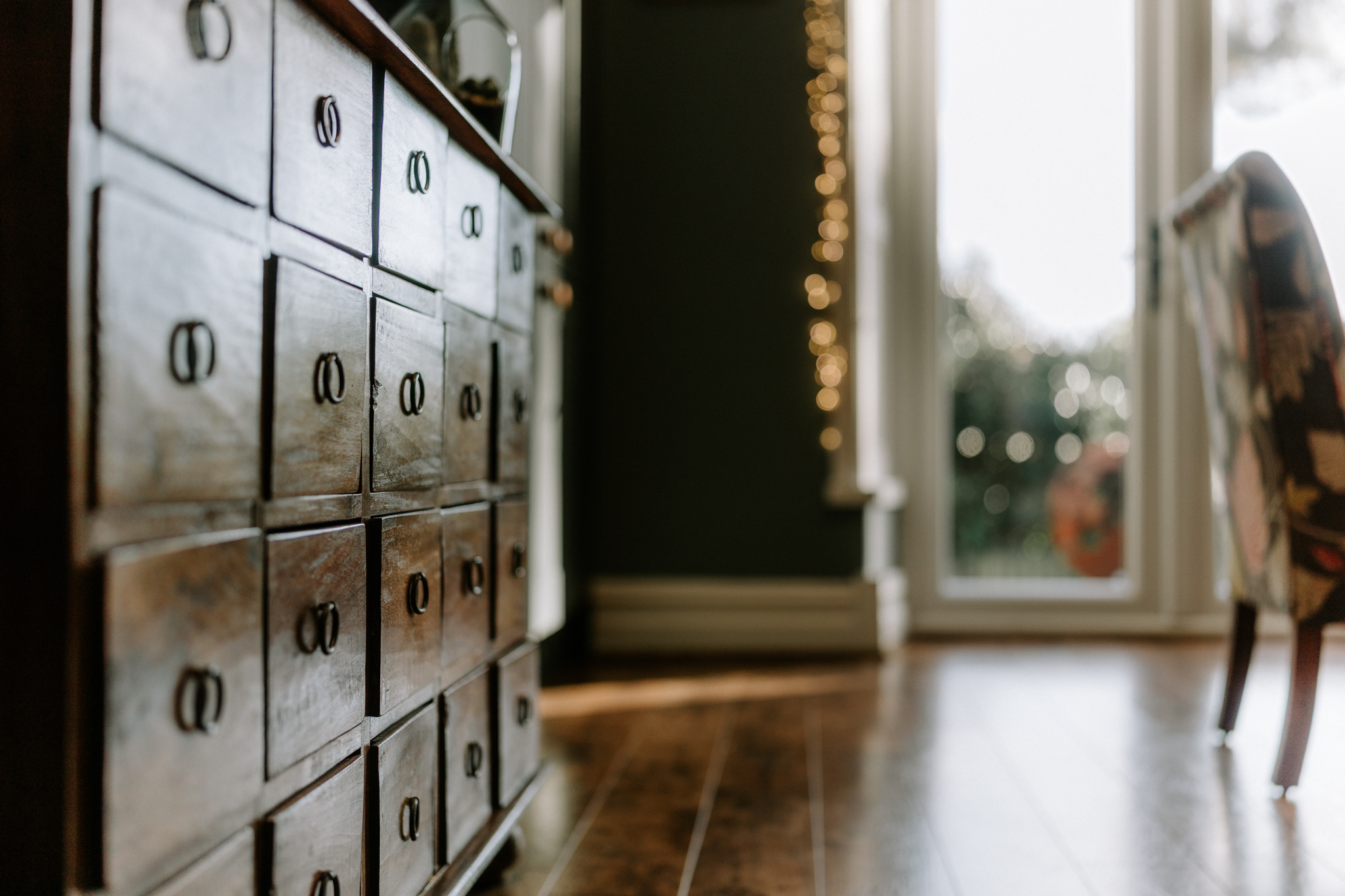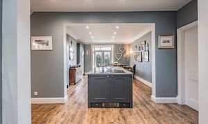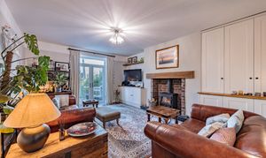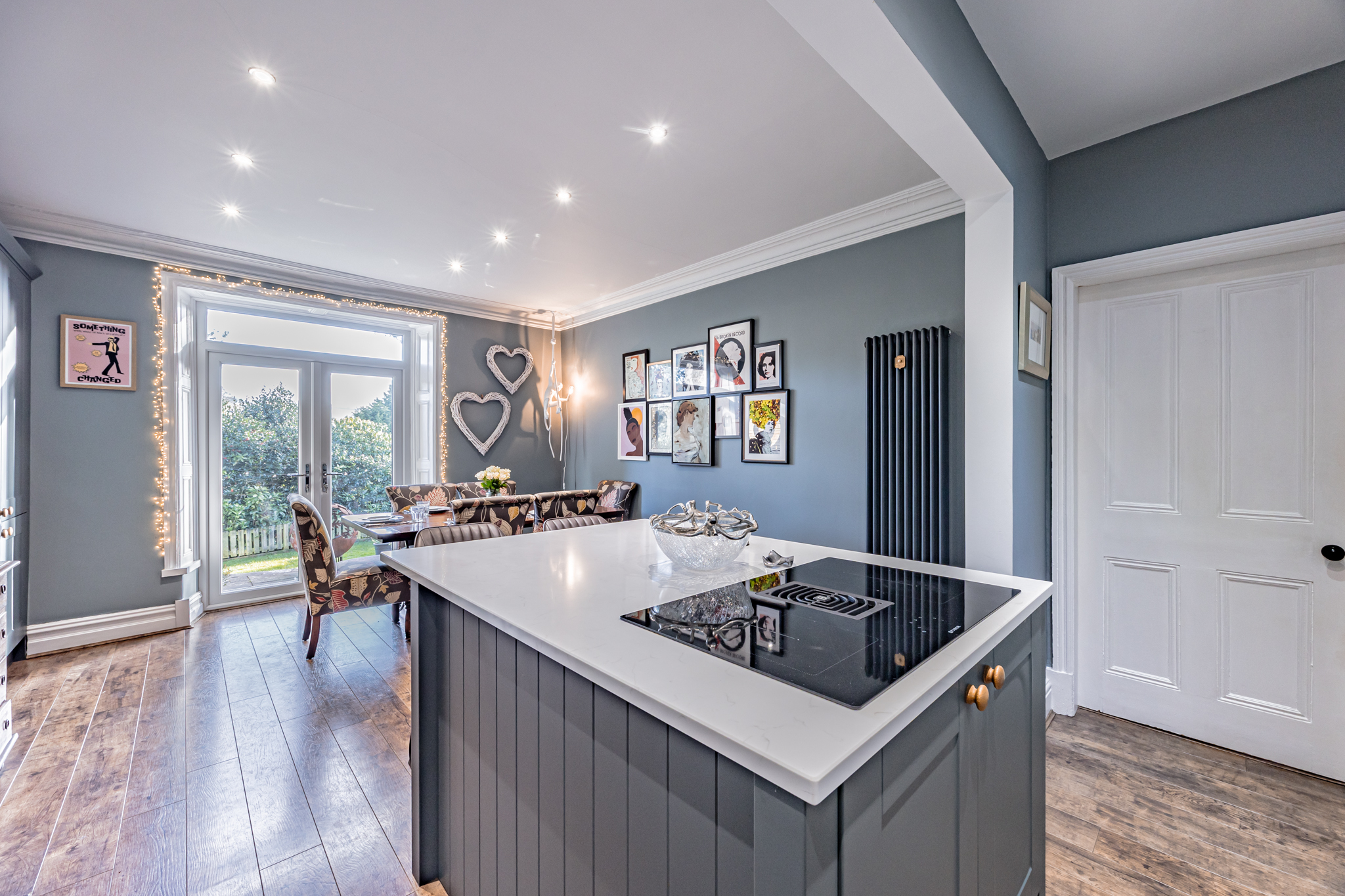 Offering excellent flow to the outdoors via uPVC French doors to the front framed by the orginal panelling, this room is defined by its warming focal point: a Clearview multi-fuel burner resting on a practical slate hearth. The space combines character and utility, utilising the alcoves for fitted bespoke floor to ceiling cupboards and shelves discreetly housing the electric meter and fuse box. Comfort is assured with two double radiators, complemented by durable oak-effect laminate flooring and a bright five-bulb light fitting.