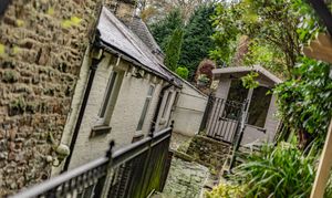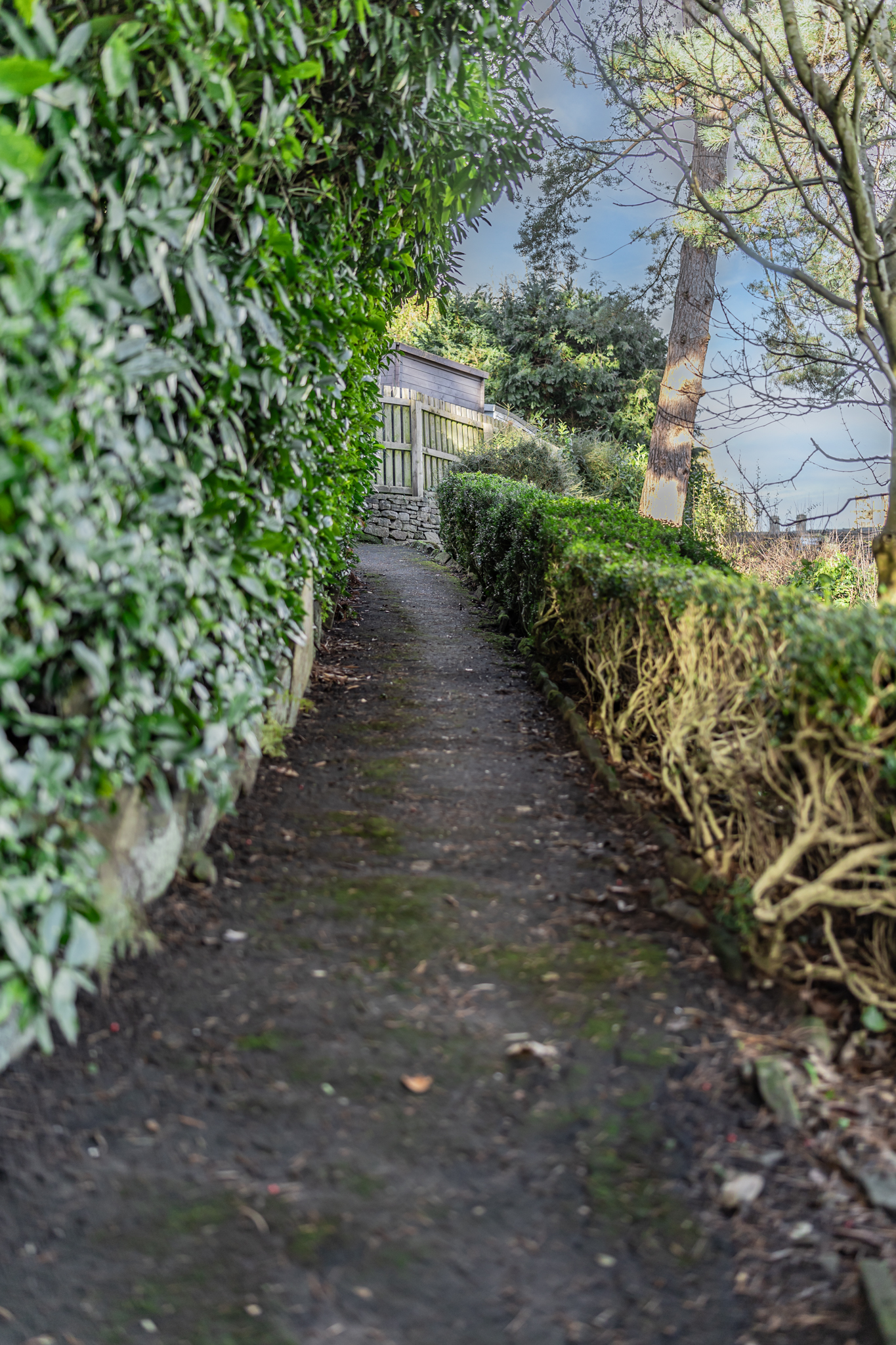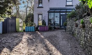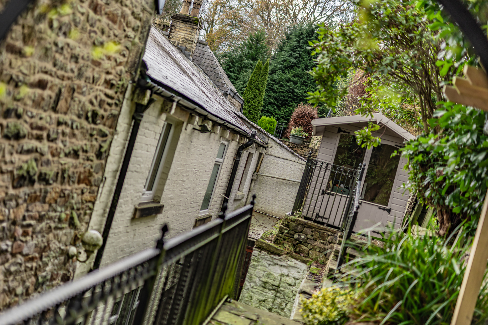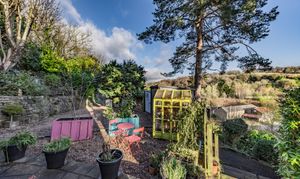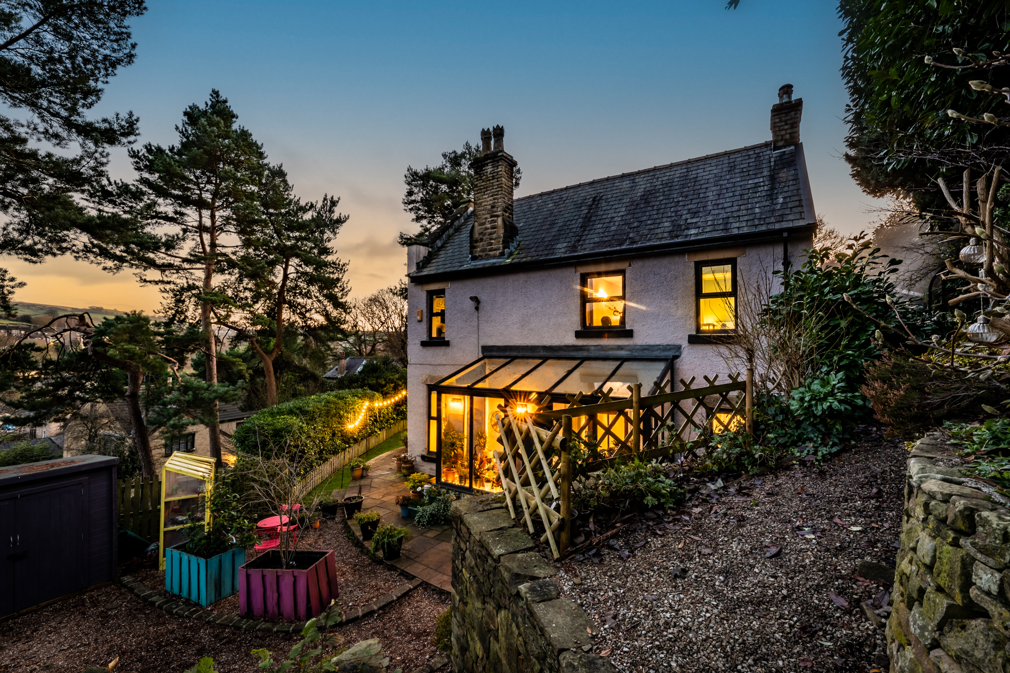 The property is set against a hillside backdrop, affording stunning, panoramic views over Whaley Bridge. The garden is ingeniously designed on tiers, beginning with a lower pathway defined by a mature treeline. Below, a neat, lawned area is enclosed by a charming picket fence. Above, a superb raised Indian stone–paved terrace provides the perfect spot for alfresco dining. Beneath this terrace lies a stone store room with a traditional stone-flagged floor, equipped with both power and lighting, offering excellent practical storage. Beyond the house, the garden ascends via a dramatic tiered design, featuring robust retaining walls and two separate staircases leading to a charming summer house backed by traditional dry-stone walls. Multiple seating areas, including a rustic natural wood pergola, are strategically positioned across the levels to ensure you can catch the sun throughout the day and enjoy beautiful sunsets.