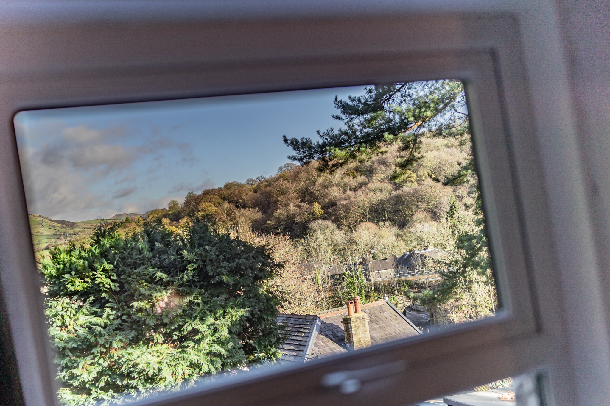 A truly fabulous staircase forms the heart of the first floor, boasting a stunning three-level design with rich, dark wood handrails contrasting beautifully with the painted balustrades. The spacious central landing is illuminated by a uPVC window to the side, which frames captivating views over the landscape towards Chinley Churn. Finished with soft carpeted flooring and subtle wall-mounted lighting, and heated by two double panel radiators, this area is much more than a passageway, it's a striking feature.