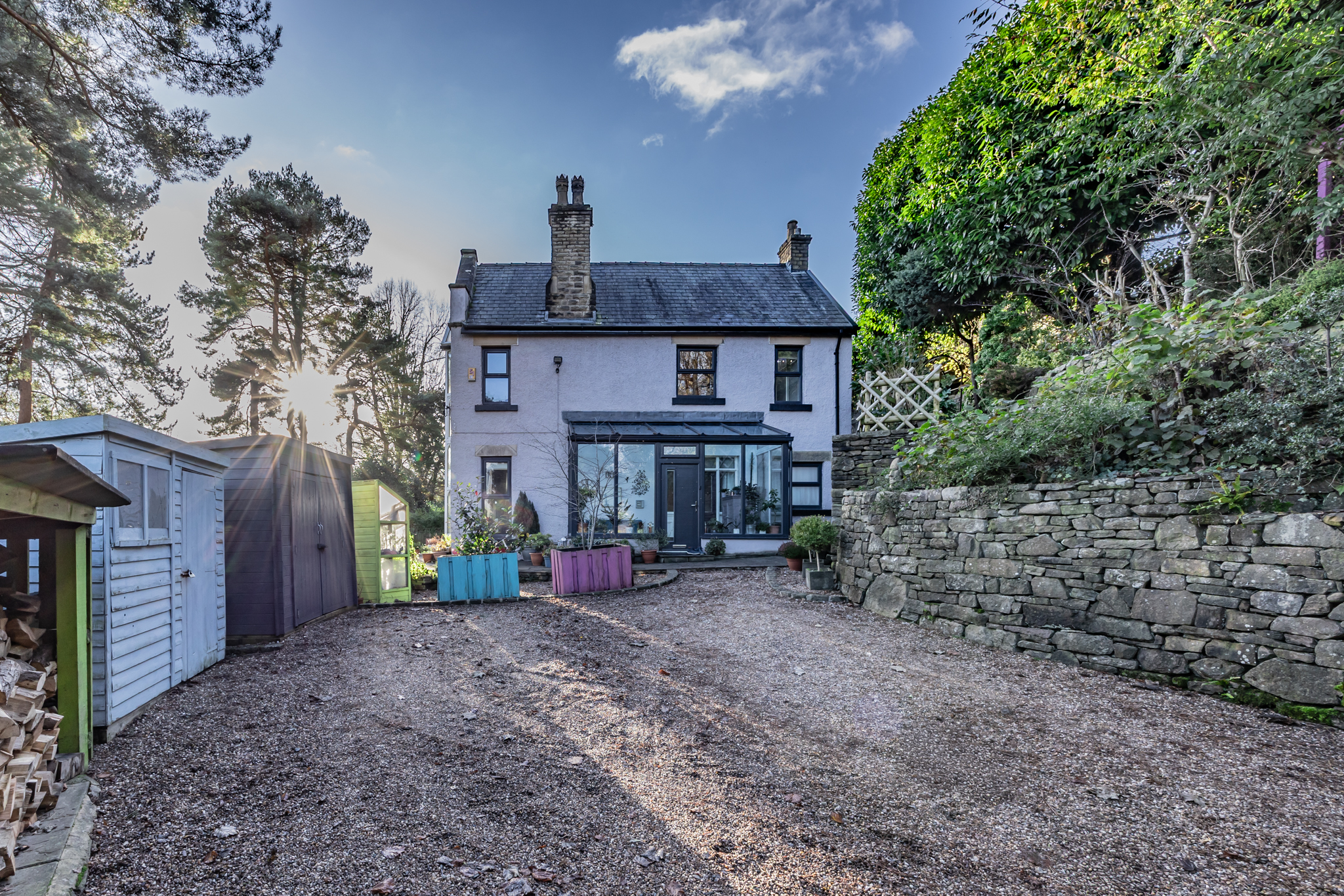 The outside space of this property is a testament to thoughtful design and natural beauty in harmony. Set against a picturesque hillside backdrop, the garden unfolds in a series of tiers that maximise the stunning panoramic views over Whaley Bridge and towards Chinley Churn. A lower pathway bordered by a mature treeline introduces the enchanting setting, leading to a neatly manicured lawn area enclosed by a quaint picket fence. Ascending to the Indian stone paved terrace, outdoor living takes centre stage as it offers an idyllic spot for al fresco dining and relaxing moments. The tiered garden design unfolds with bold retaining walls and staircases leading to a captivating summer house flanked by traditional dry stone walls. Adorned with multiple seating areas strategically positioned across various levels, including a rustic wood pergola, the garden ensures you can bask in sunlight throughout the day and relish beautiful sunsets in the evening. Accessible via a private road, the secure, gated gravel driveway provides ample parking for four vehicles, bordered by lush greenery that seamlessly integrates with the enchanting tiered garden landscape, featuring two practical wooden garden sheds for added convenience.