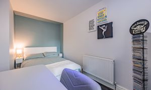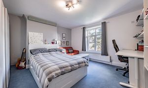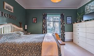 This stylish Double Bedroom room offers a neat and functional space with a uPVC window to the side. The dark wood LVT flooring provides a rich contrast and low-maintenance finish, complete with double fitted wardrobes. Warmed by a double radiator, the room is brightly lit by a practical six-bulb light fitting.
