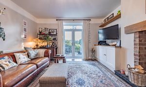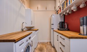 Clean white base units topped with attractive, natural wooden worktops, a charming wooden back door with a small viewing window. The space is equipped with a classic Belfast sink and provides dedicated space for a washing machine, tumble dryer, and a full-height fridge freezer. Underfoot, the stunning original stone flagged flooring adds historic authenticity and exceptional durability, while high-level storage cupboards maximise vertical space. The utility room features a recently fitted Worcester Bosch Combi boiler.
