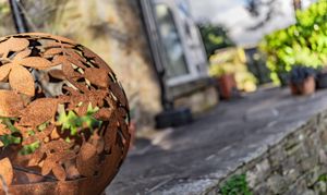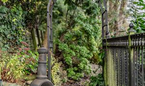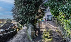The property is accessed off a private road, leading to a secure, gated gravel driveway offering generous parking space for up to four vehicles. This practical approach is beautifully framed by mature planting and provides seamless access to the surrounding, fabulous tiered garden, which includes two useful wooden garden sheds.