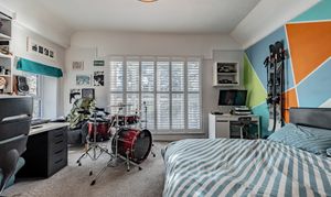 A truly striking and spacious room, featuring a magnificent double-height window to the front, which includes attractive built-in internal windows and elegant plantation shutters for adaptable light control and privacy. An additional uPVC window to the side captures the stunning views towards Chinley Churn. Storage is ample with three sleek space grey and black wardrobes. high ceilings enhance the sense of scale, while a large designer pendant fitting adds a touch of modern luxury. Finished with comfortable carpeted flooring and two double radiators.