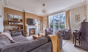 Bathed in natural light, this superb reception room features a magnificent, double-height uPVC bay window to the front, complemented by an additional uPVC window to the side. The focal point is the impressive, large bronze coloured Clearview multi-fuel log burner set upon a marble hearth, promising warmth and atmosphere on cold evenings. Elegant period details abound, including original ceiling cornicing and skirting boards. The room is comfortably finished with carpeted flooring, heated efficiently by two double radiators, and beautifully illuminated by a designer pendant fitting and two stylish wall-mounted lights.