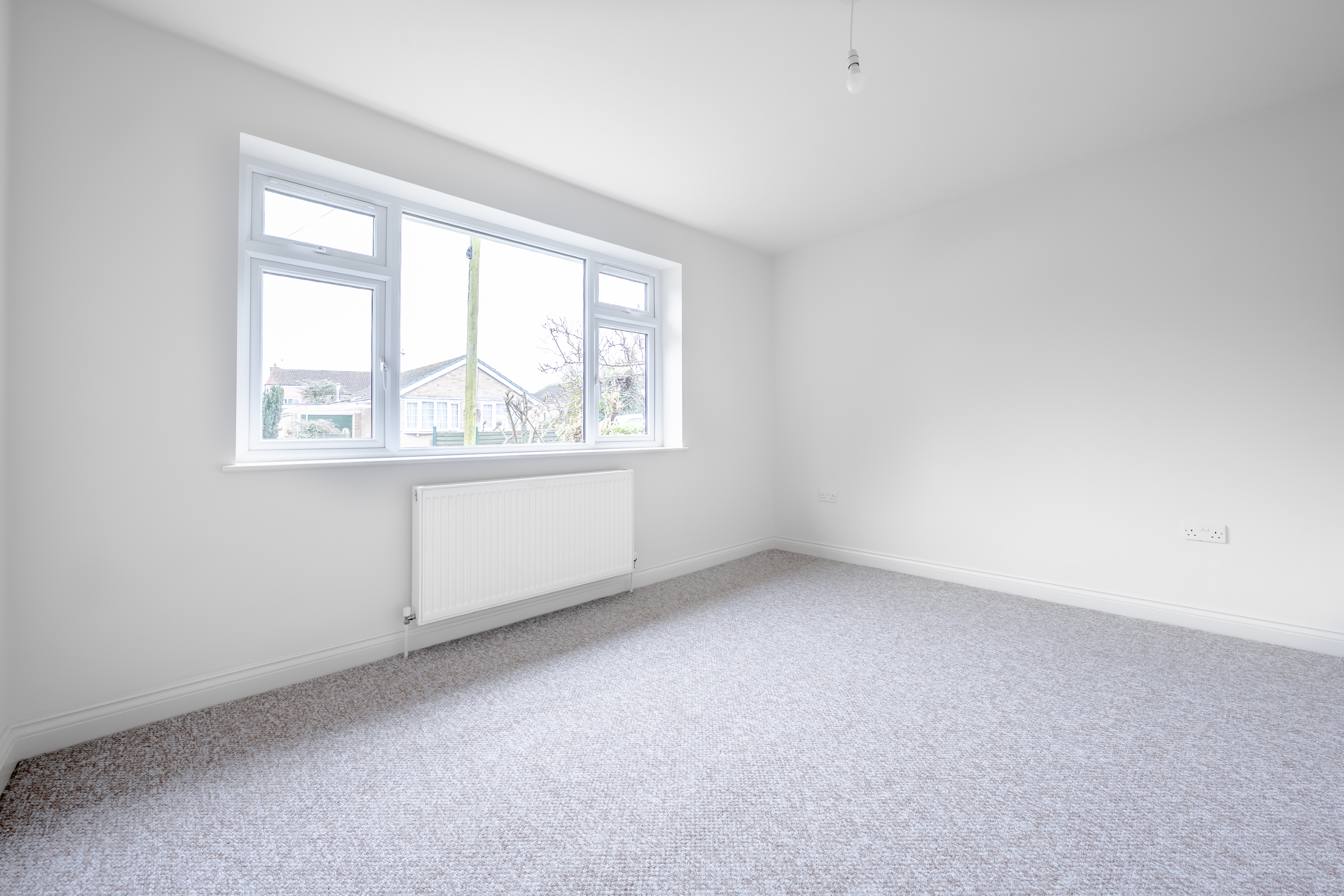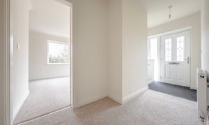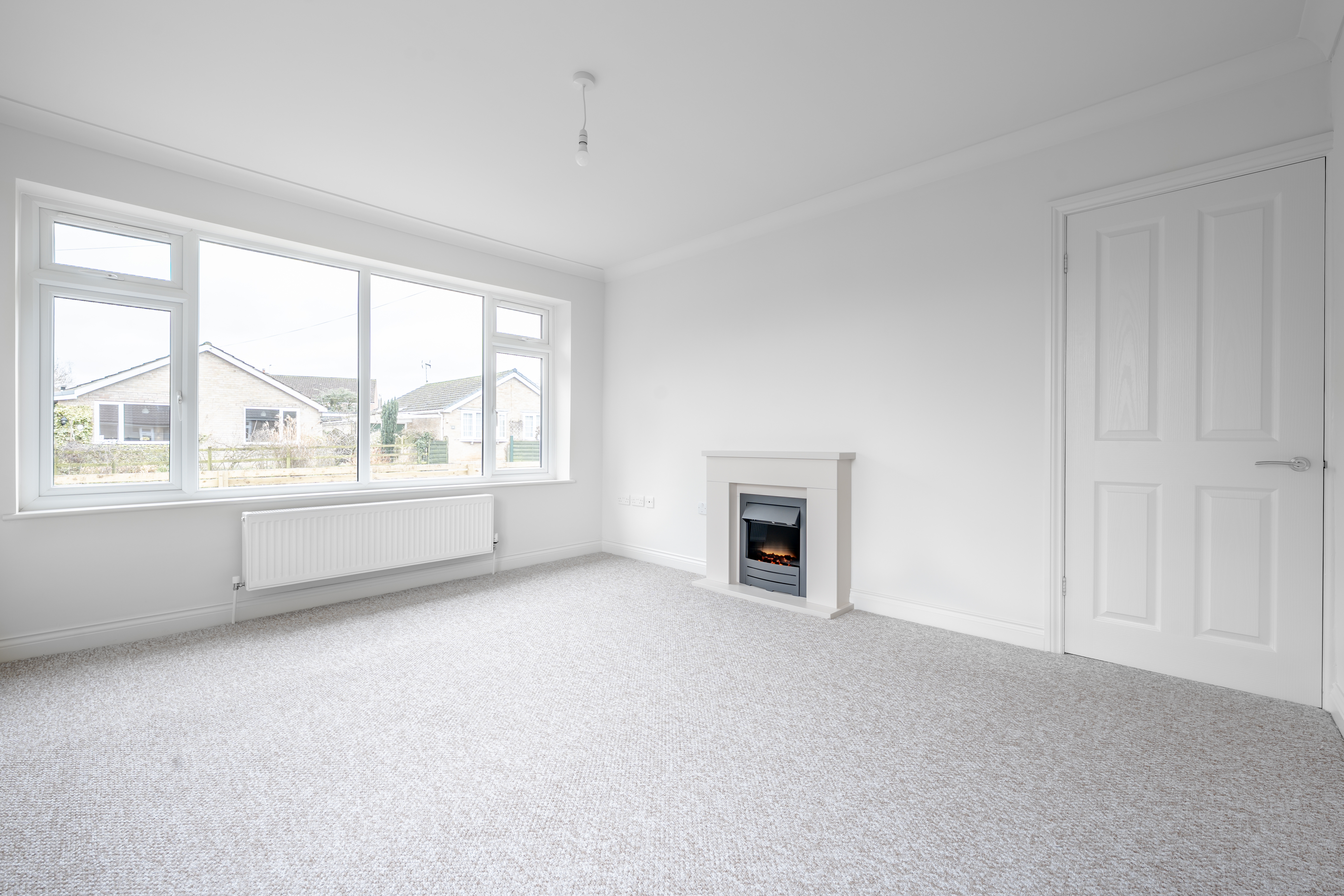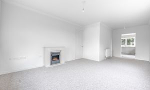 The accommodation opens into a welcoming entrance hall with a useful built-in storage cupboard and access to all rooms. To the right lies a spacious open-plan living/dining room, offering ample space for both seating and a dining table, centred around a feature fireplace. Large windows to the front and side flood the room with natural light.