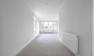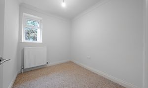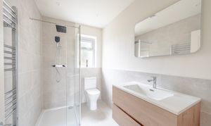 There are two generous double bedrooms and a third single bedroom, ideal as a child’s room or home office, all served by a contemporary bathroom fitted with a stylish walk-in shower. To the rear, the modern kitchen is appointed with sleek cabinetry, integrated appliances and ample worktop space, and provides direct access to the enclosed rear garden, mainly laid to lawn with a smart gravelled seating area.