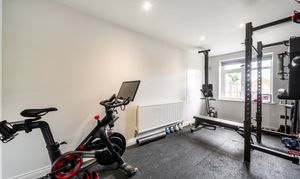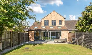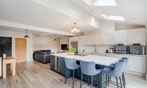 Fronted by a lawn and block paved driveway suitable for multiple cars, the house, benefitting from over 1800 square feet of internal accommodation opens into a central hall. To the front elevation there is a lovely living room centred around a feature log burning stove with recessed shelving and cupboards to either side of the chimney breast. The heart of the home is undoubtedly the fabulous open plan living and dining kitchen with bi-folding doors the entire width of the rear that open on to the flagged patio entertaining area and large lawned garden beyond enjoying the sun throughout the day. The high quality fitted kitchen has a range of units, integrated appliances and a central island with quartz worktops. The vaulted dining area with velux windows is large enough to accommodate a family sized table. There is a useful separate utility room as well as downstairs shower room. Completing the ground floor is a home gym/office and two storage cupboards.