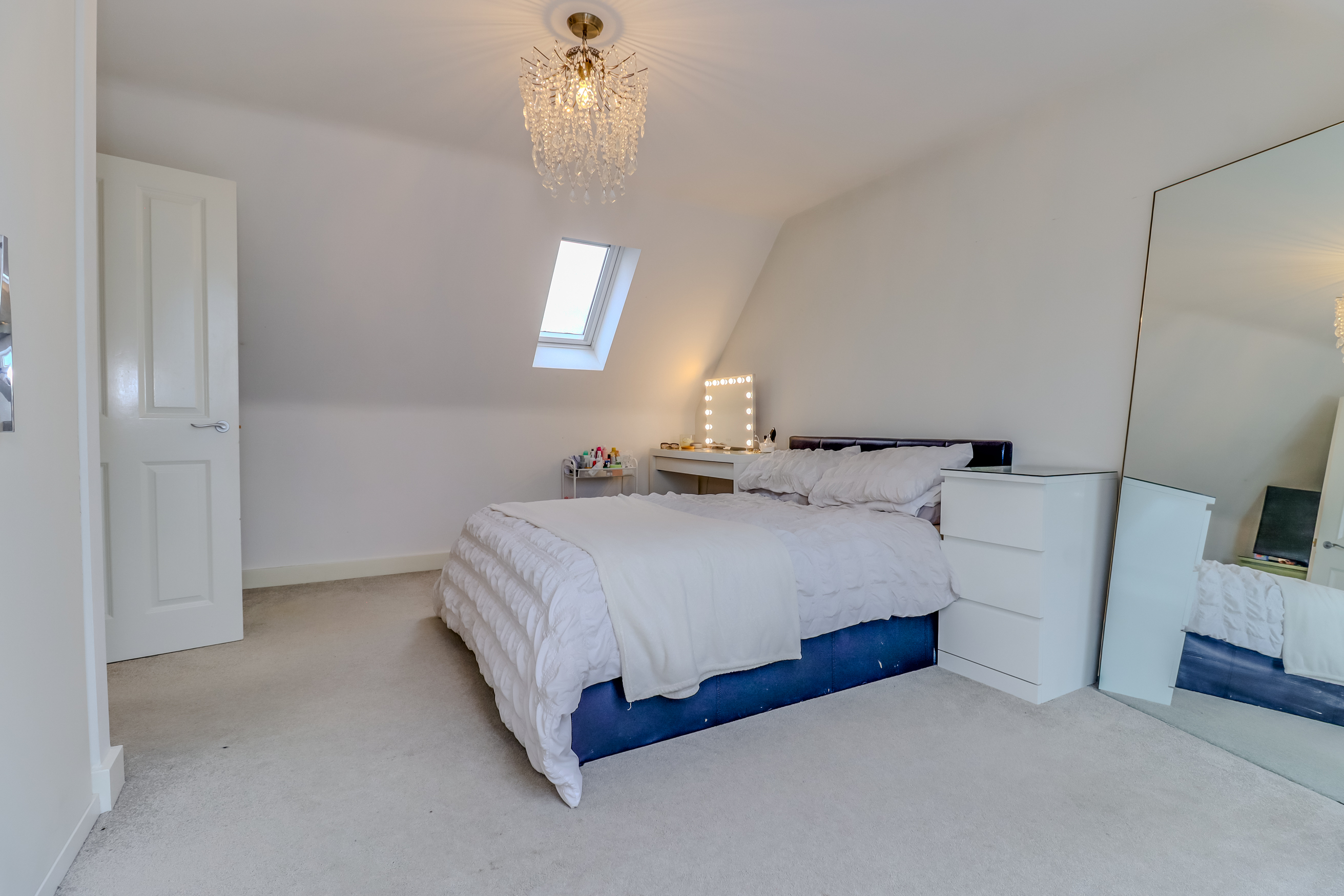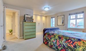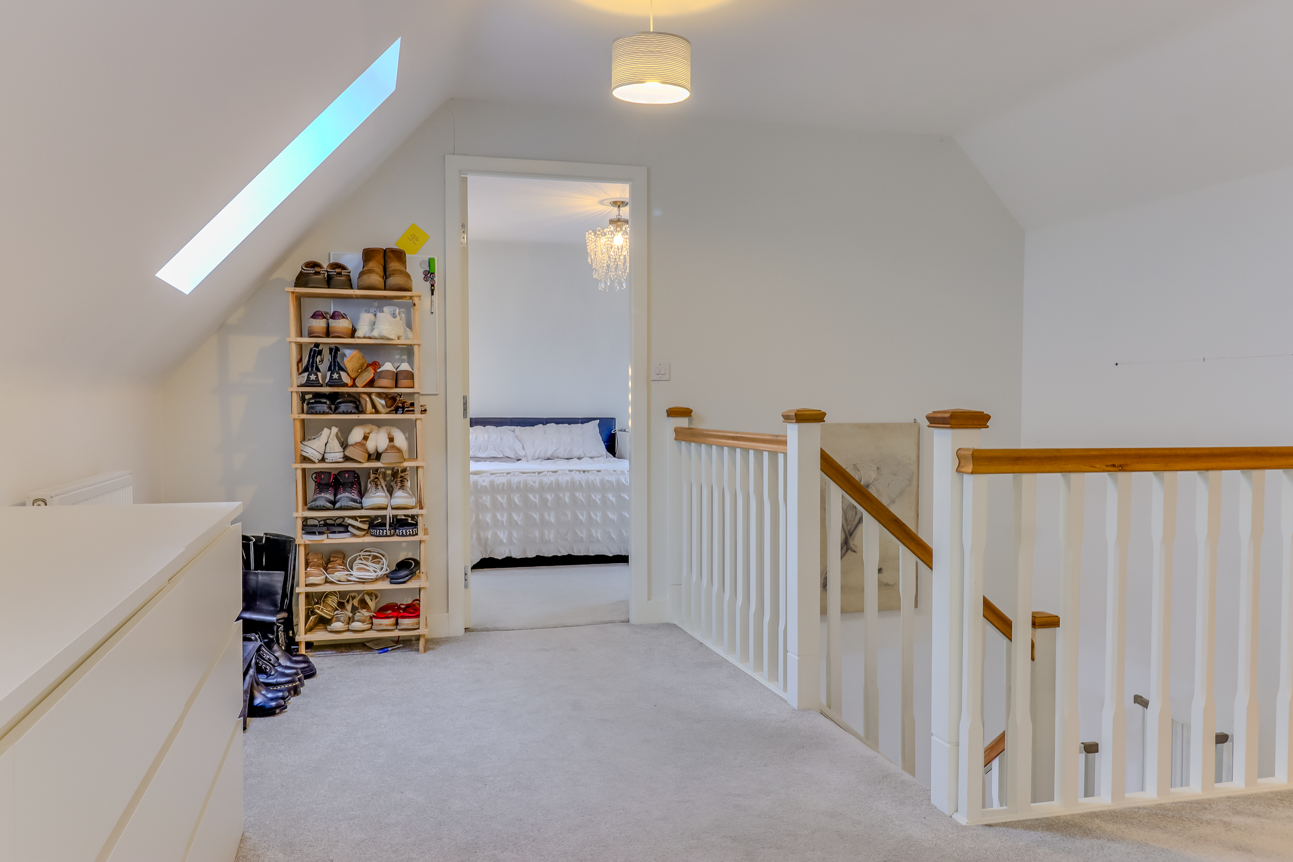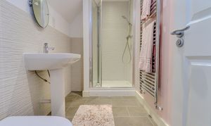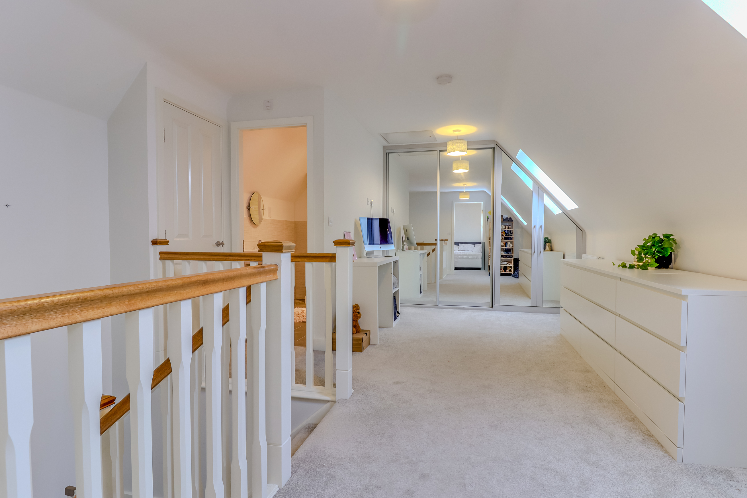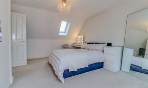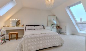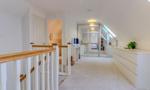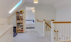 A staircase rises to the second floor which comprises a large feature landing which can be used as a reception space, featuring a run of built in mirrored wardrobes and extensive walk in eaves storage. Doors lead off to a sizeable double bedroom with Velux style windows and a shower room with double shower, low flush WC and pedestal wash hand basin.