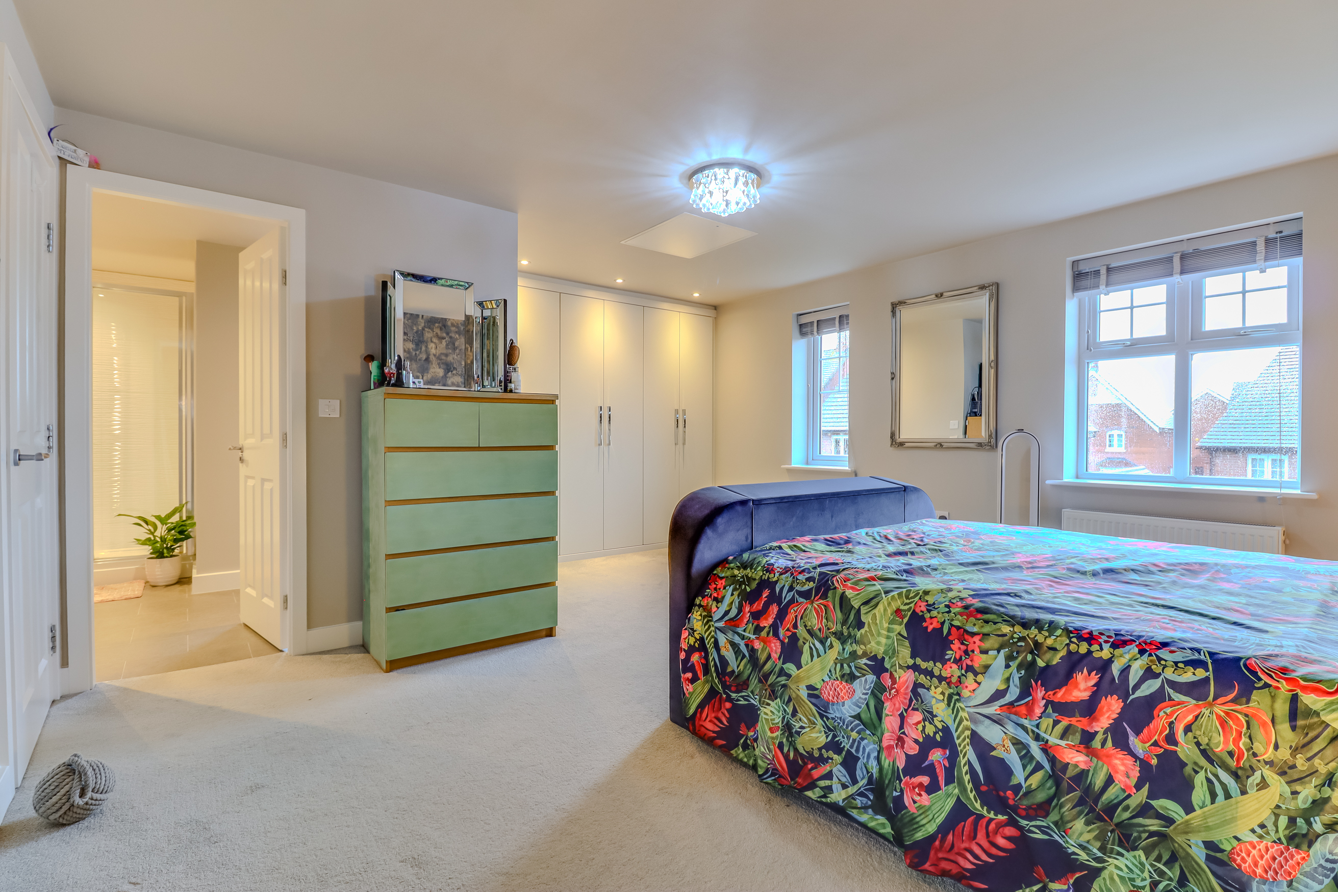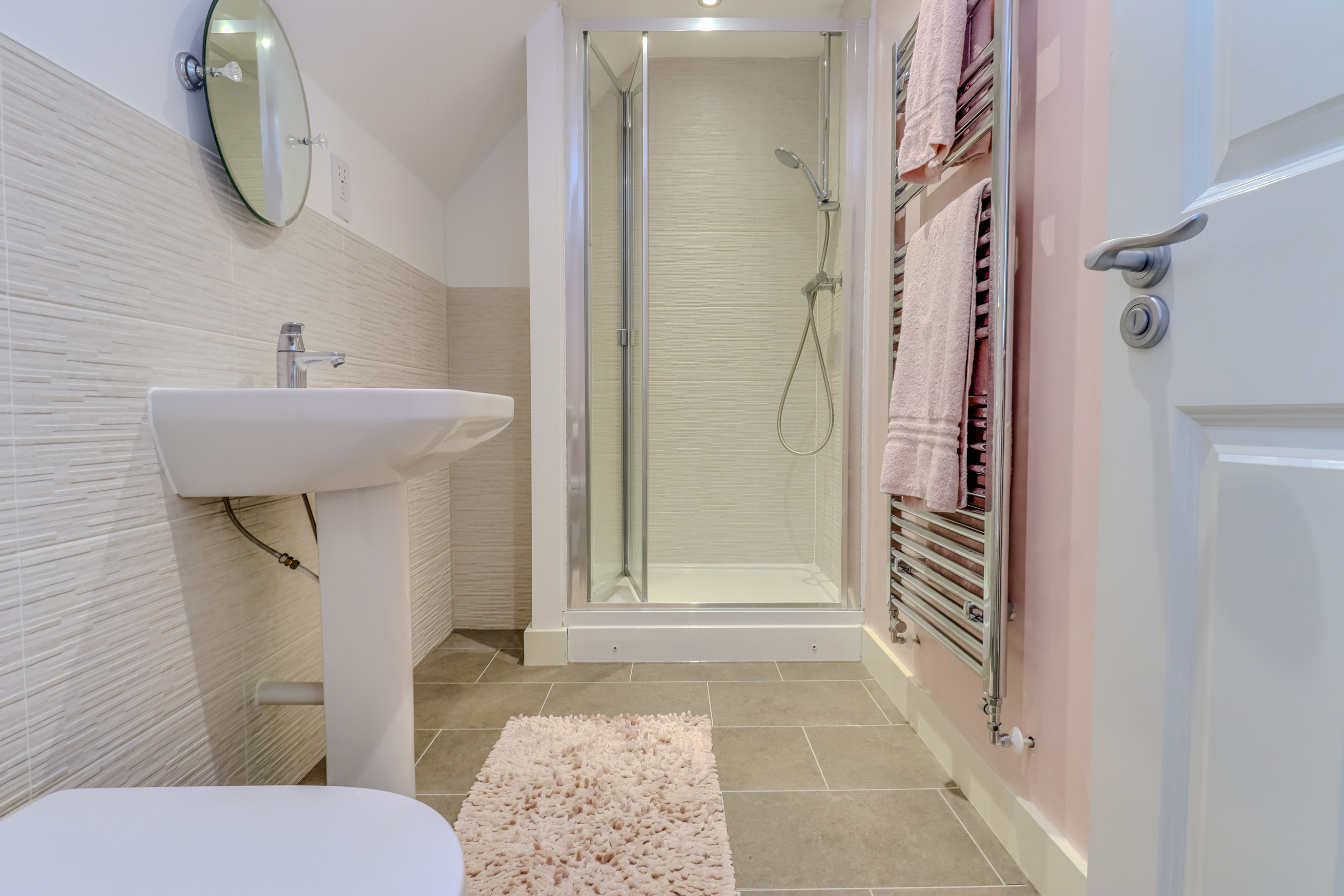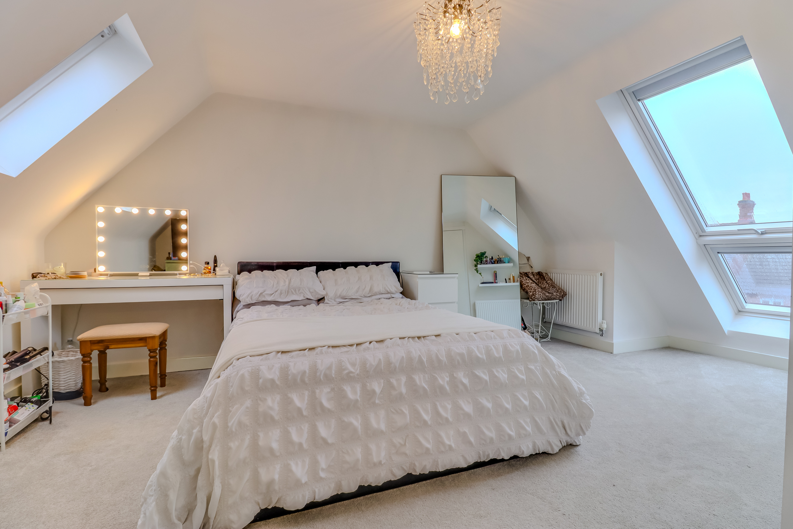 A staircase rises to the second floor which comprises a large feature landing which can be used as a reception space, featuring a run of built in mirrored wardrobes and extensive walk in eaves storage. Doors lead off to a sizeable double bedroom with Velux style windows and a shower room with double shower, low flush WC and pedestal wash hand basin.