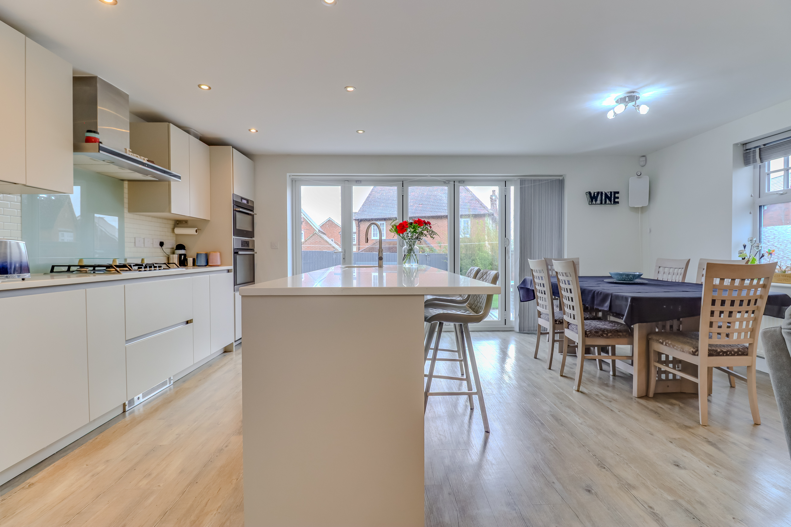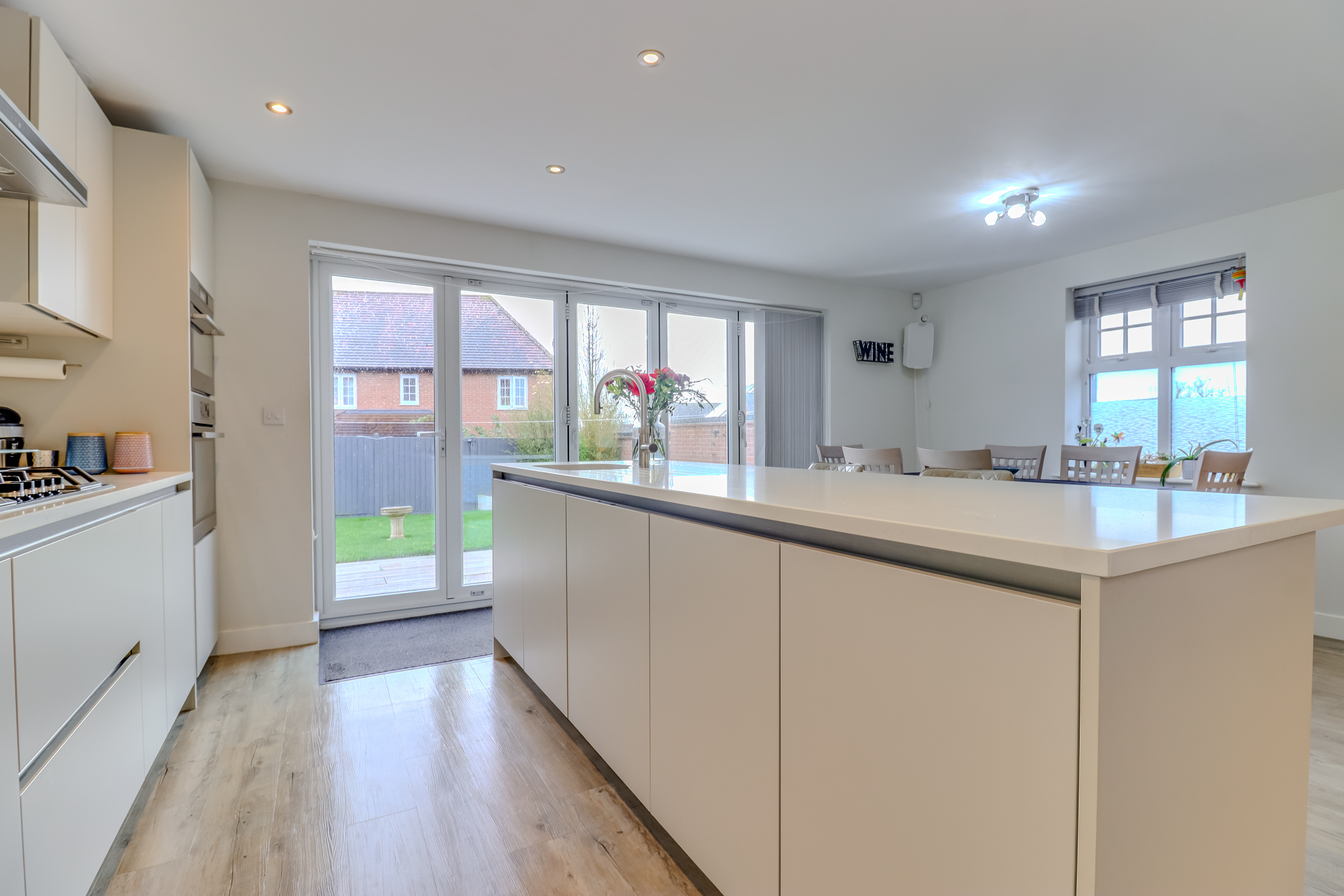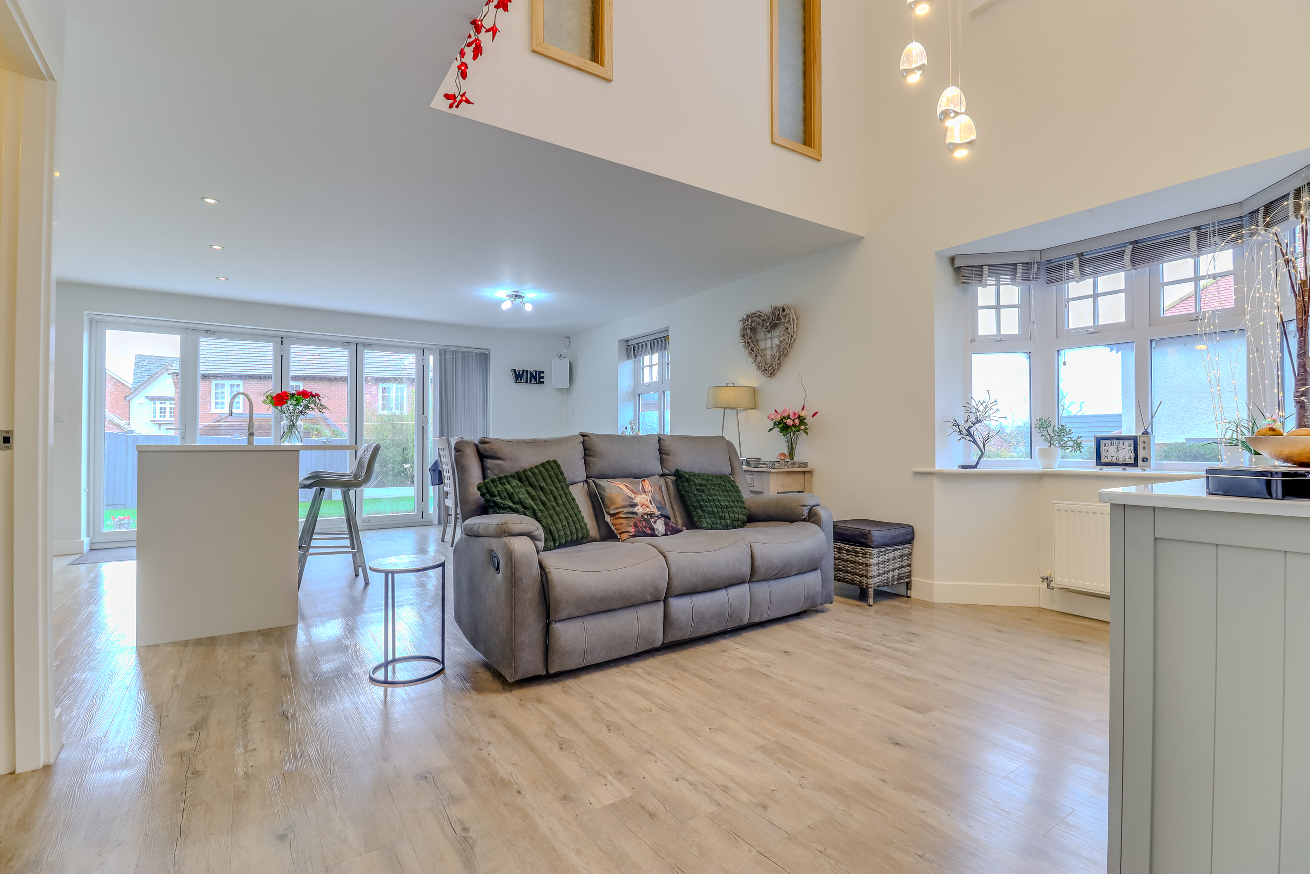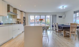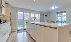 The internal accommodation comprises a spacious and welcoming entrance hall with an attractive staircase rising to the first floor and a downstairs WC off. There are double doors off to an extremely generous dual aspect lounge with French doors opening out to the covered patio. There is a second reception room, currently utilised as a bar but could be used as a study or play room. Undoubtedly the centrepiece of the home is the amazing living kitchen which is located to the rear of the property, with the kitchen area being fitted with a range of contemporary wall and base units with a Quartz worksurface, a large island unit providing extra storage and worktop space, bi-folding doors opening to a large south facing patio area and garden and a galleried living area with ample space for a seating area and a large dining table. Accessed via a door from the kitchen is a useful utility room with space for a washing machine and tumble dryer.