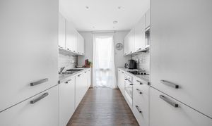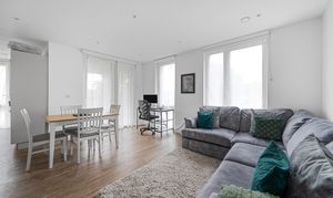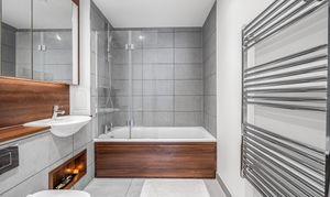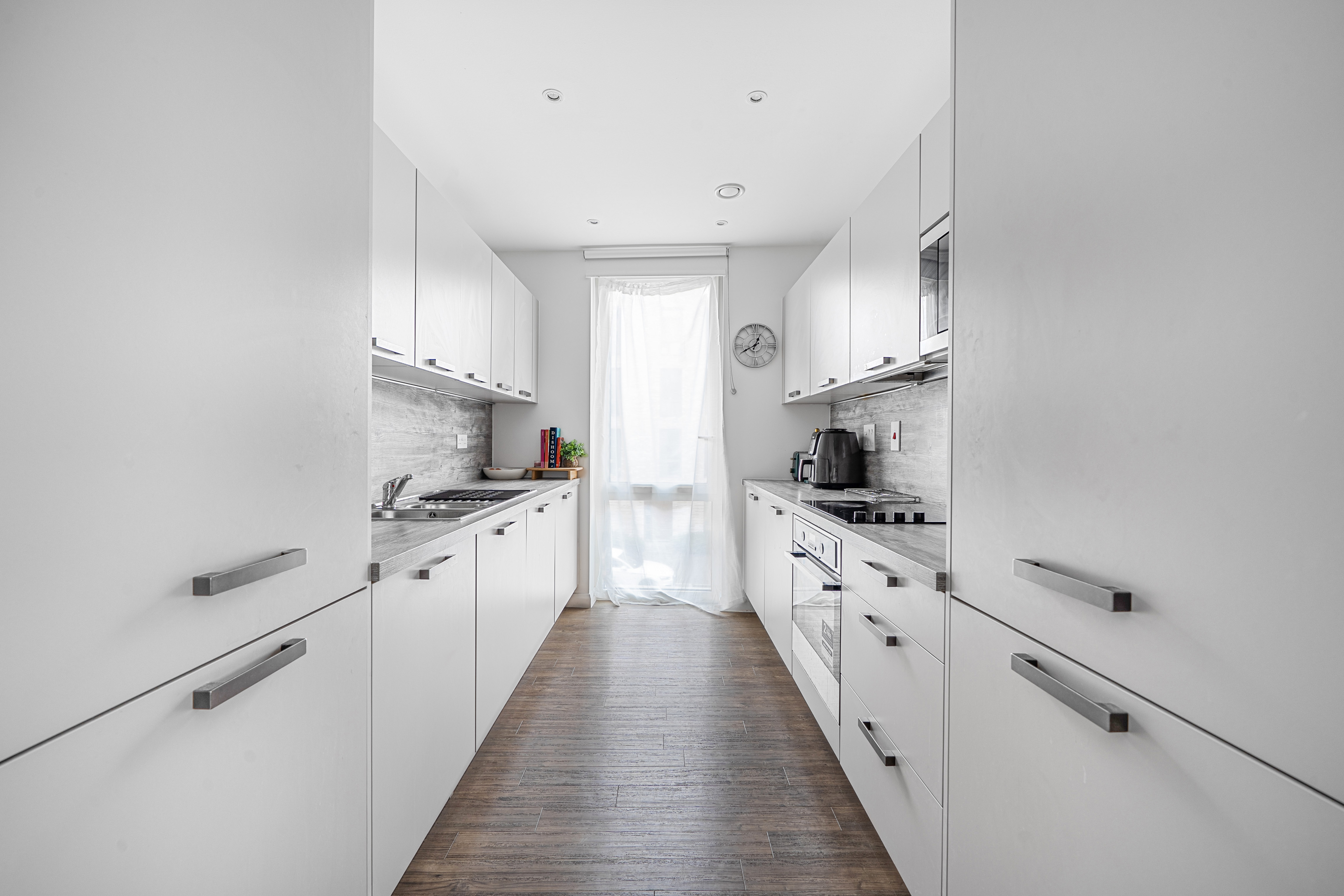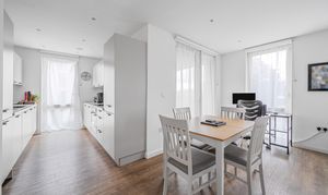 The recessed kitchen has been thoughtfully designed, providing sleek cabinetry, generous worktop space, and a full range of integrated appliances. The well-proportioned bedroom benefits from fitted wardrobes, while the contemporary bathroom boasts chic tiling, a bathtub with overhead shower, vanity unit with mirrored storage, and a heated towel rail.