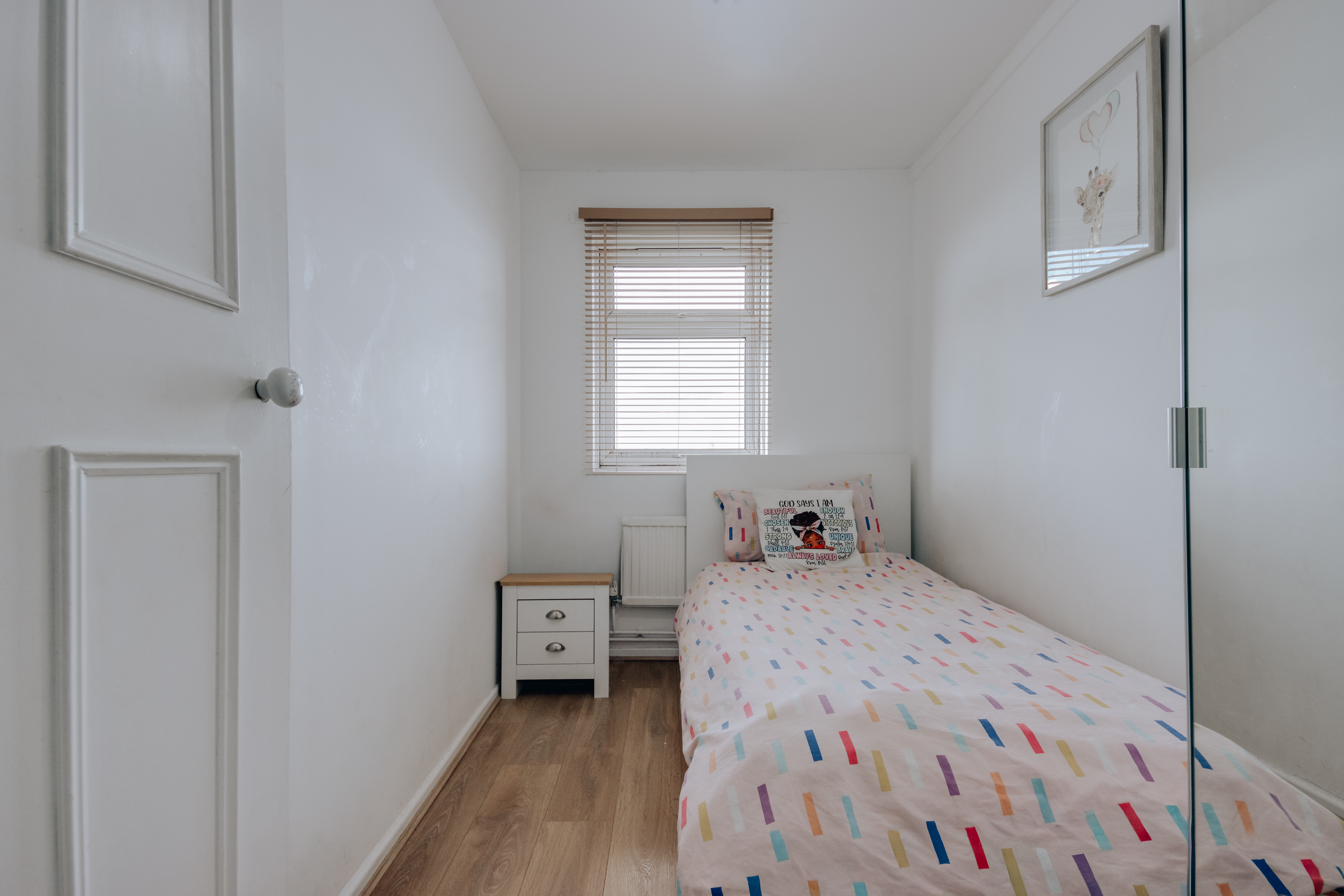The flat occupies the second floor and extends to over 800 sq.ft. From the communal hall, a private front door opens onto a well-proportioned entrance corridor with a separate WC and bathroom to the left, both partially tiled in grey with clean white above. Three store rooms lead off the hall; one has been converted into a home study, fitted with acoustic wall panelling to one side. The reception room runs to 16ft and faces the communal gardens through a large window. The kitchen sits directly off it, galley in form, with a gas hob and its own window to the outside. Three bedrooms complete the plan: two of similar proportion and one principal room measuring 13'3” by 12'9”, the sort of scale that reframes what a flat can be.