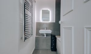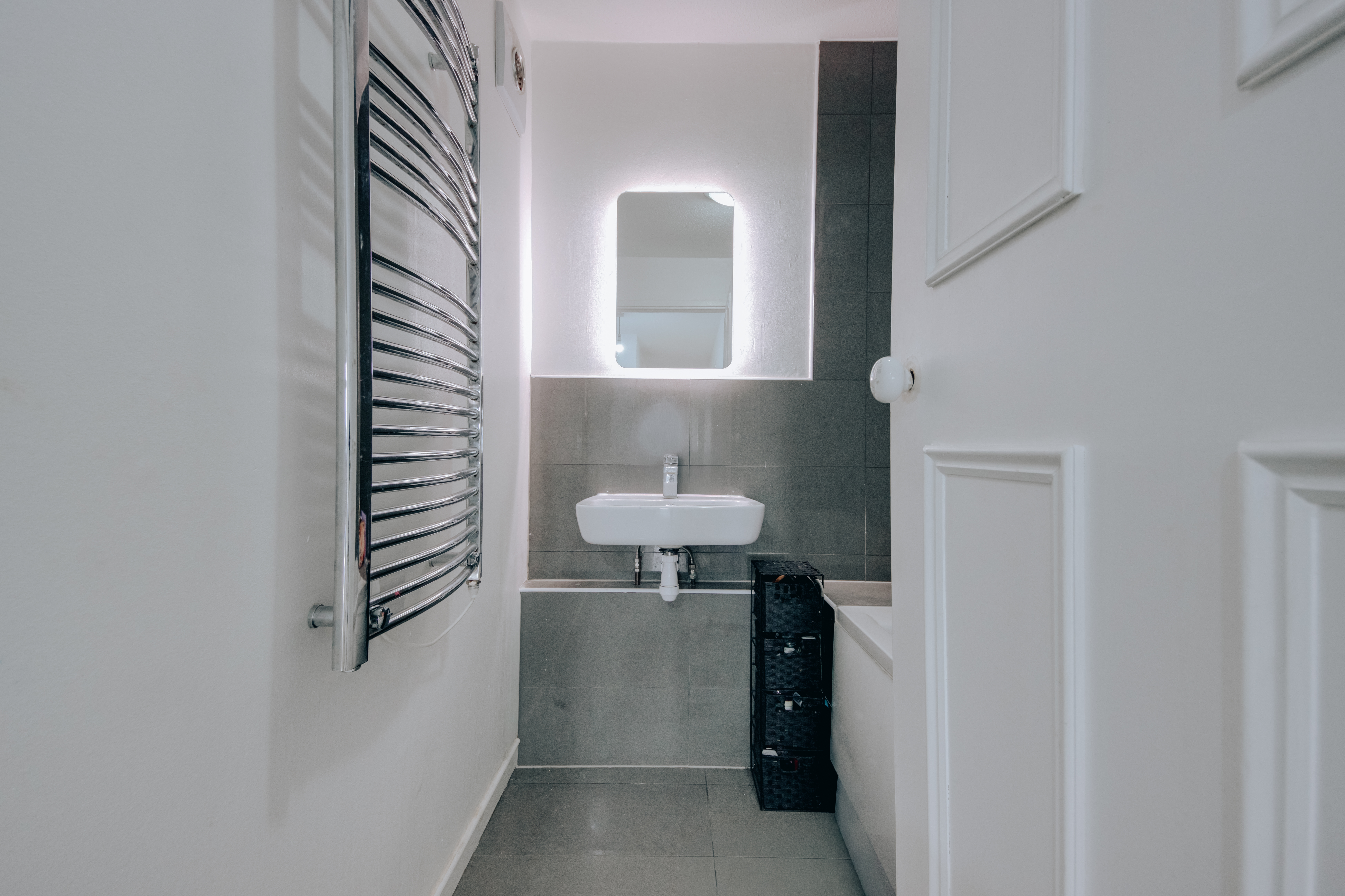 - Separate WC and bathroom, partially tiled in grey with white upper walls