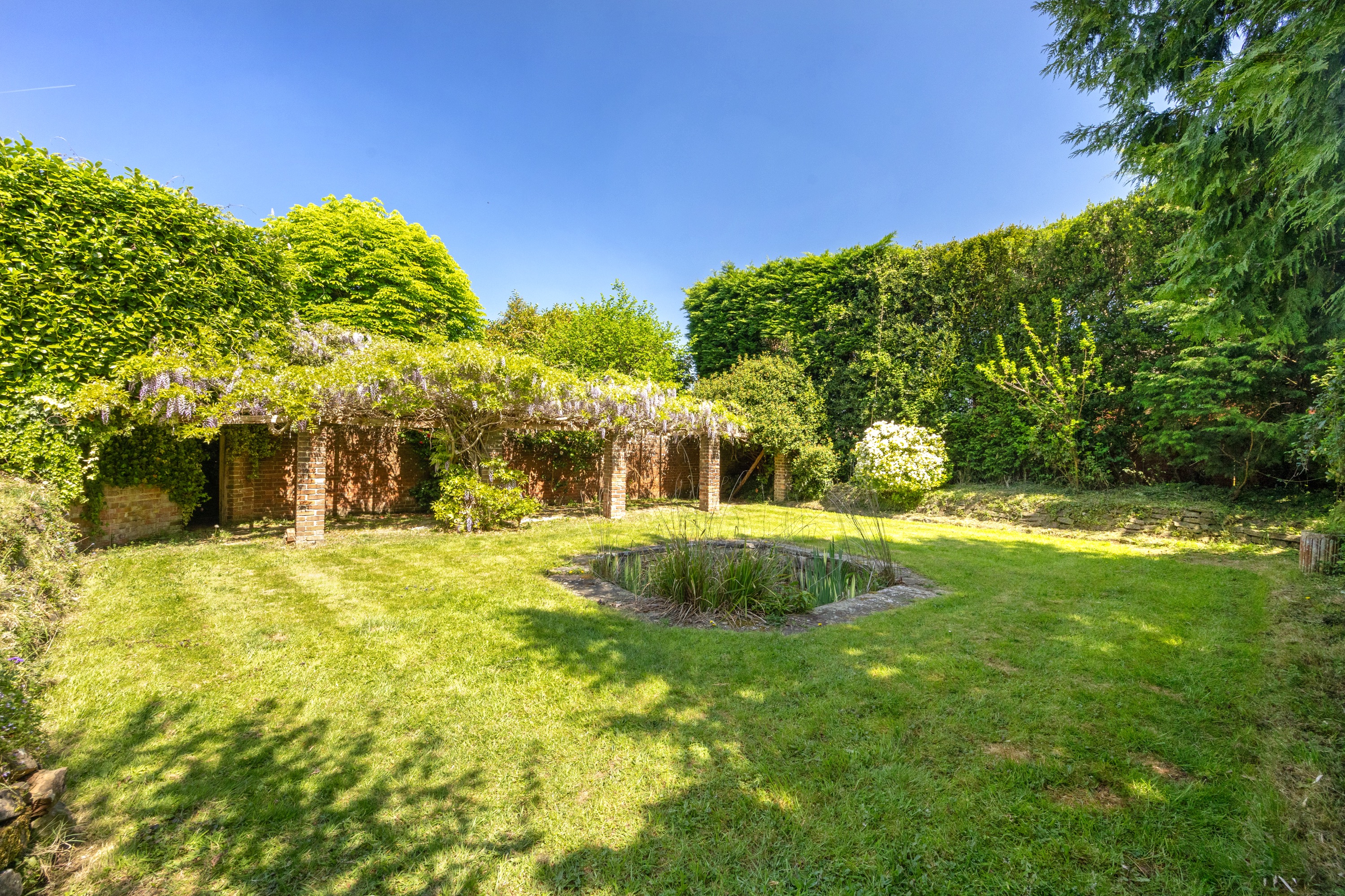 The property is approached by a sweeping driveway which provides space for several vehicles and leads to the double garage; which has up and over doors, power and lighting. The rear garden is a real feature and is of superb proportions and is mainly laid to lawn. There is a patio terrace area at the rear of the property which is ideal for outdoor dining and a further gravel area where you can enjoy afternoon and evening sunsets, there is also a ornate pond and a further brick built pergola with growing wisteria, which is perfect place to capture some shade.