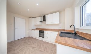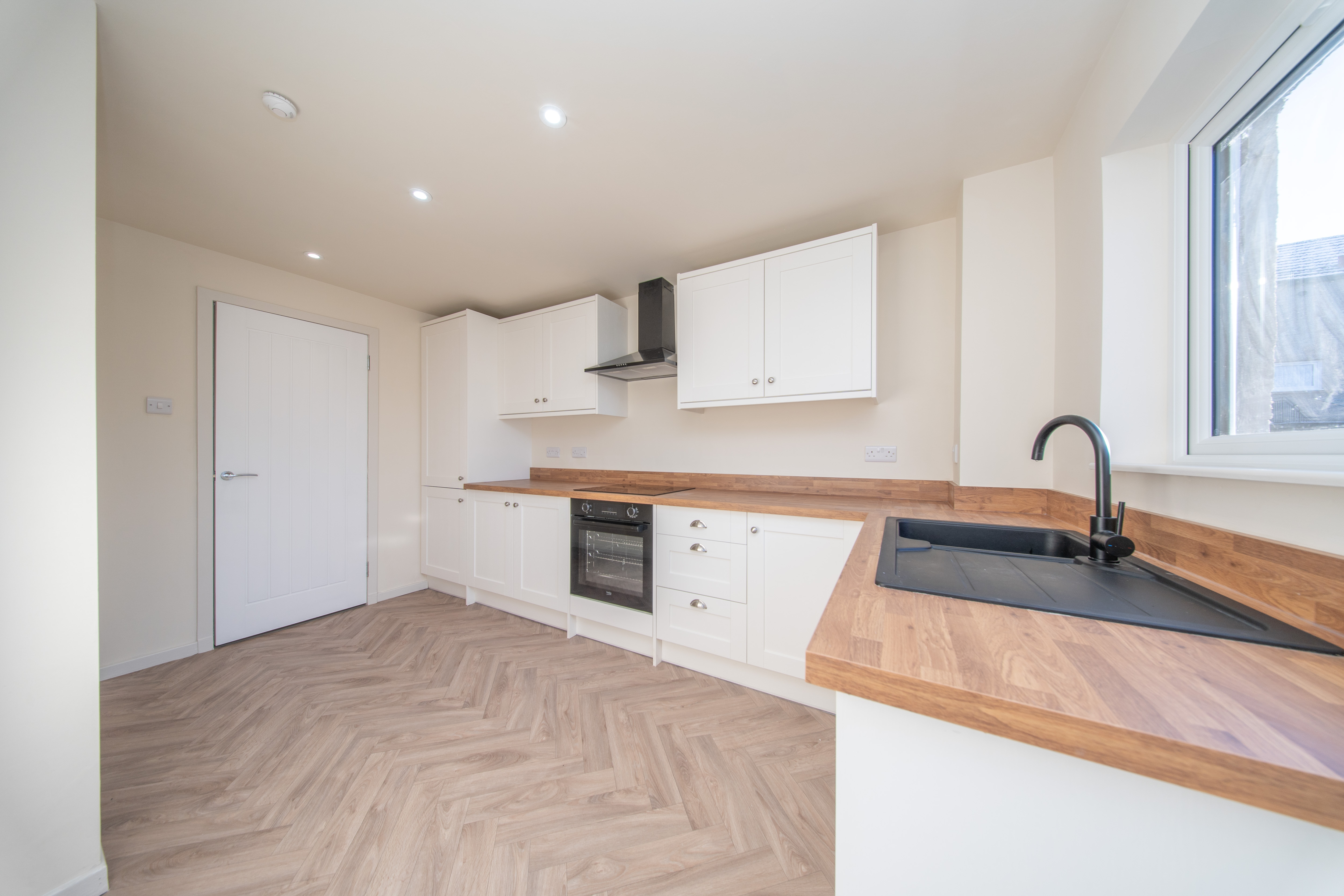 This contemporary kitchen combines style with practicality, offering a well designed layout with a range of white wall and base units, complemented by wood effect worktops and matching upstands. Neutral painted walls and wood effect vinyl flooring enhance the clean, modern finish. The kitchen includes an under counter oven, four ring electric hob, black extractor hood, and integrated fridge freezer and washing machine. A black sink with drainer and mixer tap is positioned beneath a rear facing window, allowing natural light to brighten the space. A half glazed upvc door provides convenient access to the garden. Additional features include downlights, power points, a radiator, heat detector, and a generous under stair storage cupboard.