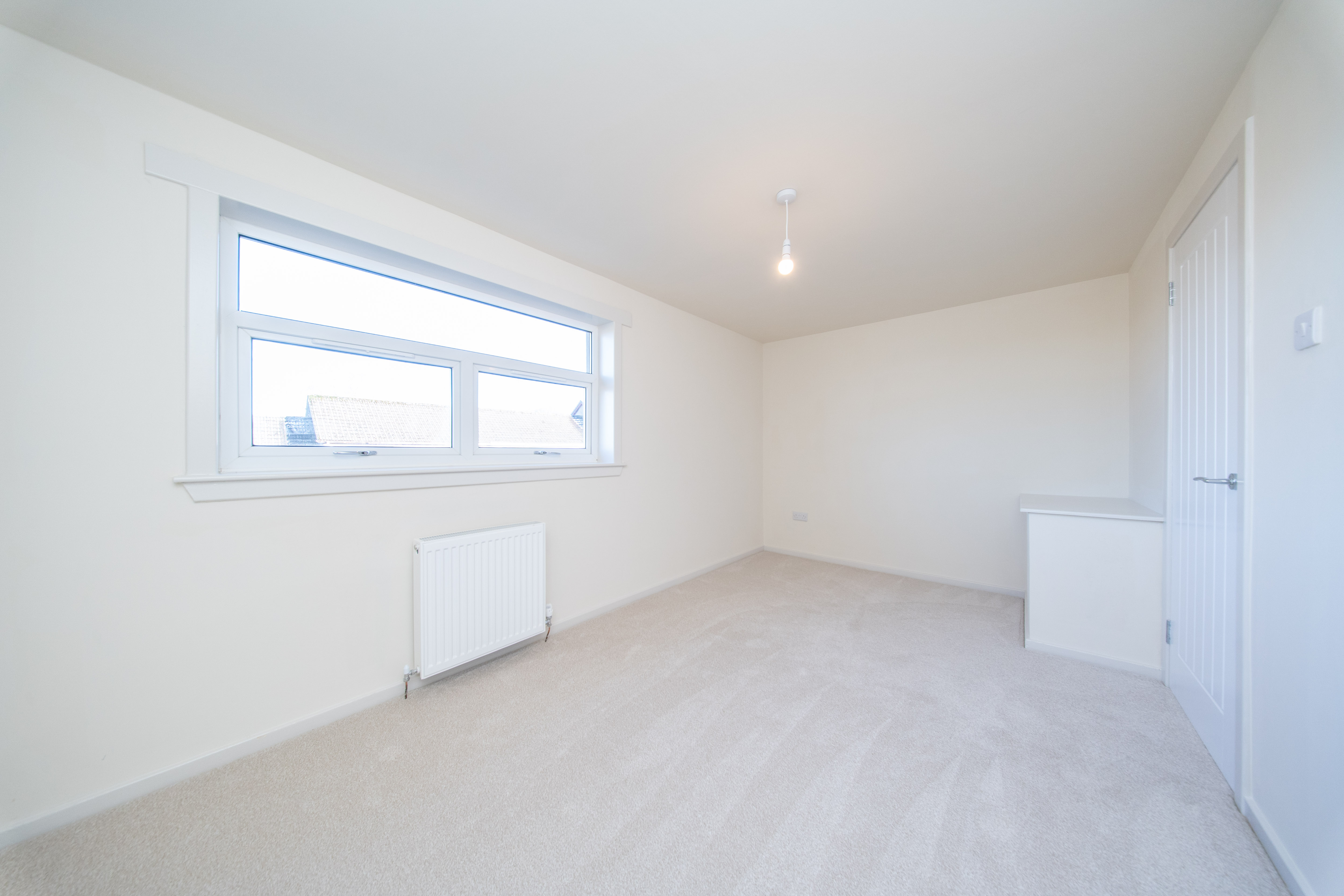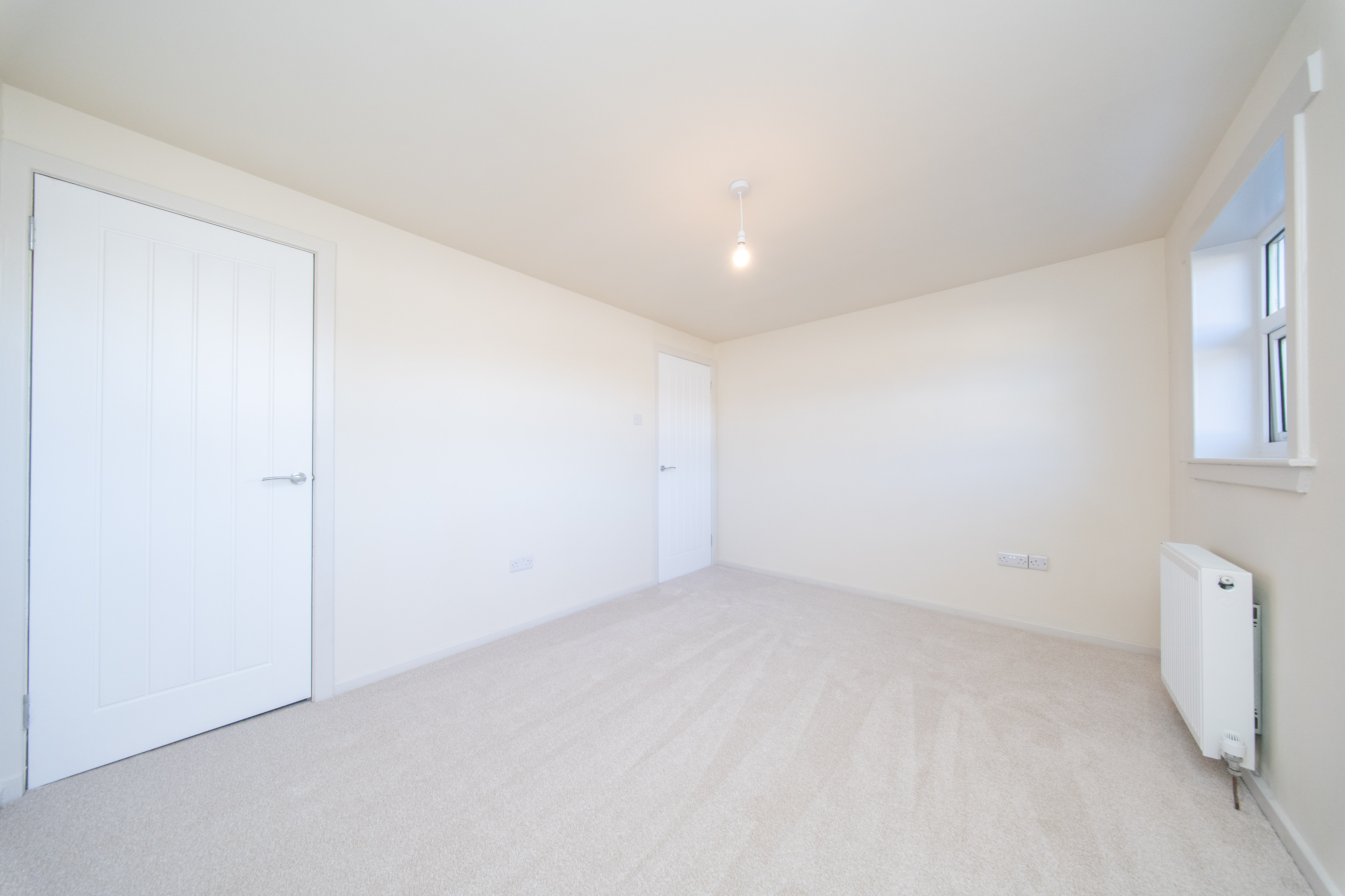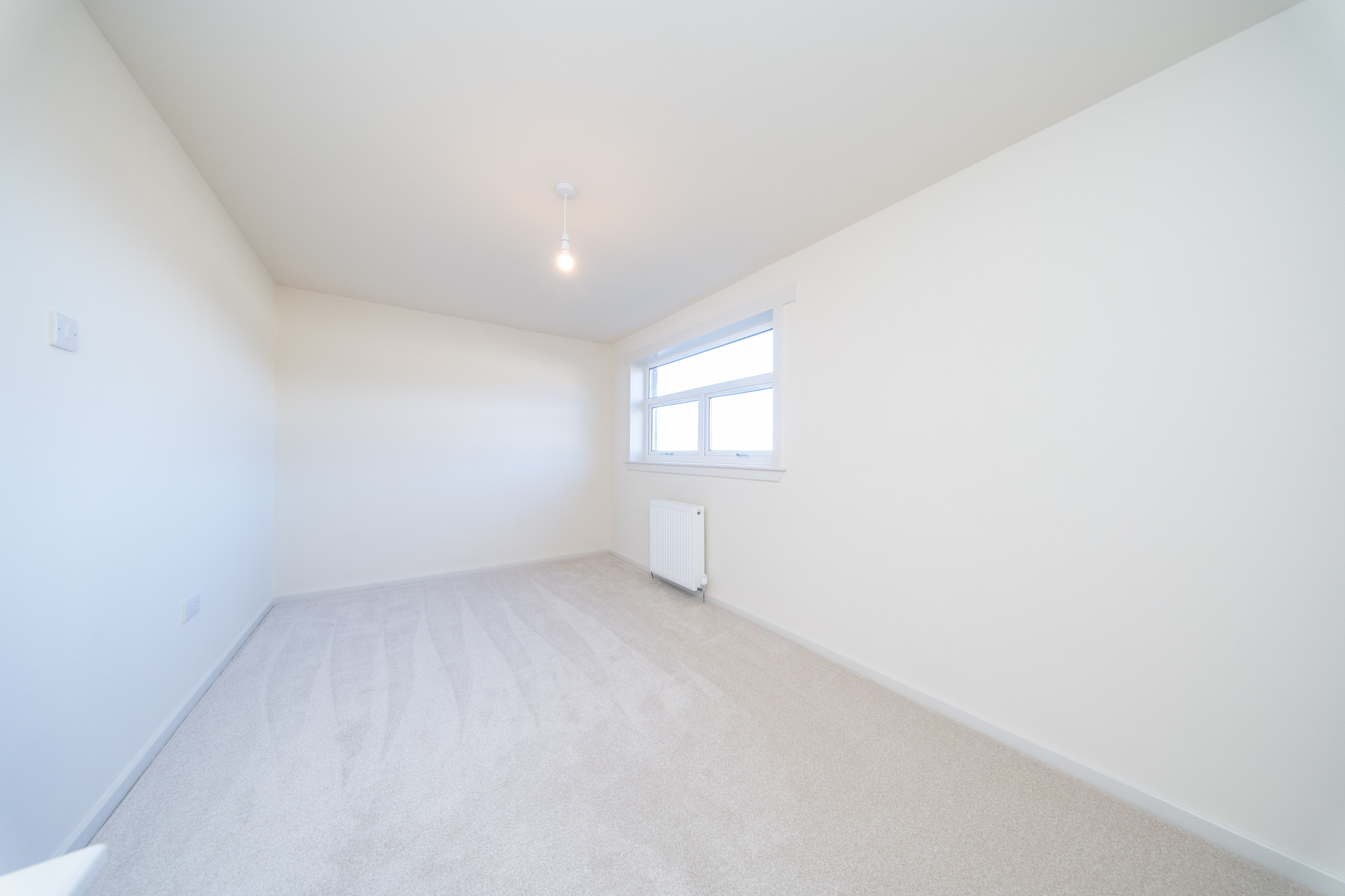 This thoughtfully appointed third bedroom features magnolia painted walls and soft carpeted flooring. A rear facing window floods the room with natural light, while practical touches such as a radiator, ceiling light, and conveniently positioned power points ensure both comfort and functionality.