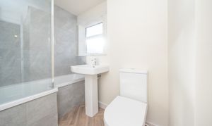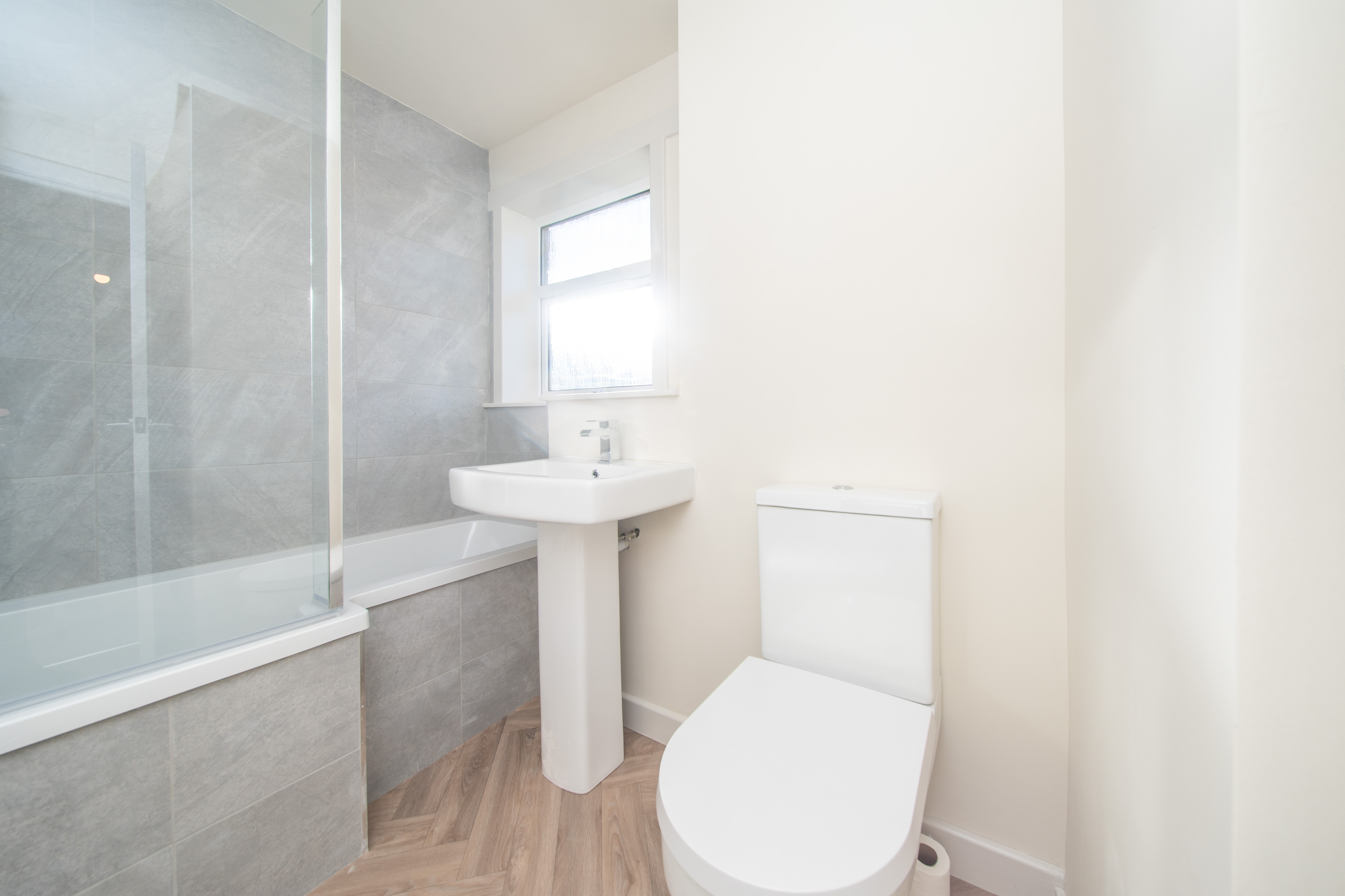 This stylish bathroom is finished with neutral painted walls and grey wall tiles, beautifully contrasted by wood effect vinyl flooring. A rear facing window fills the space with natural light, while a ceiling light adds extra brightness. The contemporary suite includes a bathtub with a mains waterfall shower and handheld attachment, a pedestal sink, and a close coupled toilet. The room is completed with a sleek chrome towel radiator, combining modern style with practical comfort.