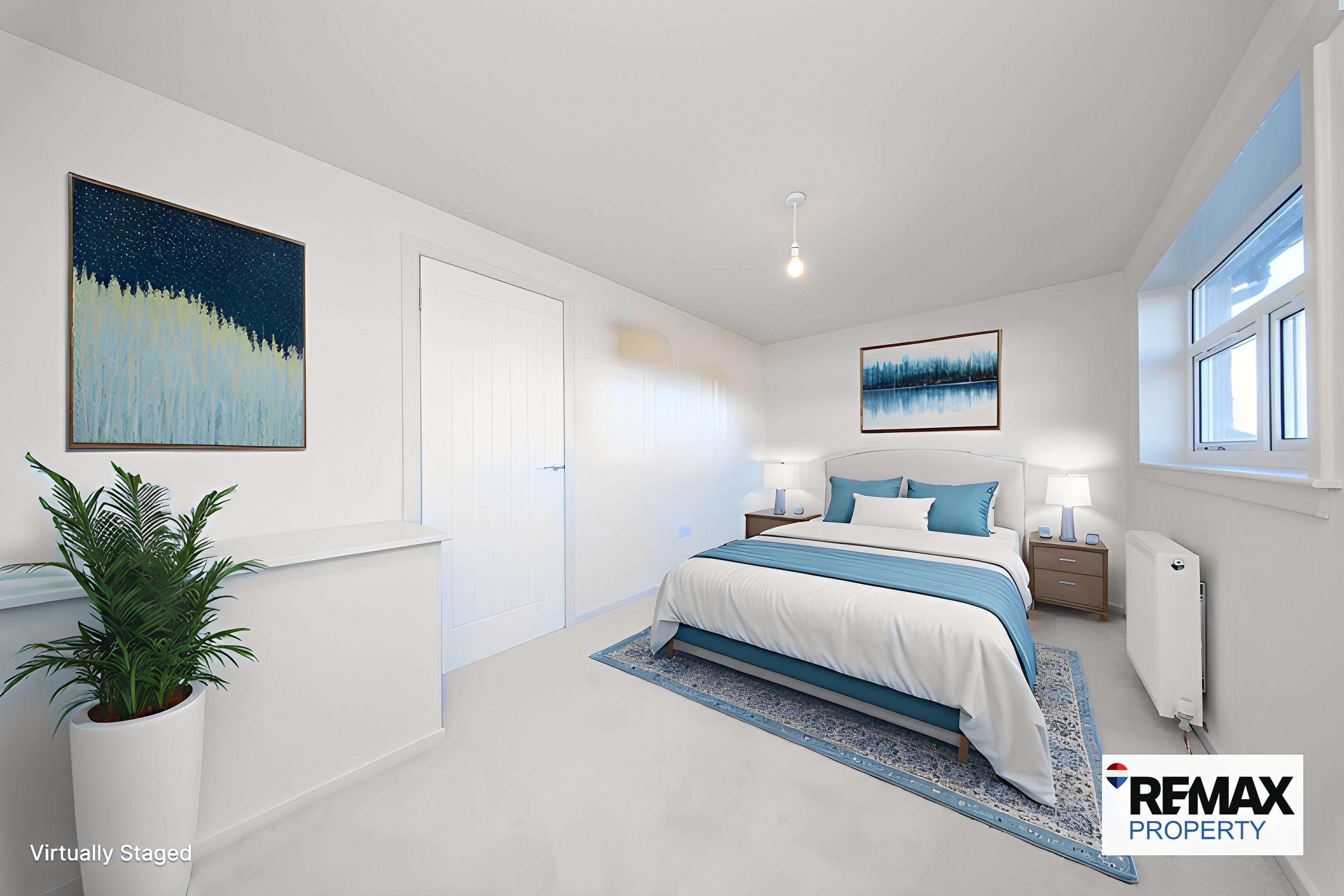 This second generous bedroom is finished with neutral painted walls and soft carpeted flooring, creating a comfortable and versatile space. A front facing window floods the room with natural light, complemented by a ceiling light that enhances the bright and welcoming atmosphere. Power points and a radiator complete the room.