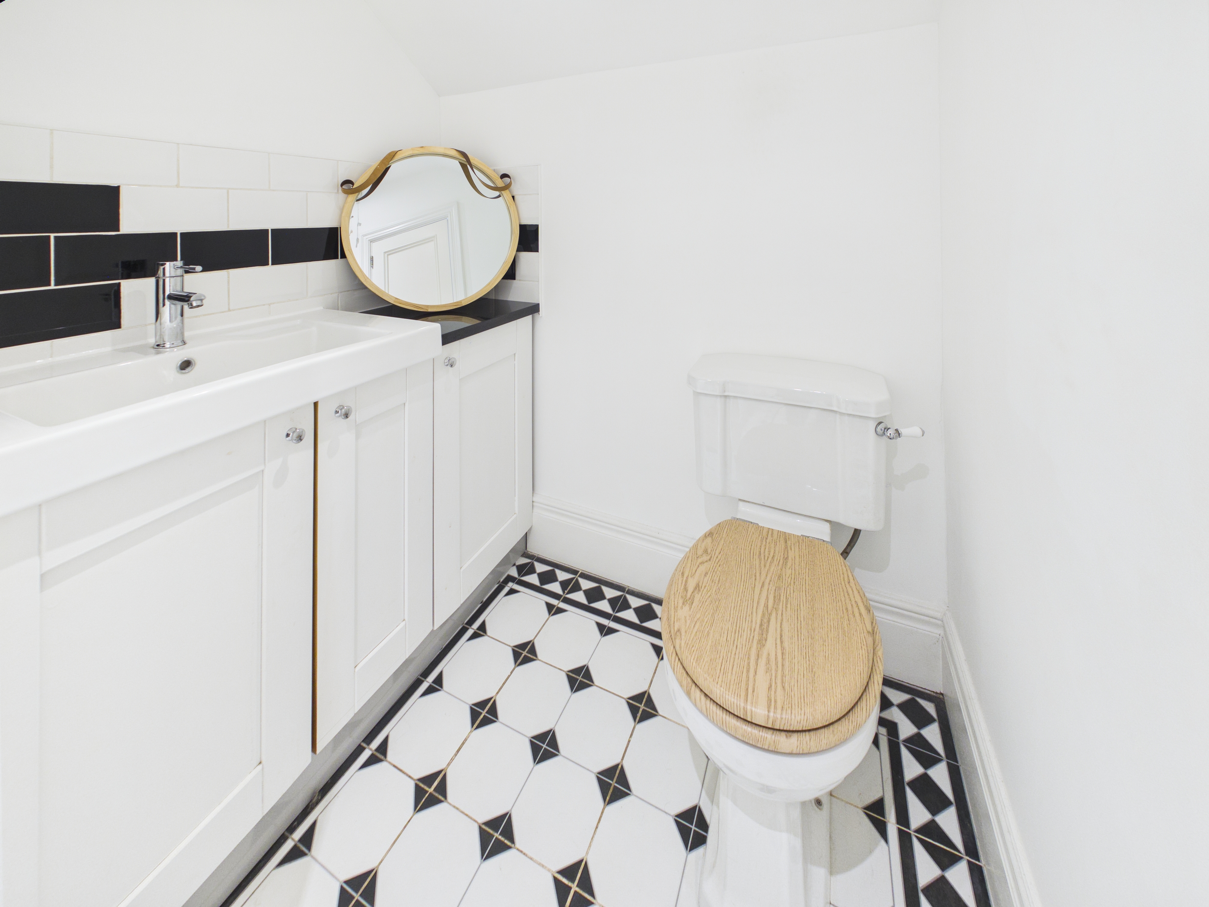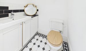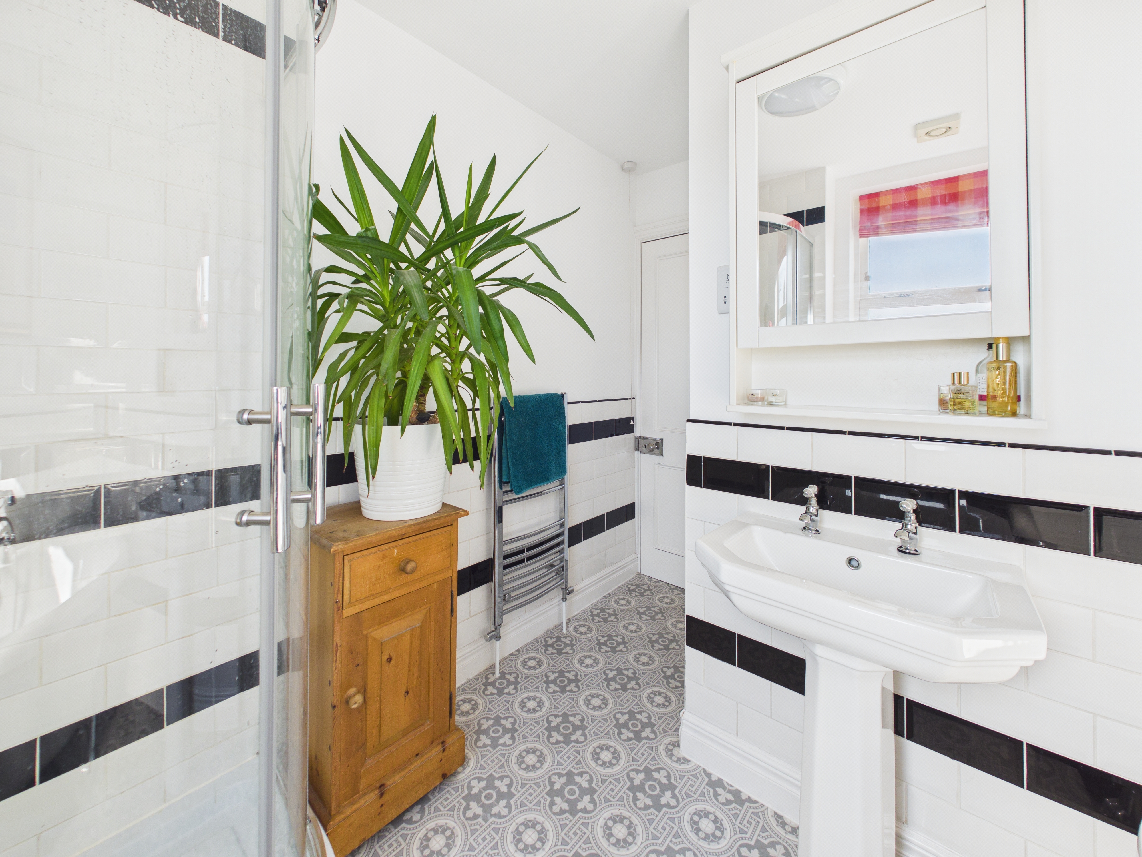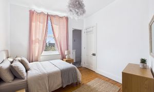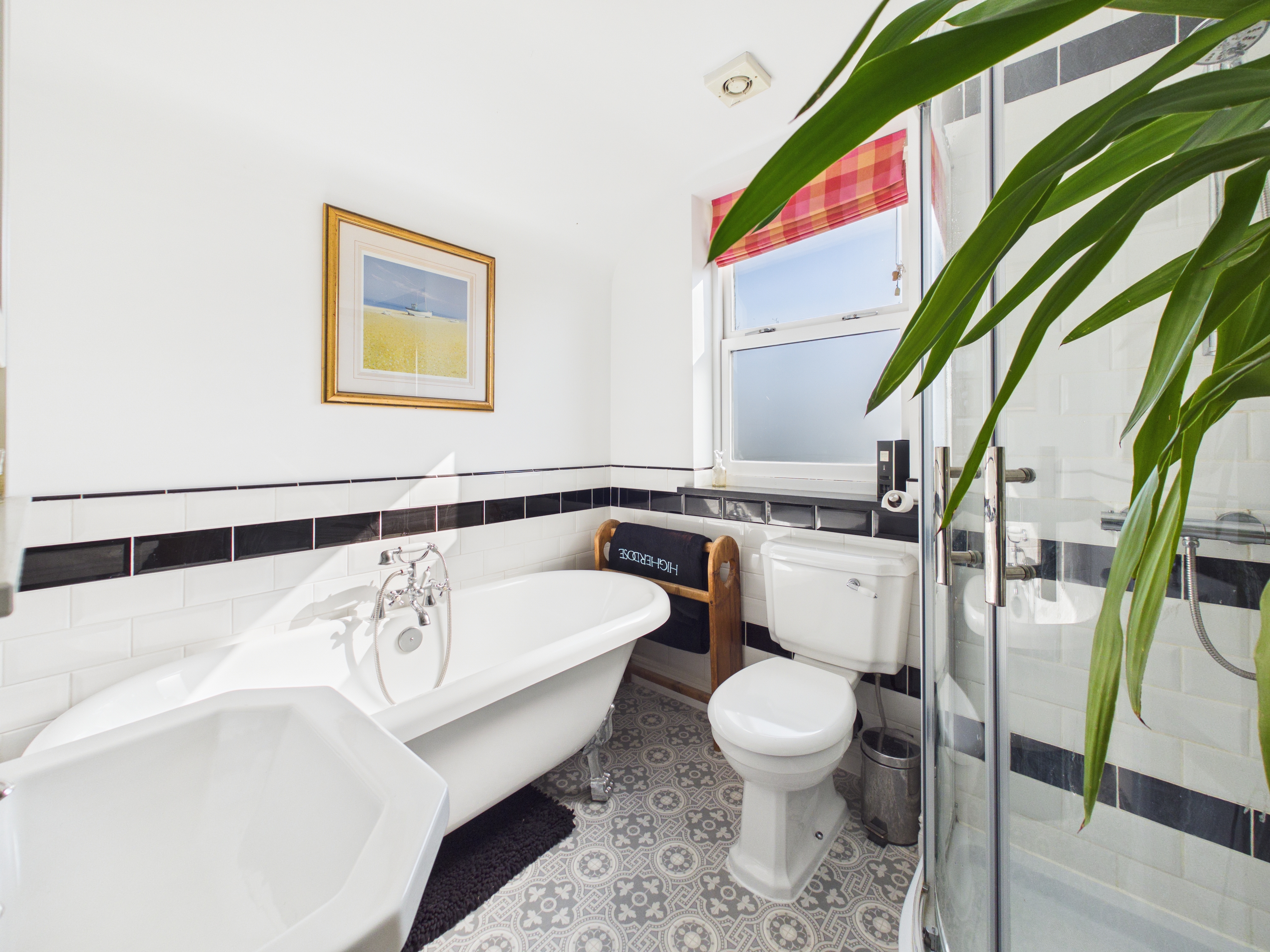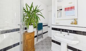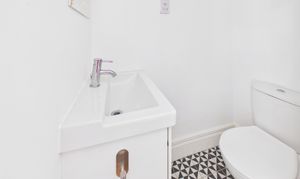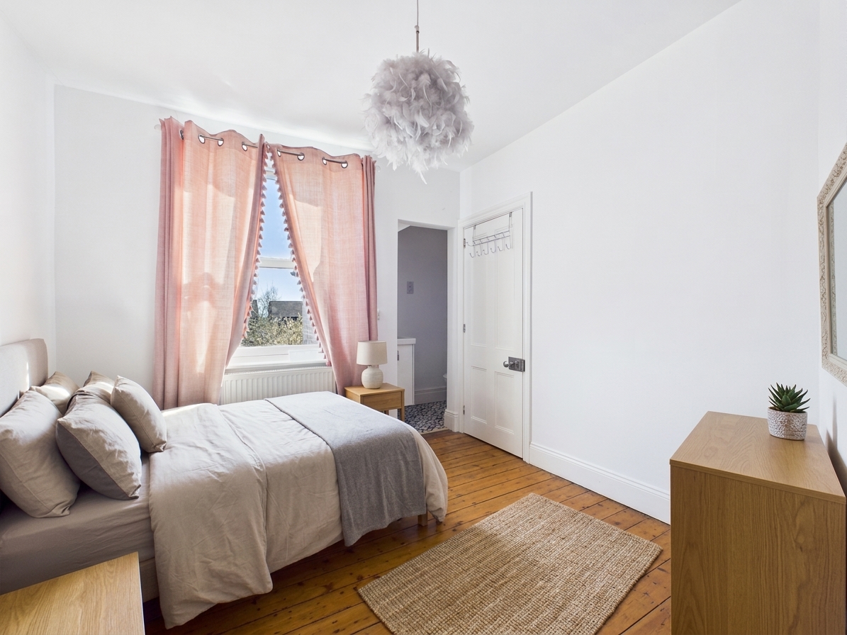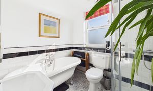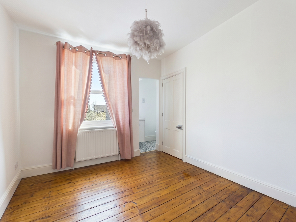 The first floor hosts two well-proportioned double bedrooms, both benefiting from exposed wooden floorboards. The rear bedroom enjoys the added convenience of its own WC and wash basin, whilst a bright and spacious family bathroom serves this level. It is fitted with a four-piece suite, including a roll-top bath and corner shower, complemented by contemporary fixtures and a sleek monochrome subway-tiled splashback.